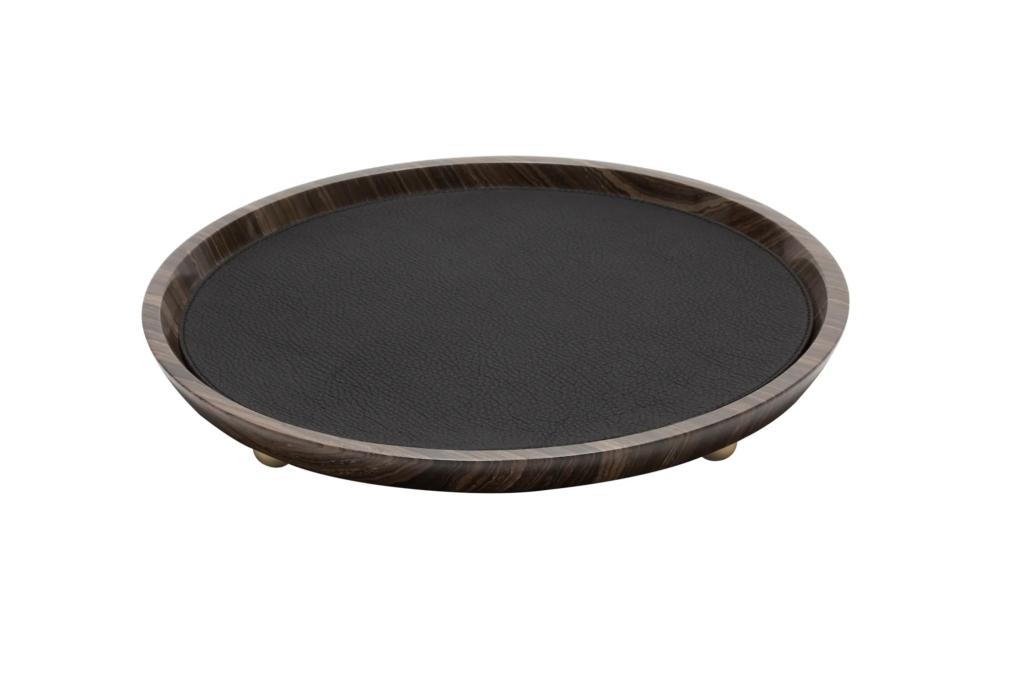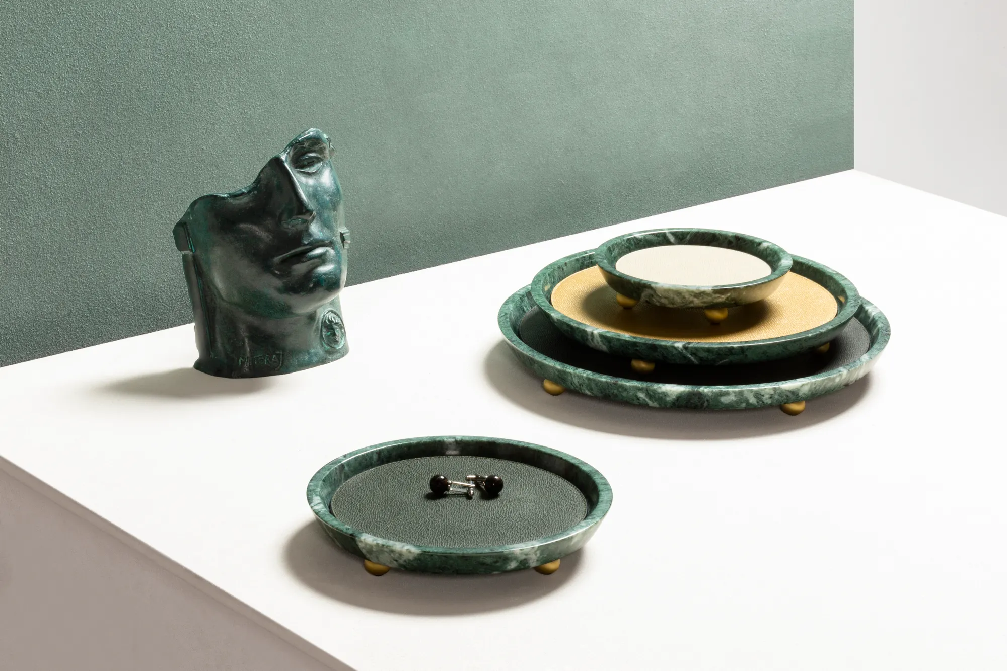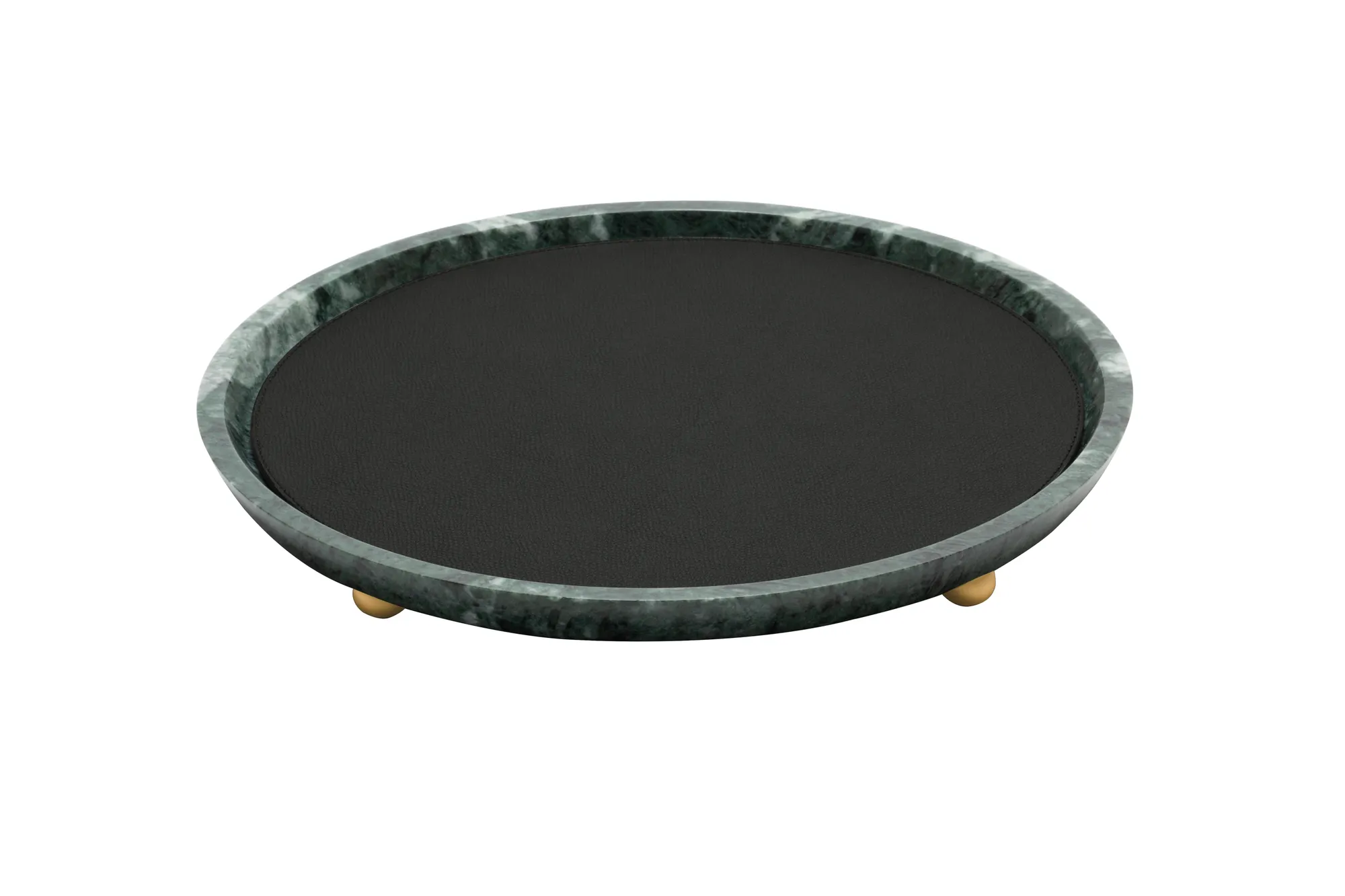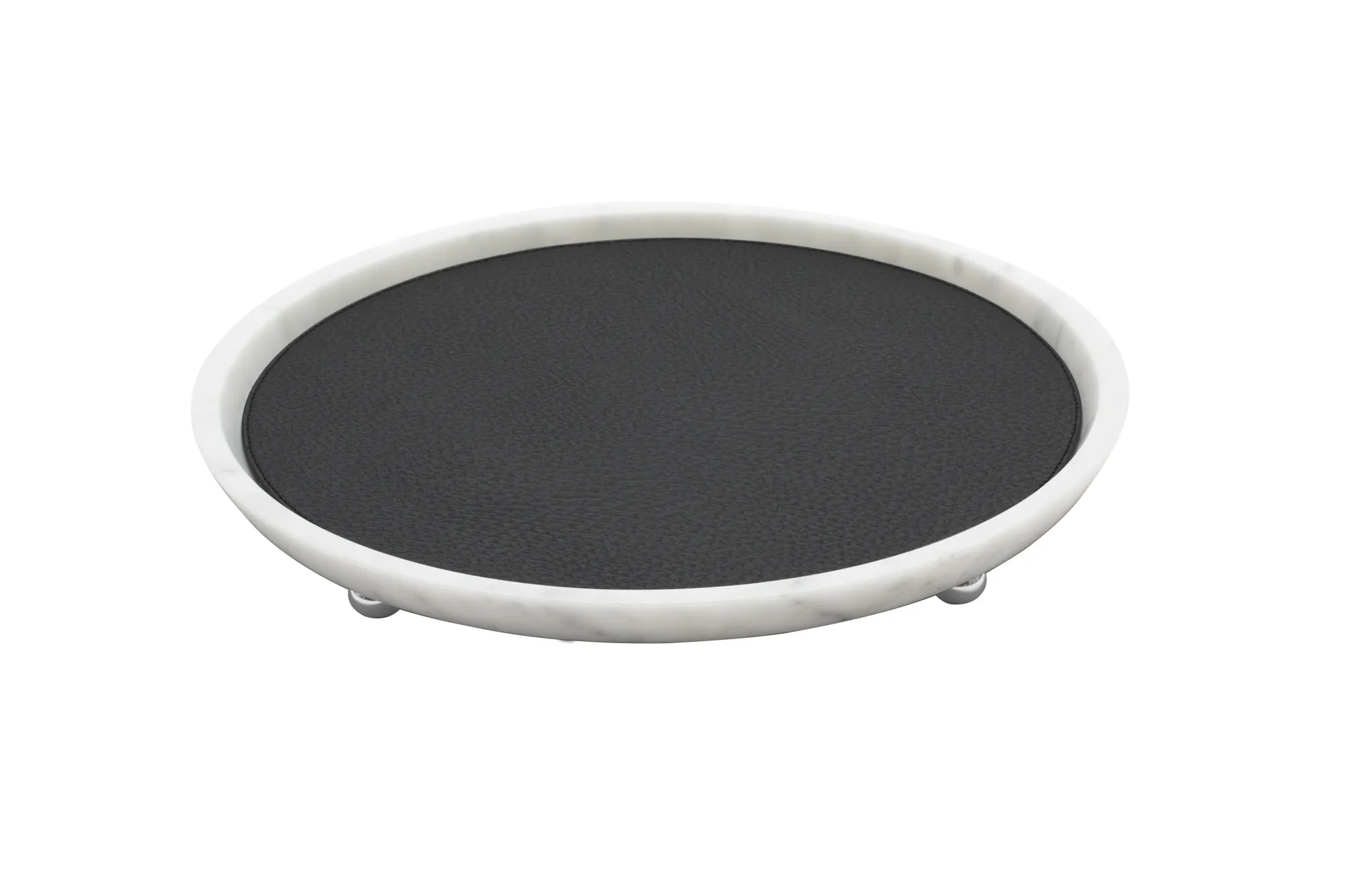 Marble structure with metal rounded feet available in different finishes. Provided with removable leather placemat.