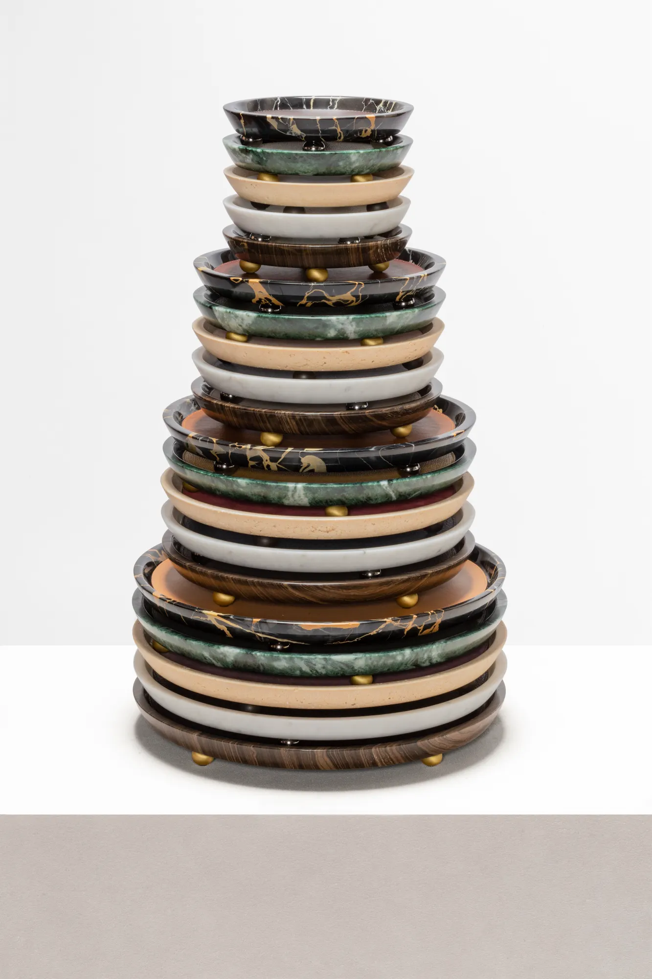 Marble structure with metal rounded feet available in different finishes. Provided with removable leather placemat.