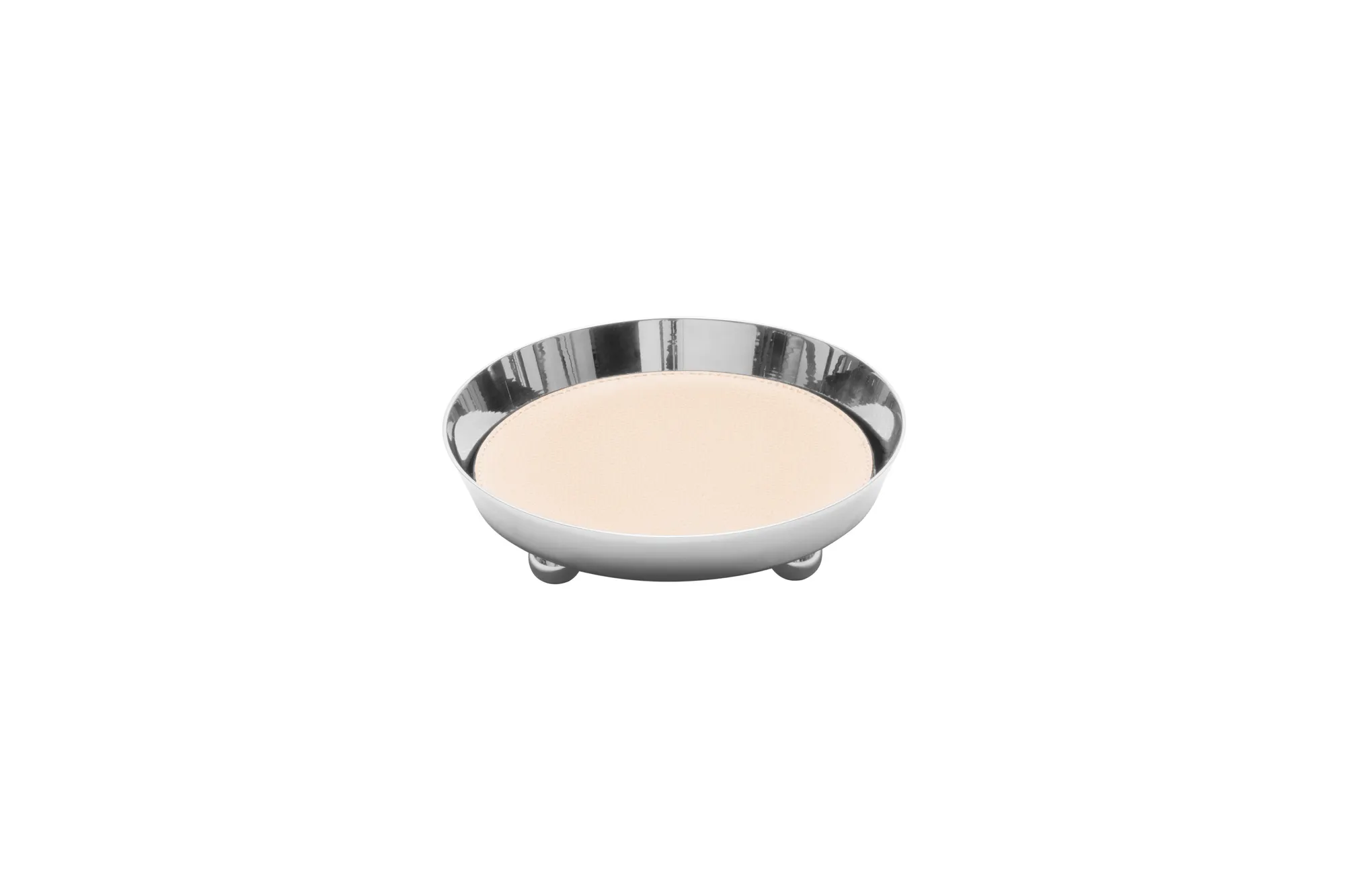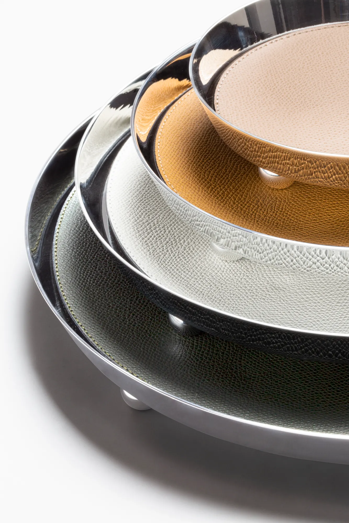 Metal structure with metal rounded feet available in different finishes. Provided with removable leather placemat.