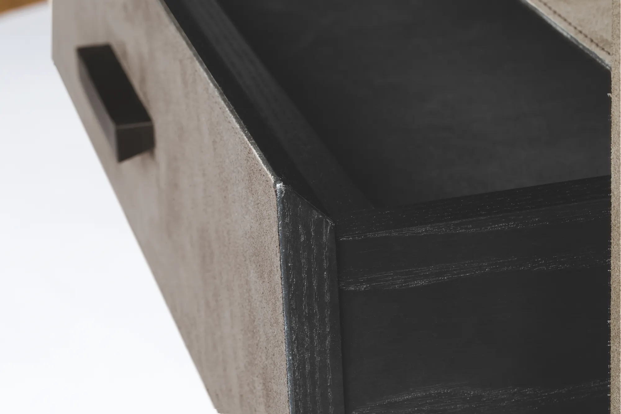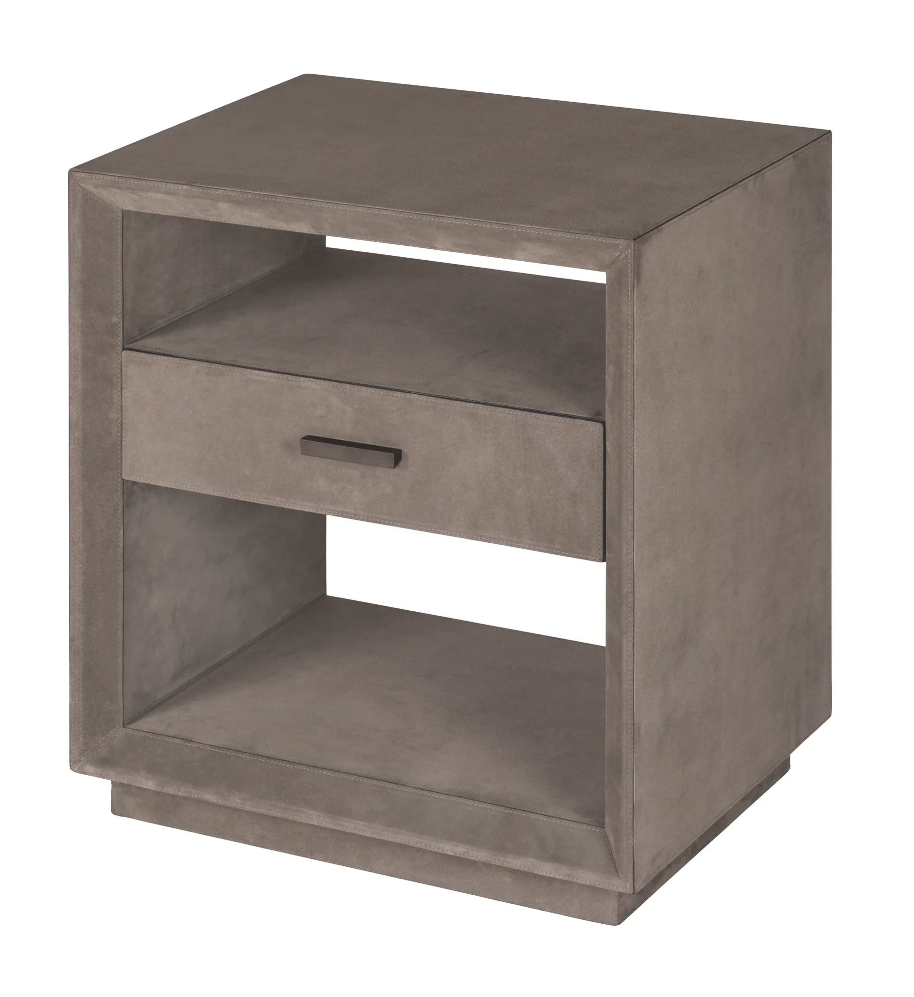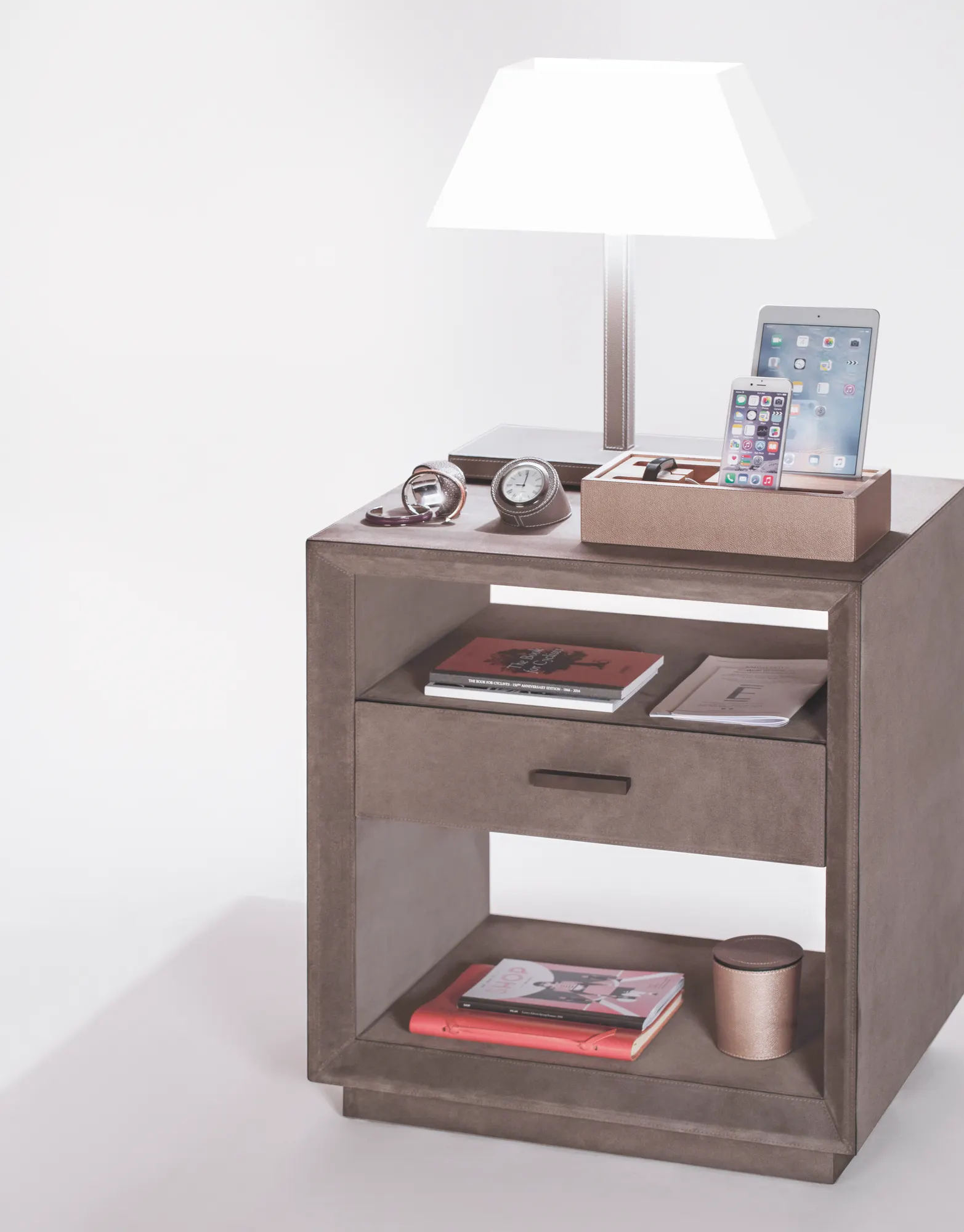 Leather covered wood cabinet. Special soft-closing drawer with removable suede lining. Bronze handle.