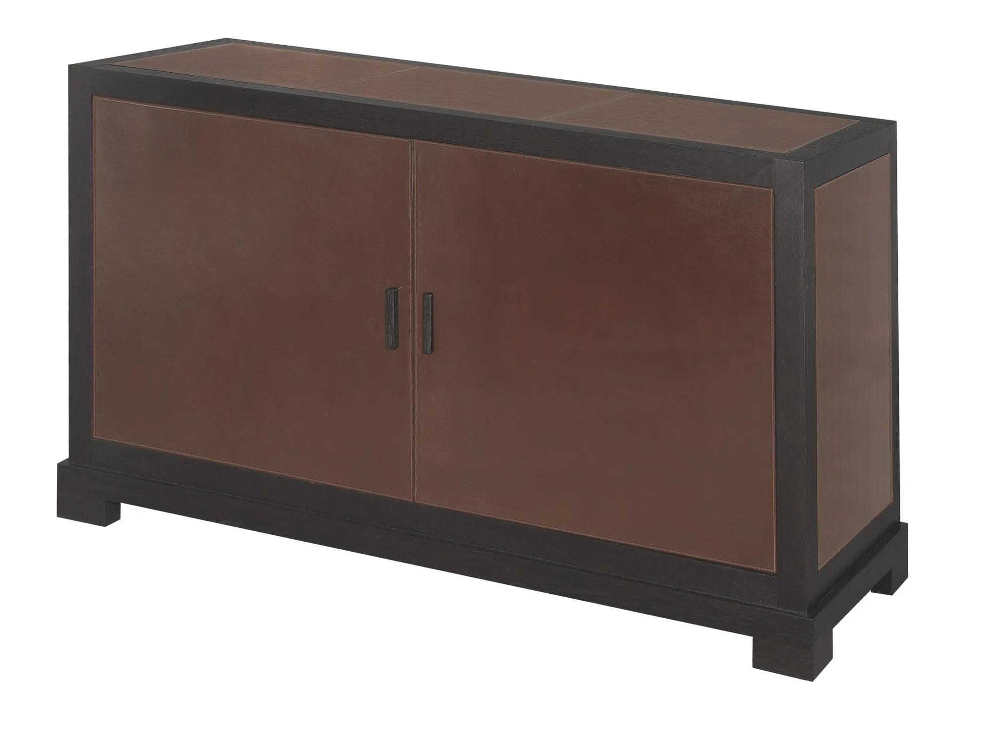 Leather covered oak cabinet (available in three finishes) decorated with inlaid leather. Leather-covered wood structure. Inner compartment with shelf. Special soft closing drawers and doors with push-pull opening system and inner suede lining.
