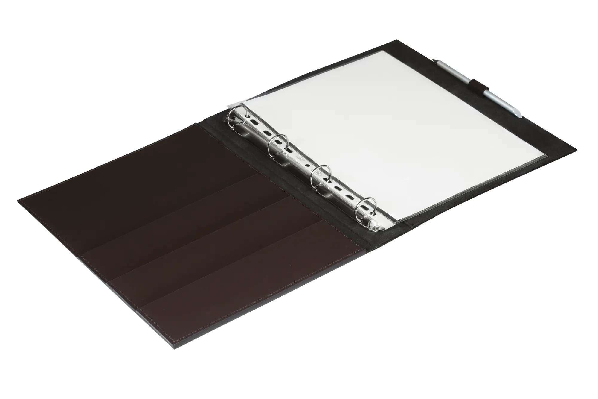 Finest regenerated leather structure with water-resistant and UV-resistant finish. Provided with pen holder adjustable to different pen sizes. Black microfiber lining.