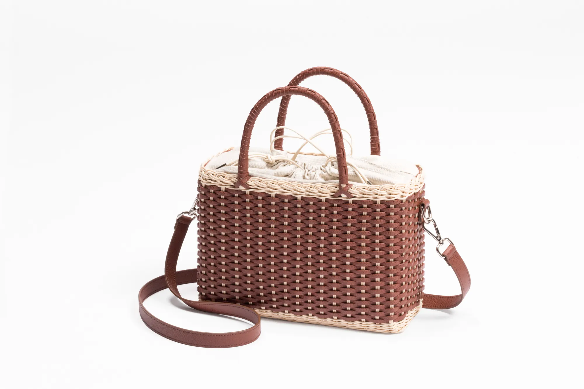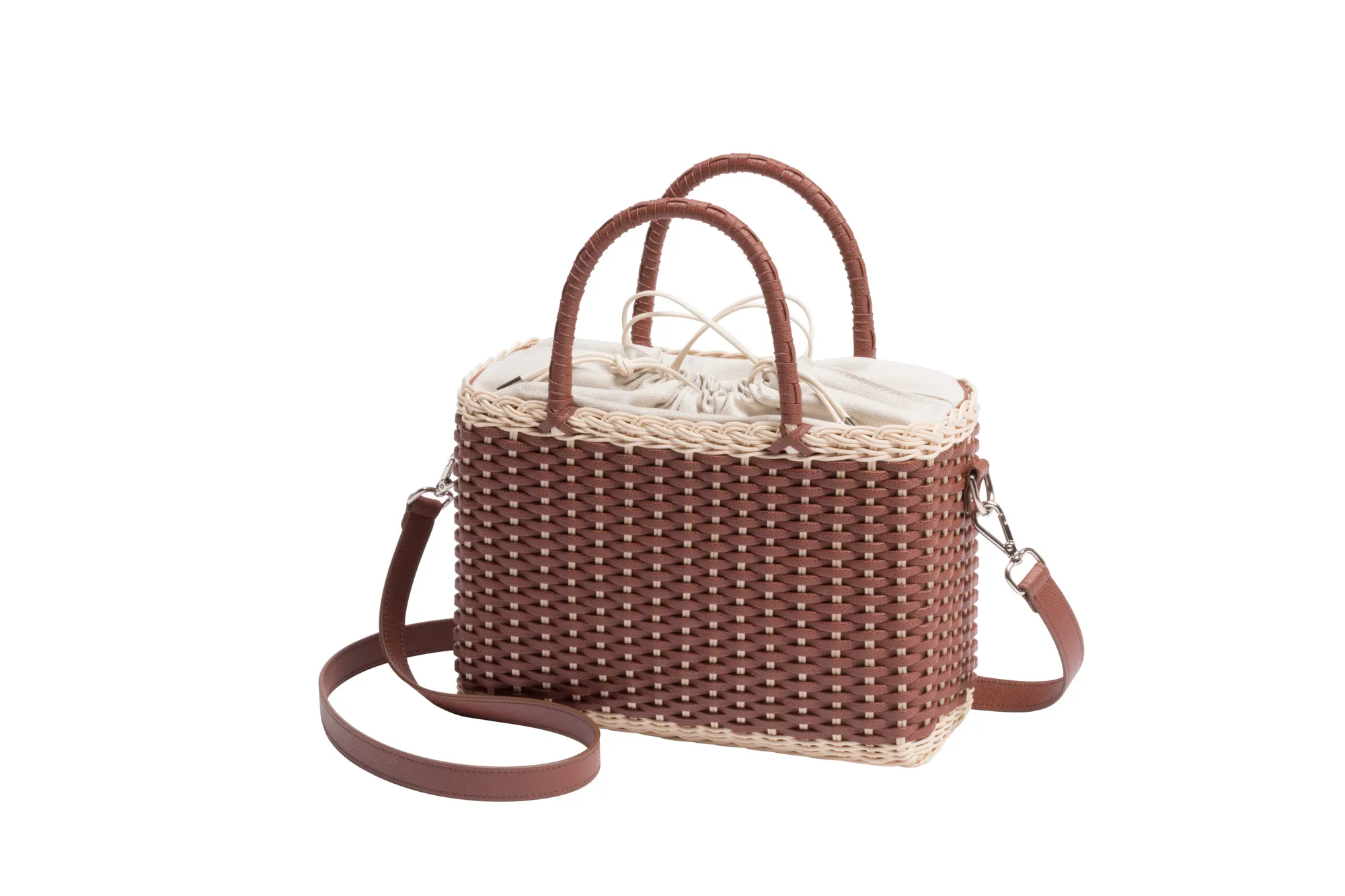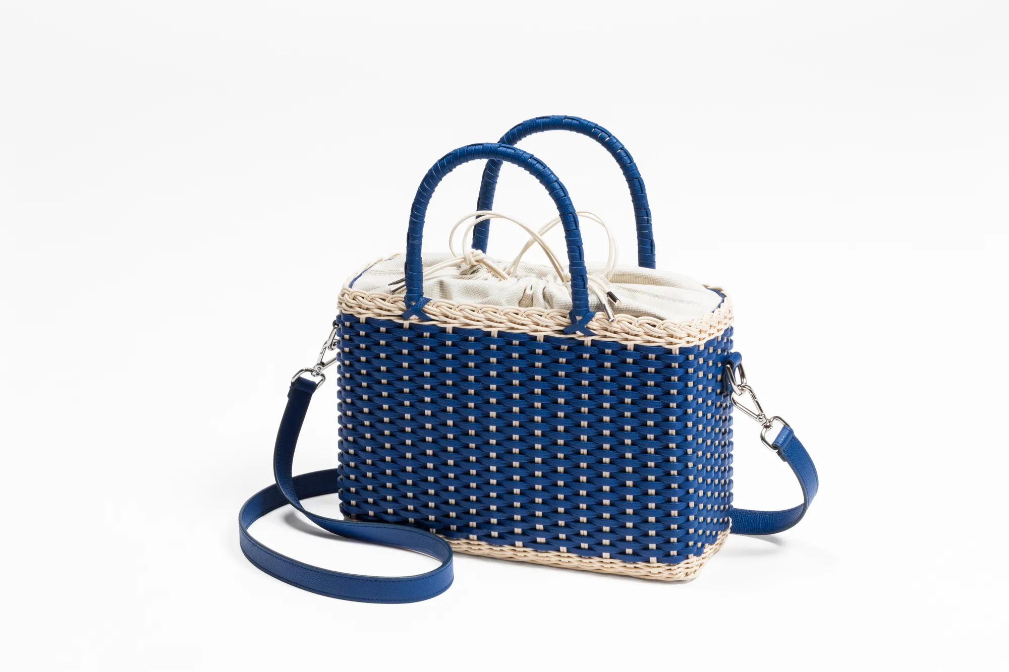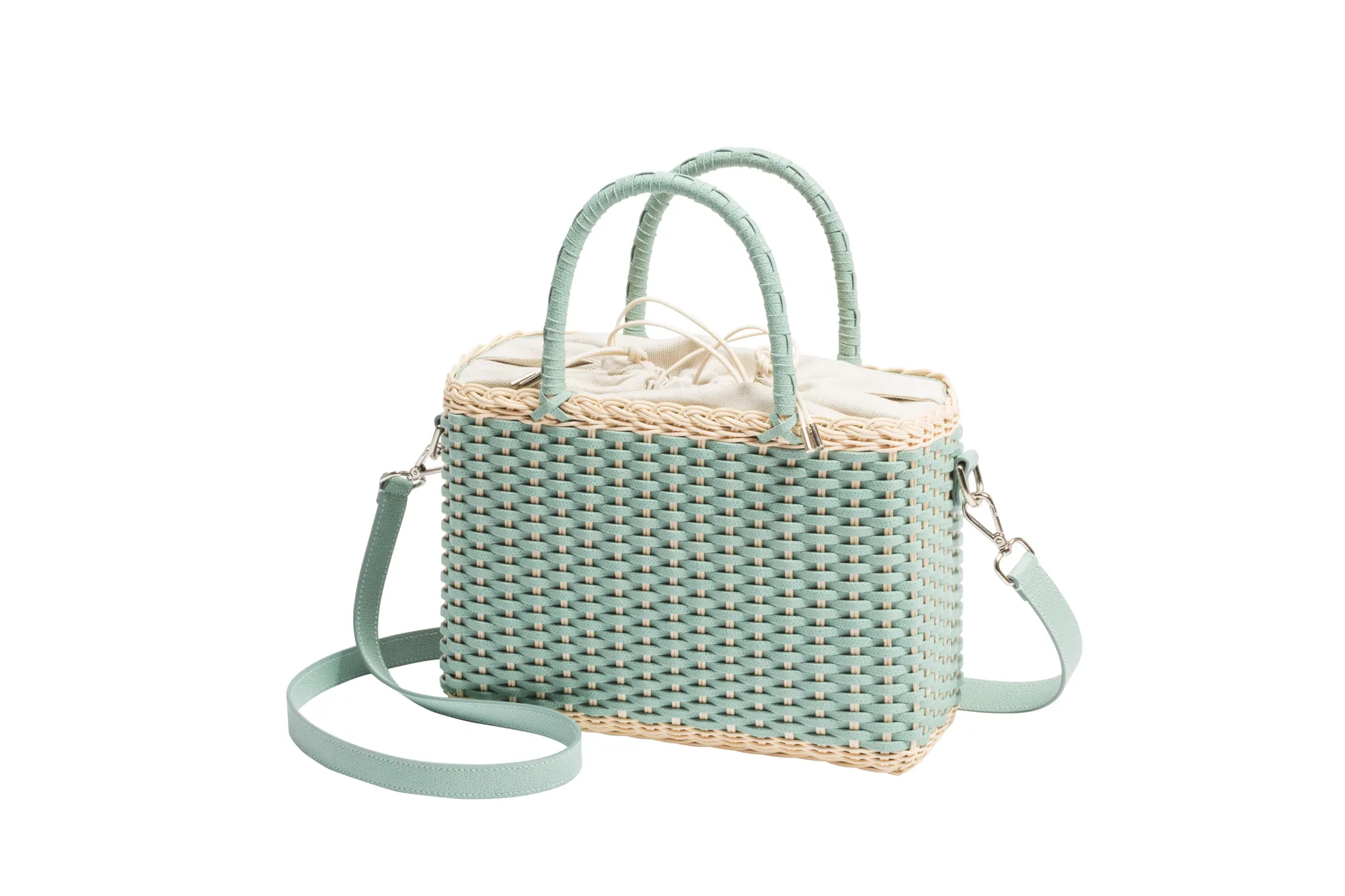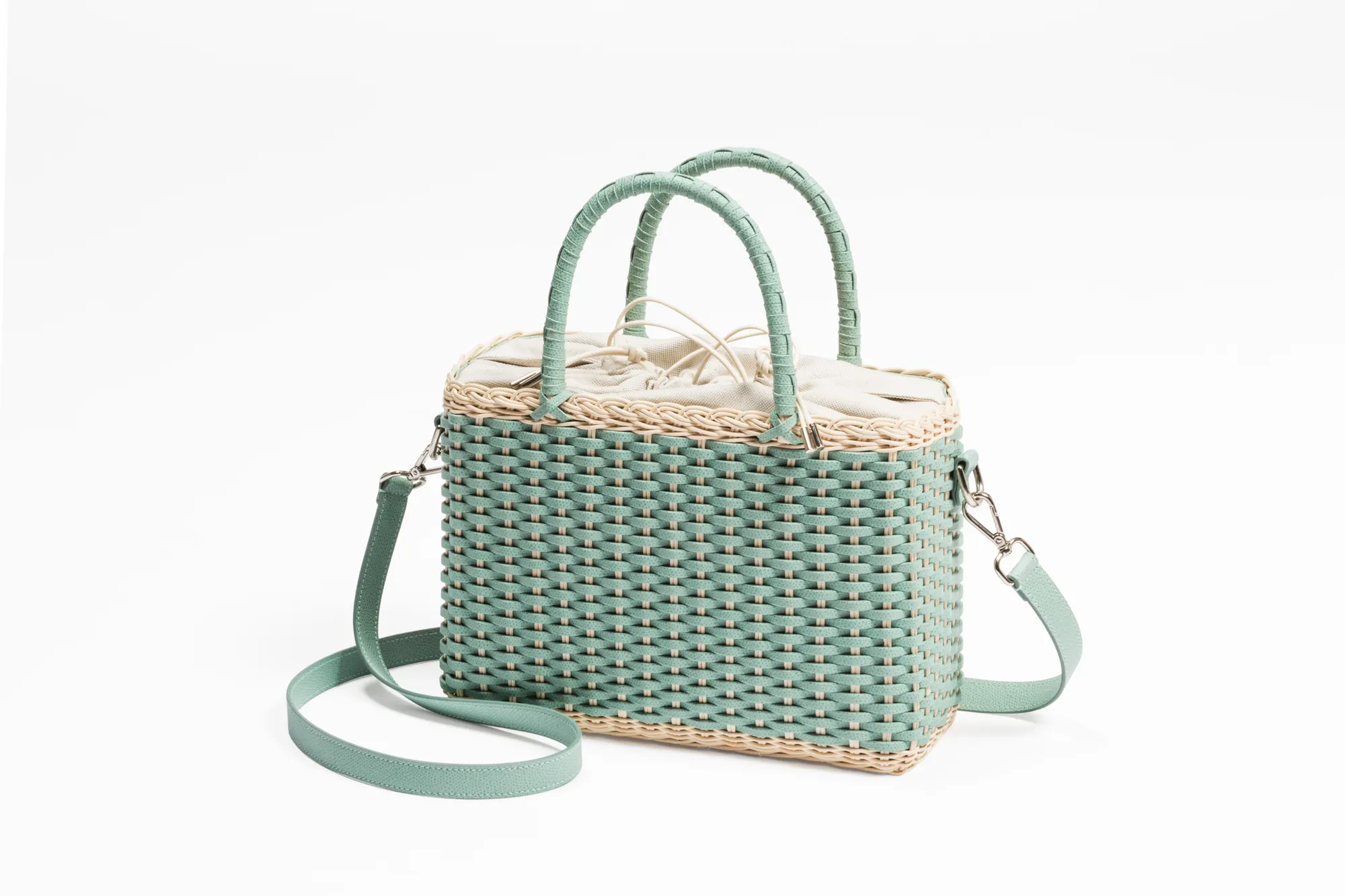 Made with the finest woven leather and rattan, this collection of compact day bags boasts a casual yet sophisticated attitude: the elegant shiny calfskin and the gentle freshness of rattan complement each other perfectly. The structured basket style is trimmed with hand-wrapped golf leather handles which showcase sophisticated leatherwork, while opening it reveals a cotton lining featuring a leather drawstring closure which adds a fresh touch. The Nartelle bags can either be carried with the two top handles or with the additional adjustable leather strap according to one's taste.