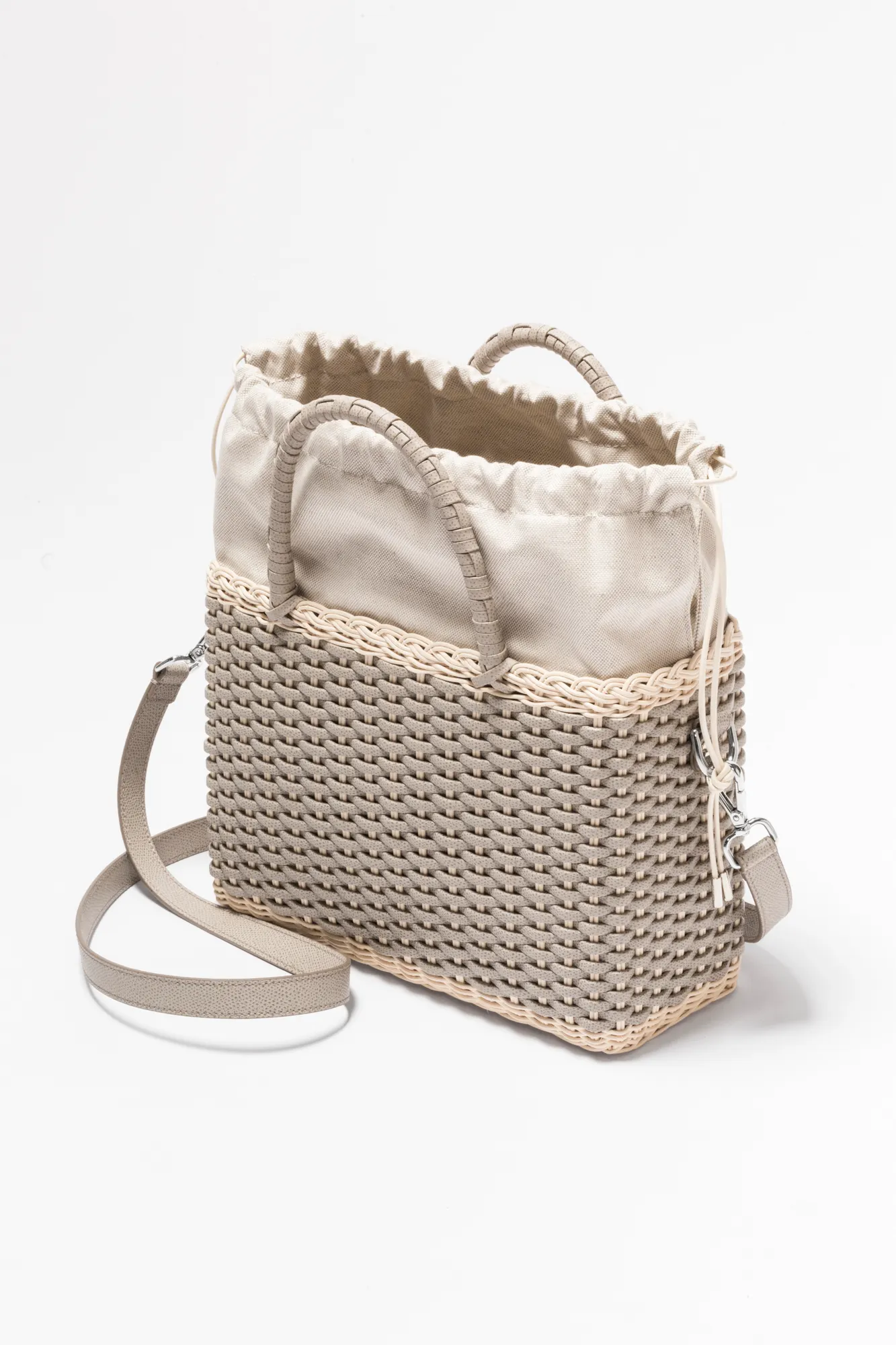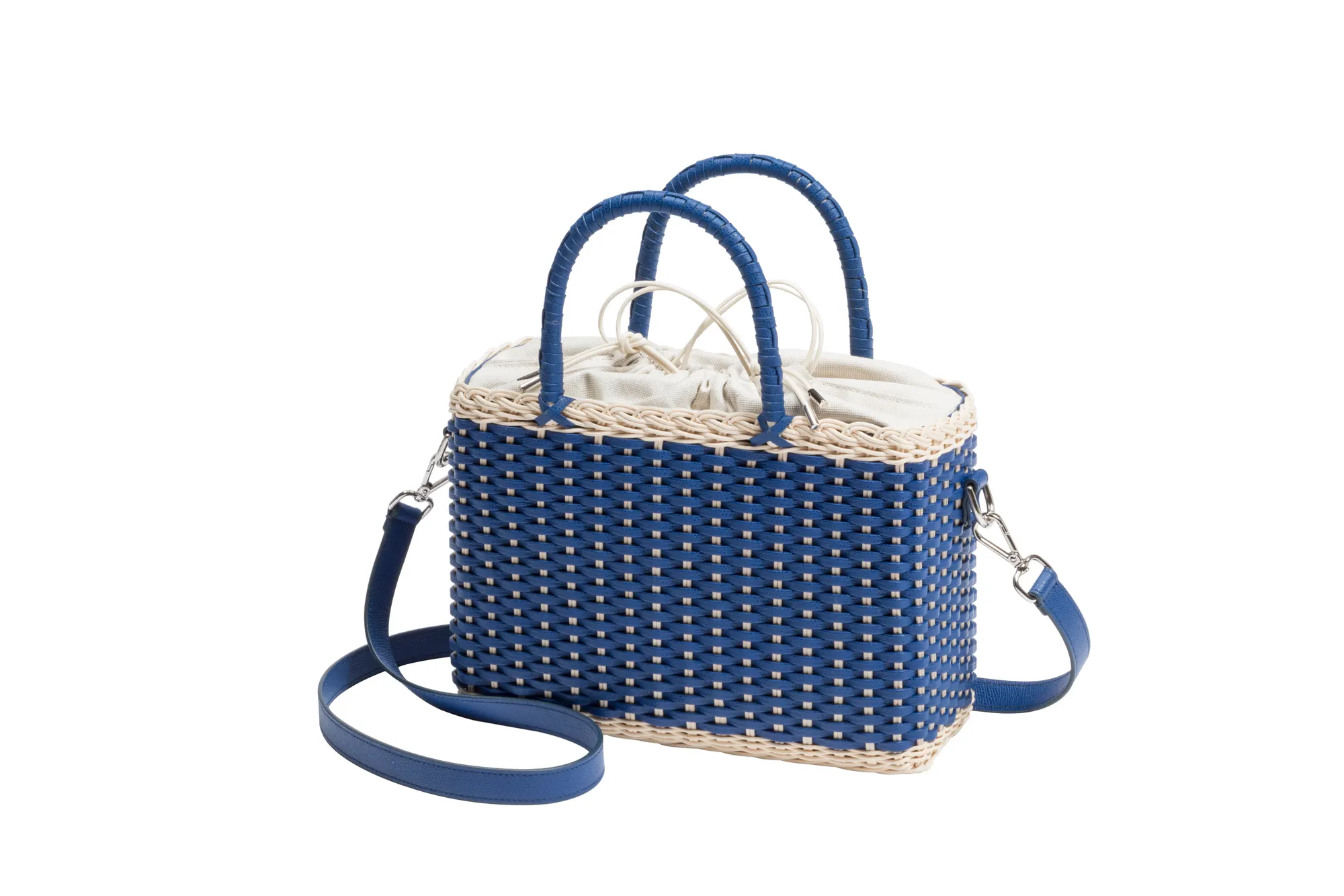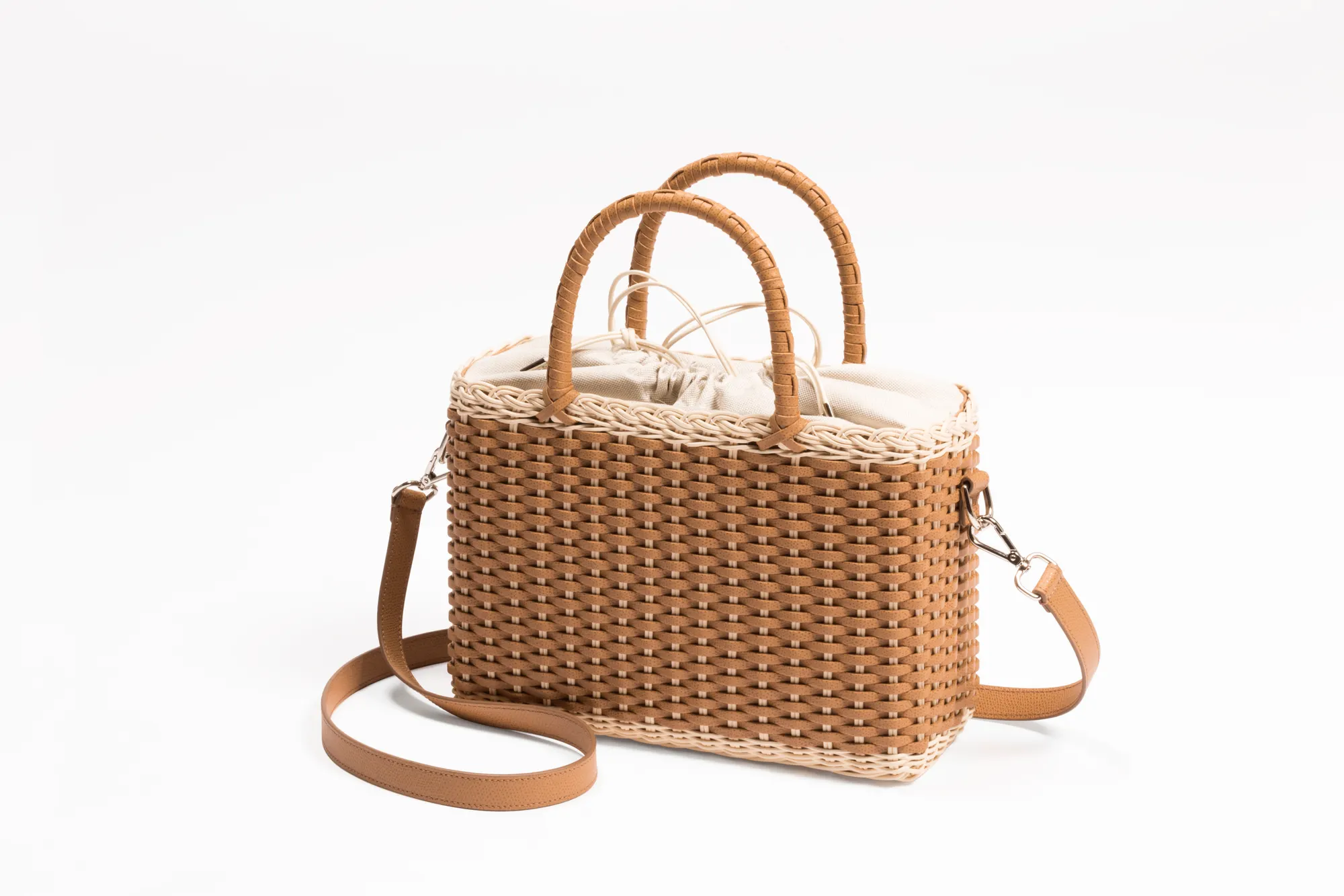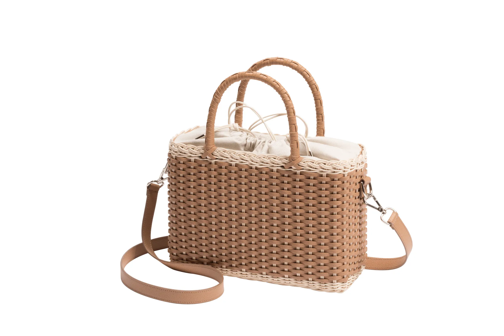 Made with the finest woven leather and rattan, this collection of compact day bags boasts a casual yet sophisticated attitude: the elegant shiny calfskin and the gentle freshness of rattan complement each other perfectly. The structured basket style is trimmed with hand-wrapped golf leather handles which showcase sophisticated leatherwork, while opening it reveals a cotton lining featuring a leather drawstring closure which adds a fresh touch. The Nartelle bags can either be carried with the two top handles or with the additional adjustable leather strap according to one's taste.