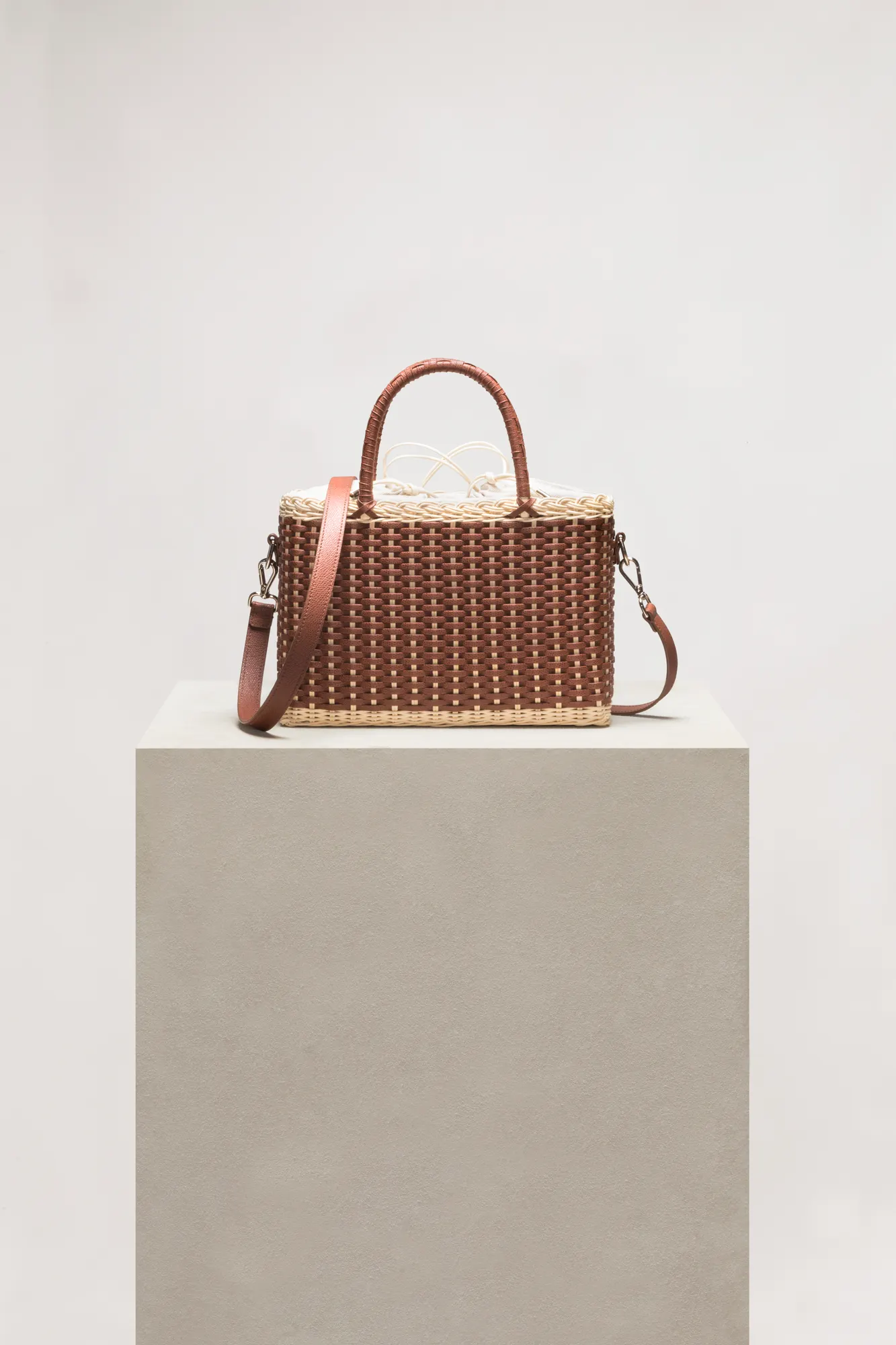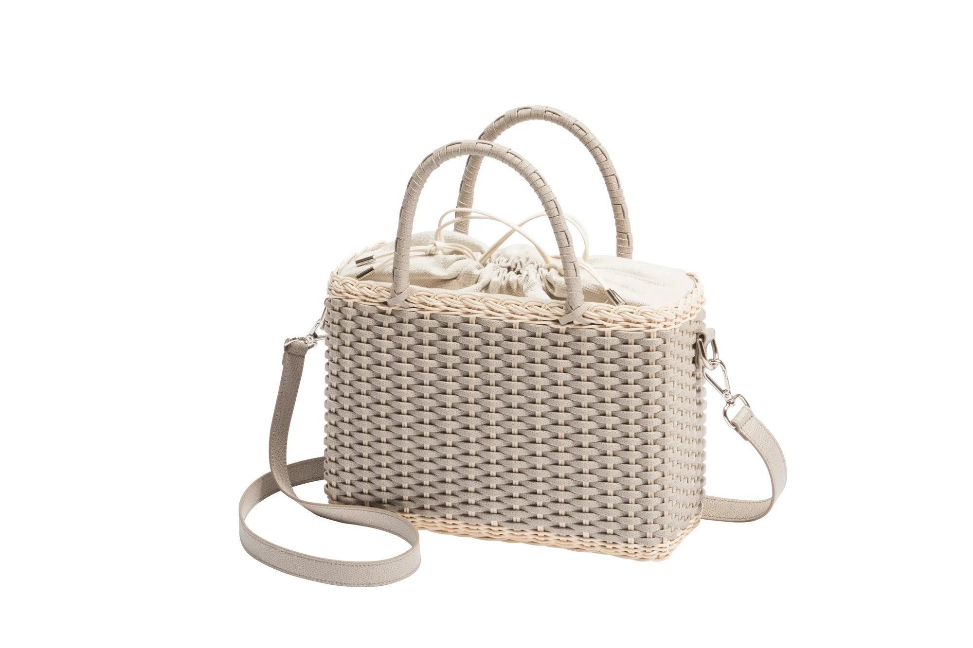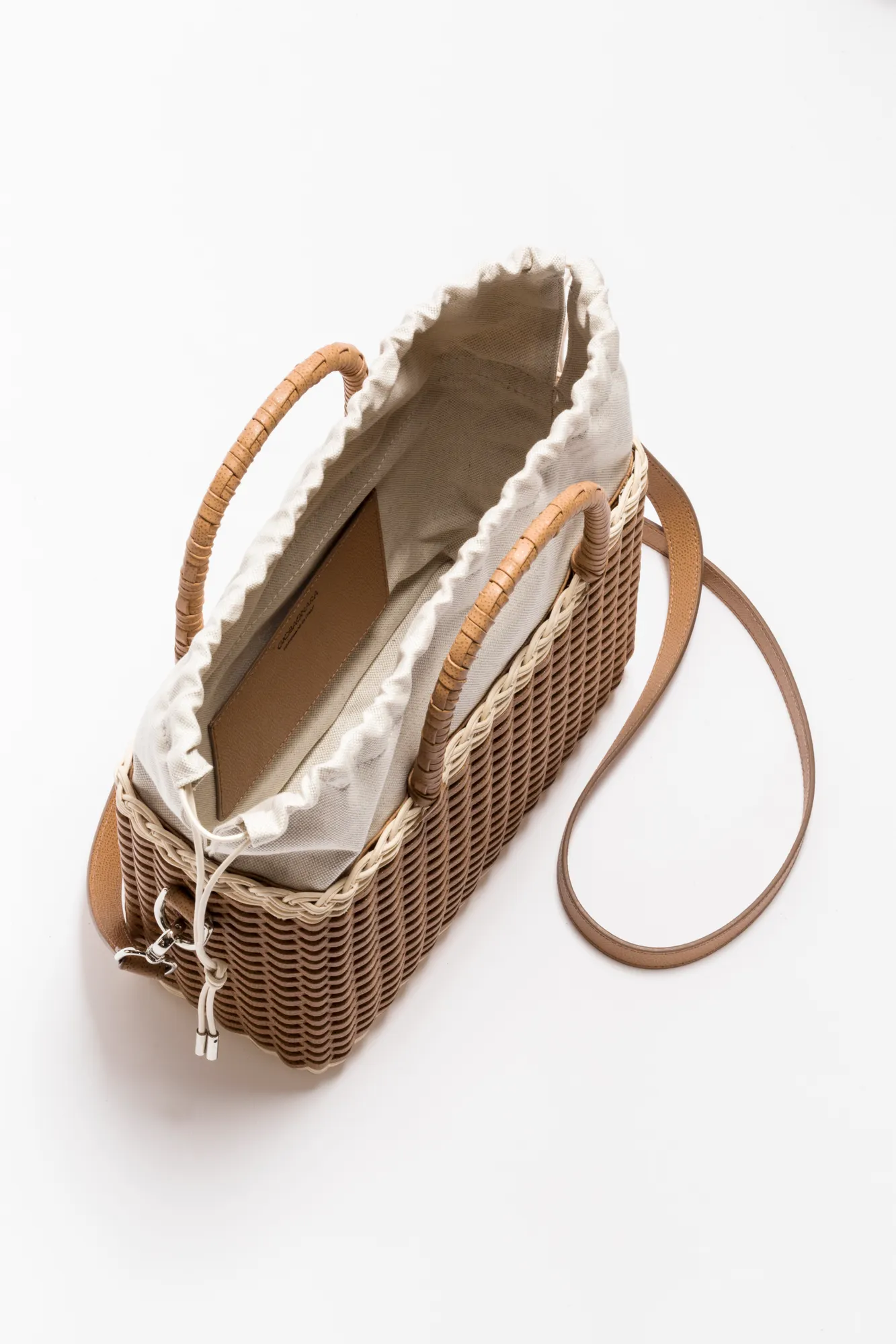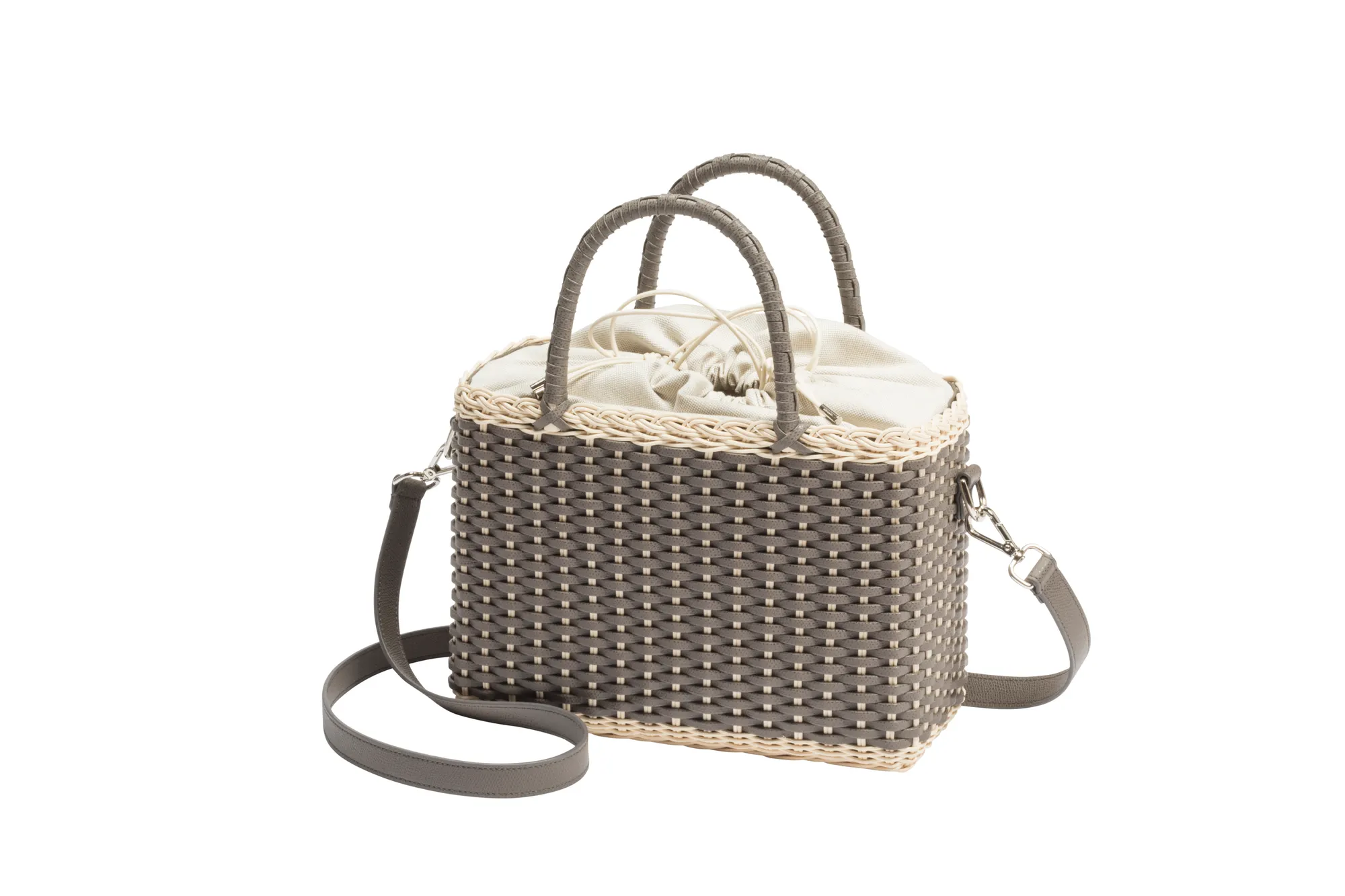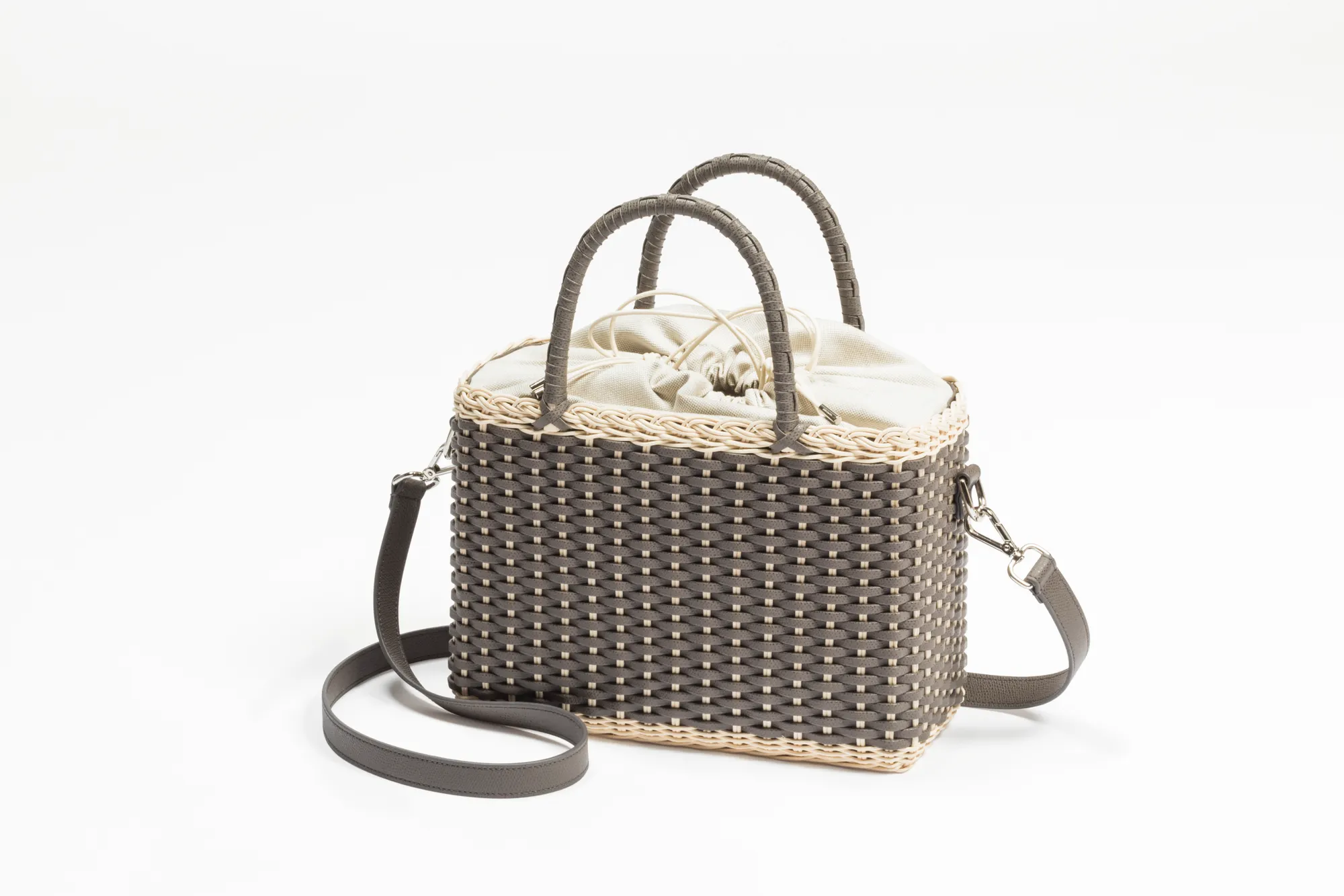Made with the finest woven leather and rattan, this collection of compact day bags boasts a casual yet sophisticated attitude: the elegant shiny calfskin and the gentle freshness of rattan complement each other perfectly. The structured basket style is trimmed with hand-wrapped golf leather handles which showcase sophisticated leatherwork, while opening it reveals a cotton lining featuring a leather drawstring closure which adds a fresh touch. The Nartelle bags can either be carried with the two top handles or with the additional adjustable leather strap according to one's taste.