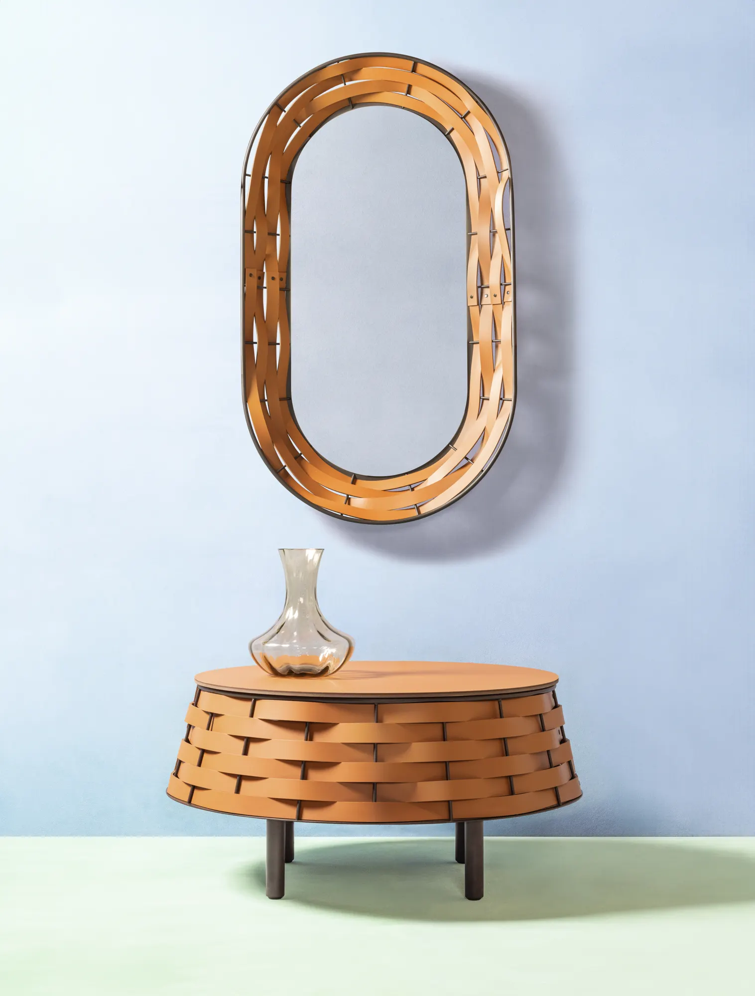 The Nassa collection is the perfect synergy of style and utility able to redefine living spaces with its sophisticated allure. The framework of this series of storage baskets boasts a sophisticated dark-stained aluminum structure and a vibrant Tecnocuoio® weaving, providing not only durability but also a touch of contemporary elegance. This sleek combination of materials ensures stability while adding a subtle yet striking visual appeal to the mirrors. Design by Simone Fanciullacci.