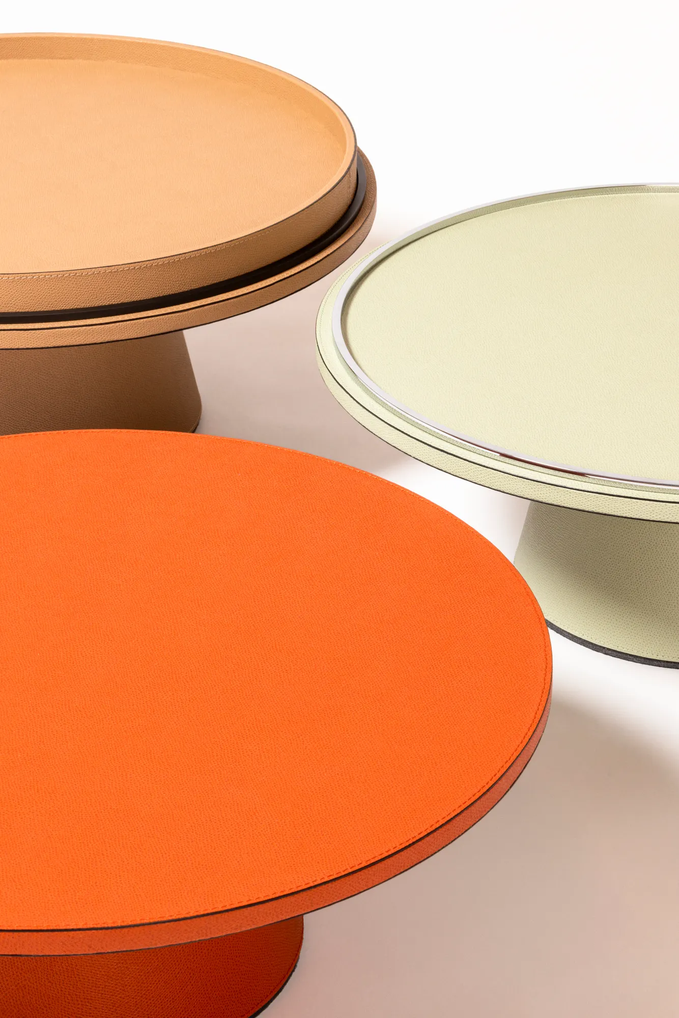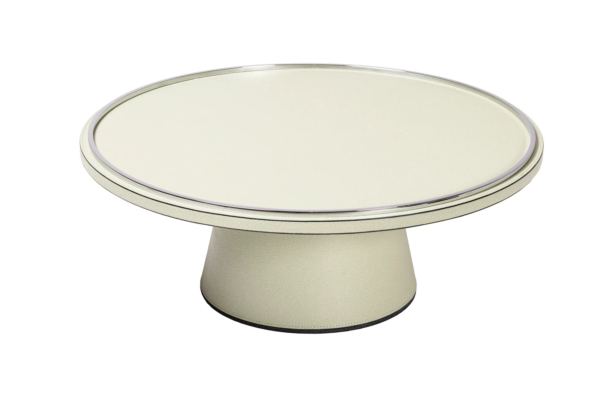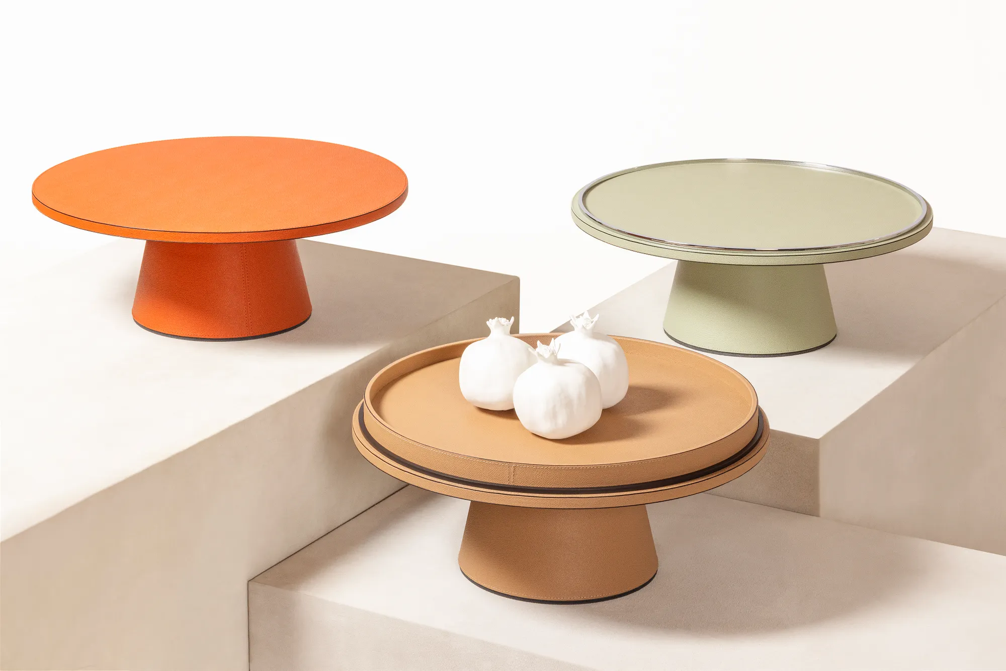 Rotating raised tray with leather covered wood structure and metal ring available in three finishes.