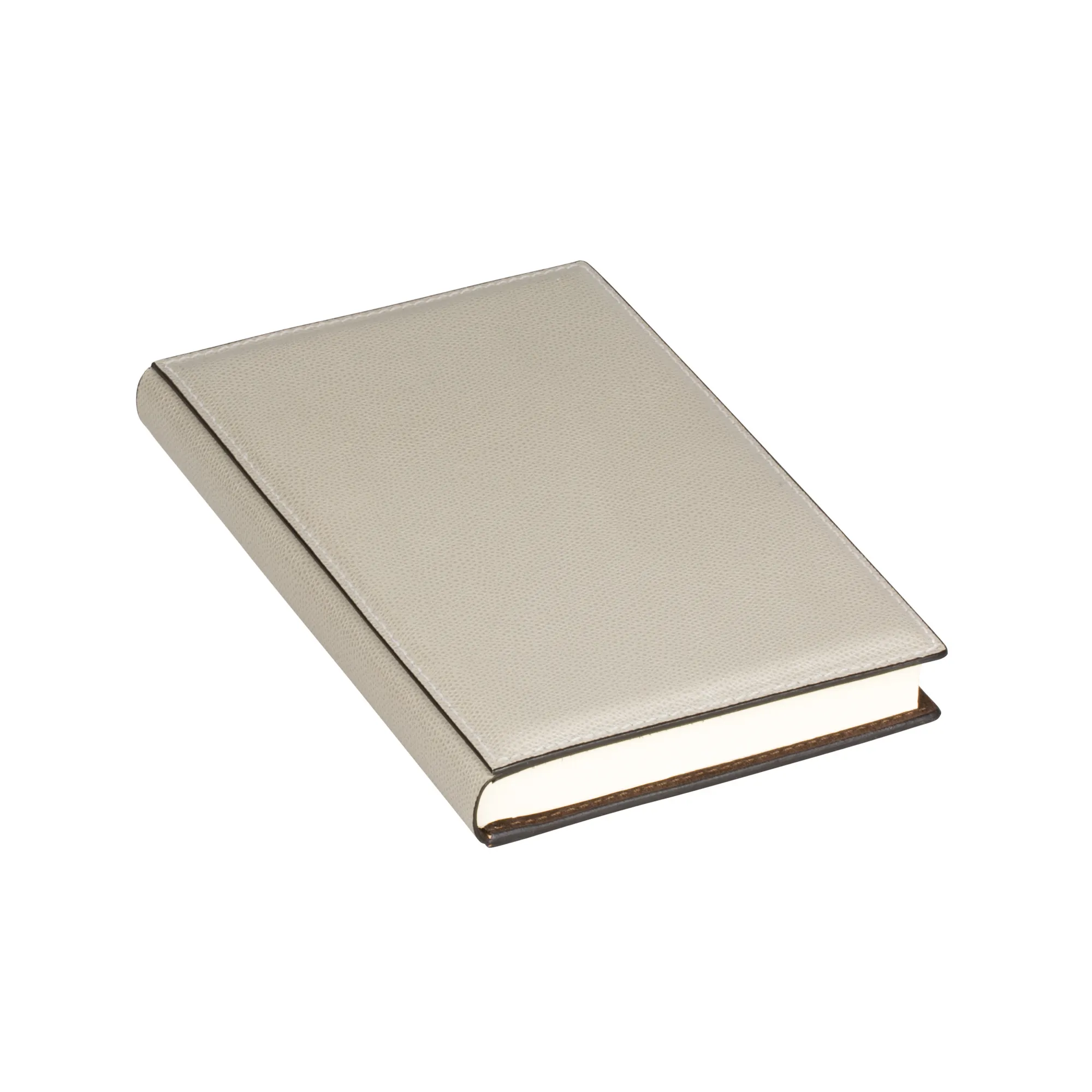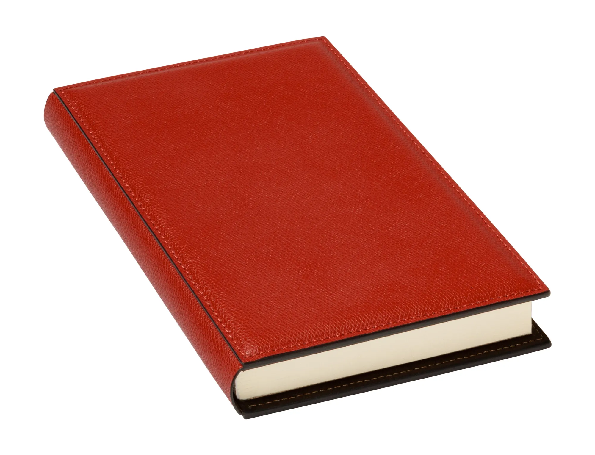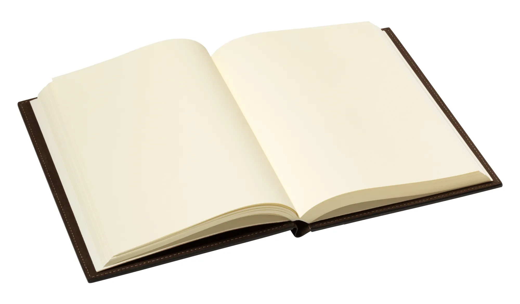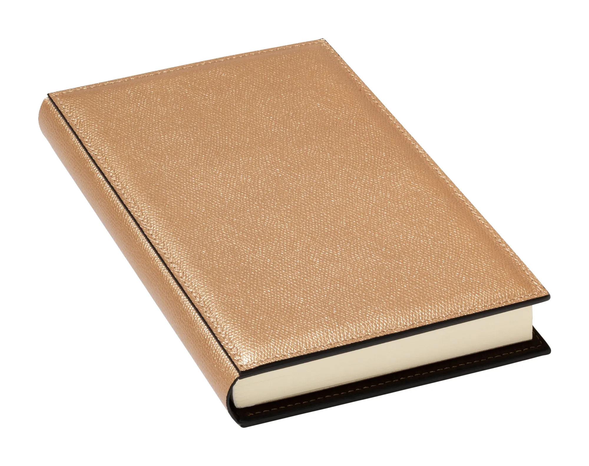 Padded leather cover and suede lining. Side leather pockets and pen holder with pen. Provided with 144 ivory paper sheets.