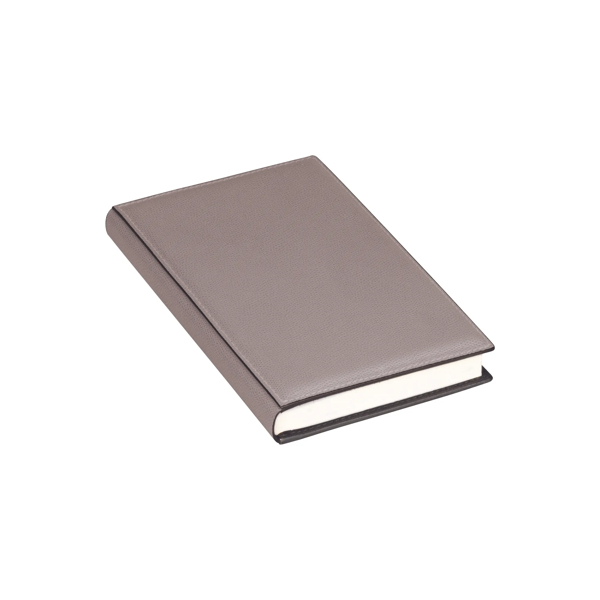 Padded leather cover and suede lining. Side leather pockets and pen holder with pen. Provided with 144 ivory paper sheets.