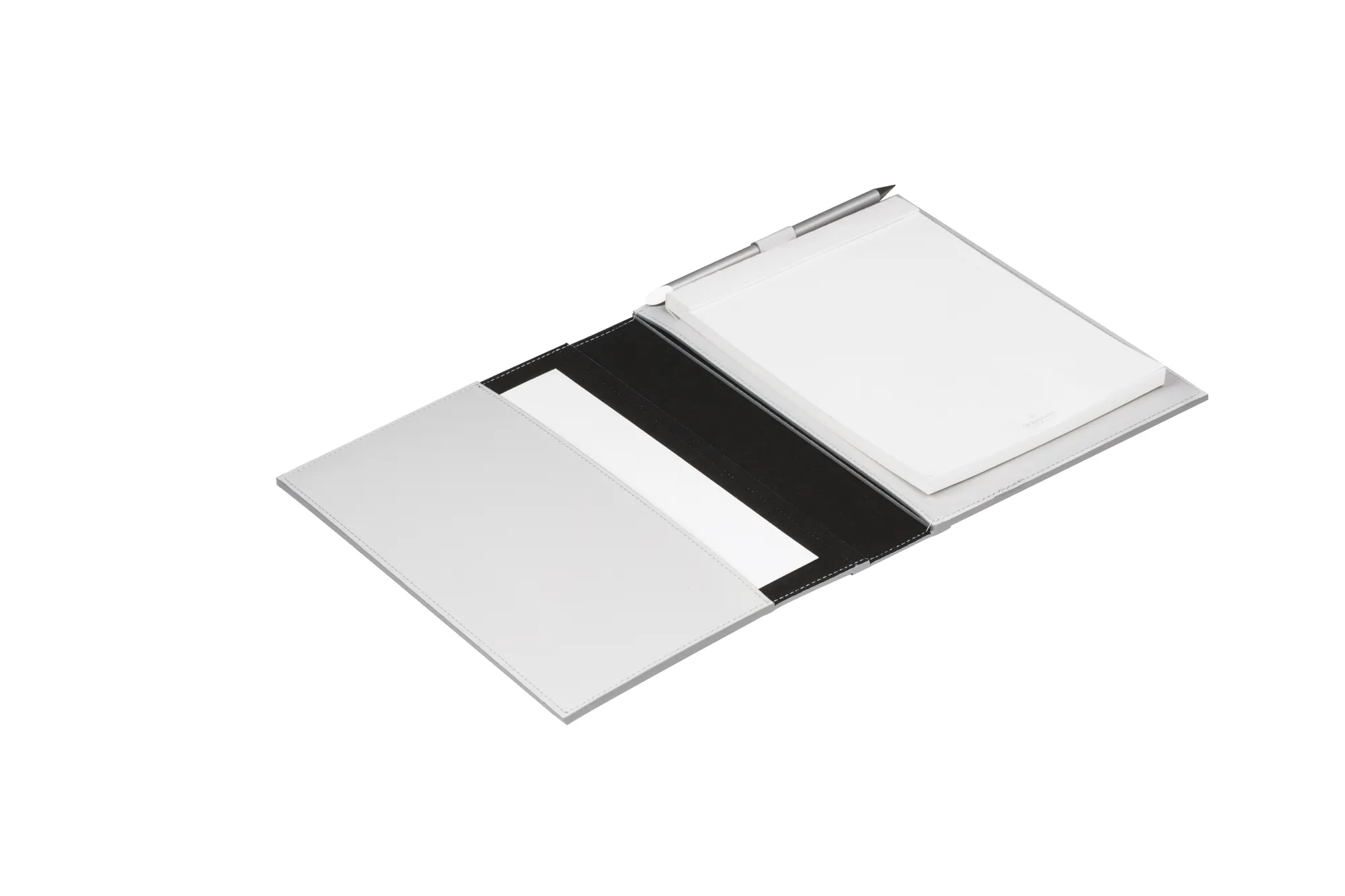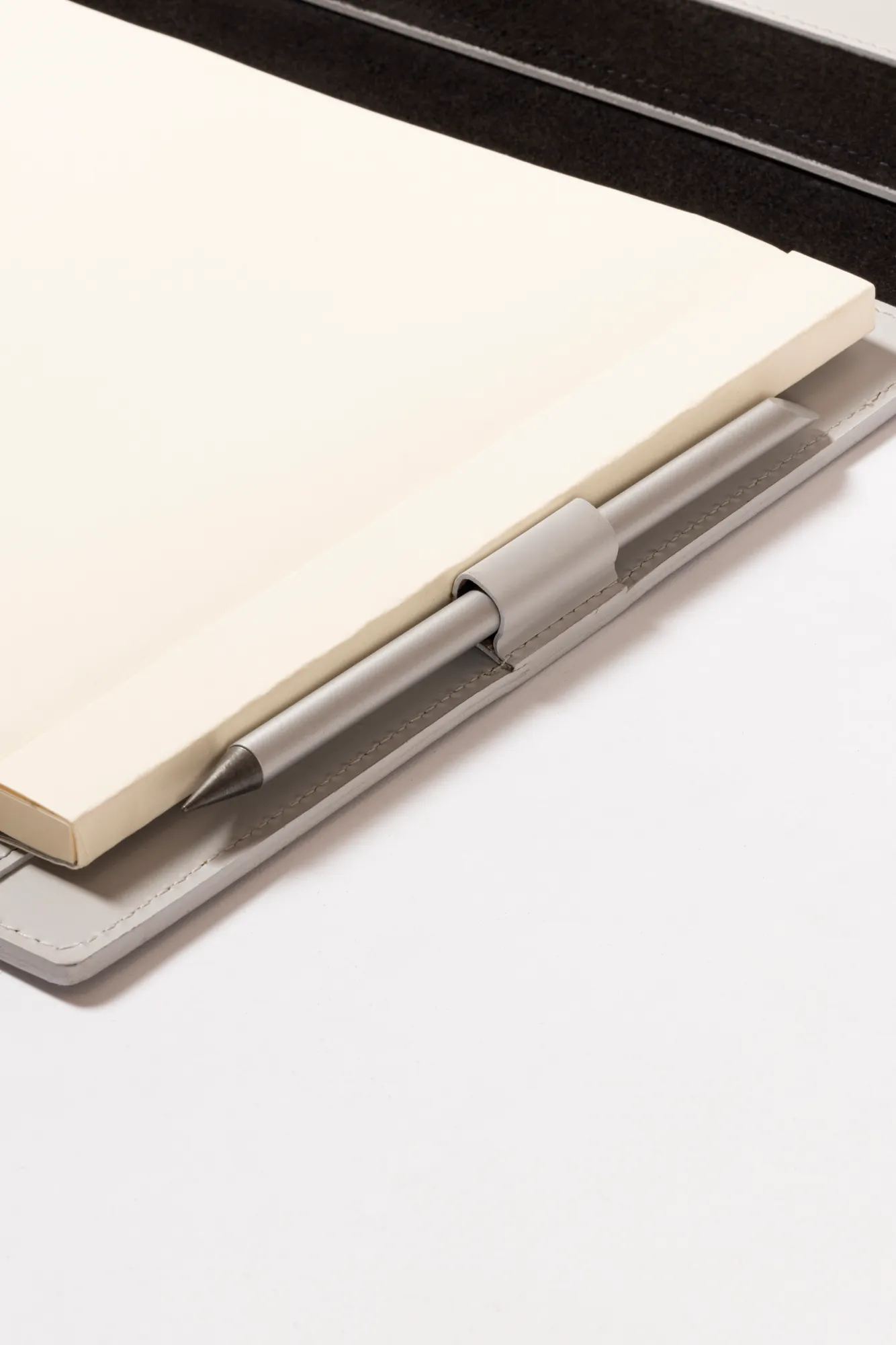 Finest regenerated leather structure with water-resistant and UV-resistant finish. Provided with pen holder adjustable to different pen sizes. Black microfiber lining.
