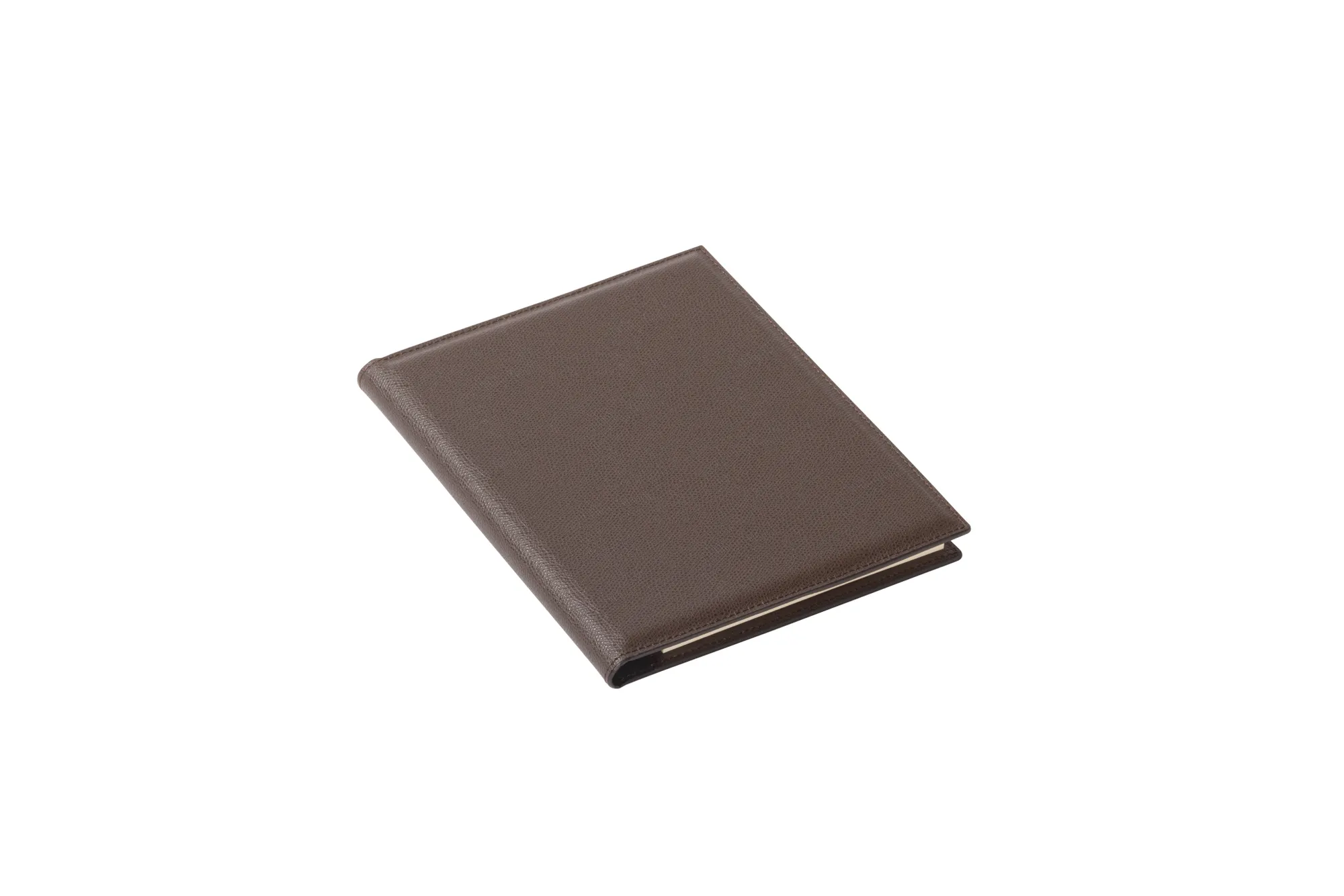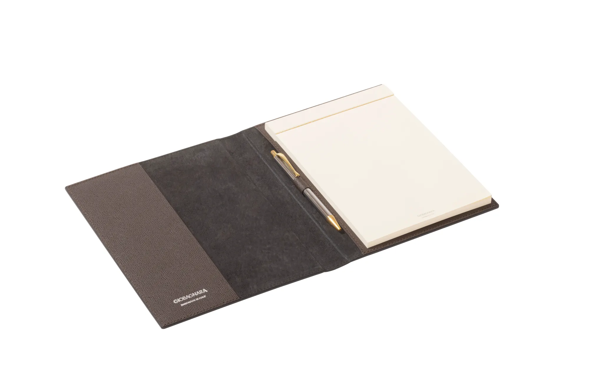 Padded leather cover and suede lining. Side leather pockets and pen holder with pen. Includes a notepad made of 70 ivory paper sheets.