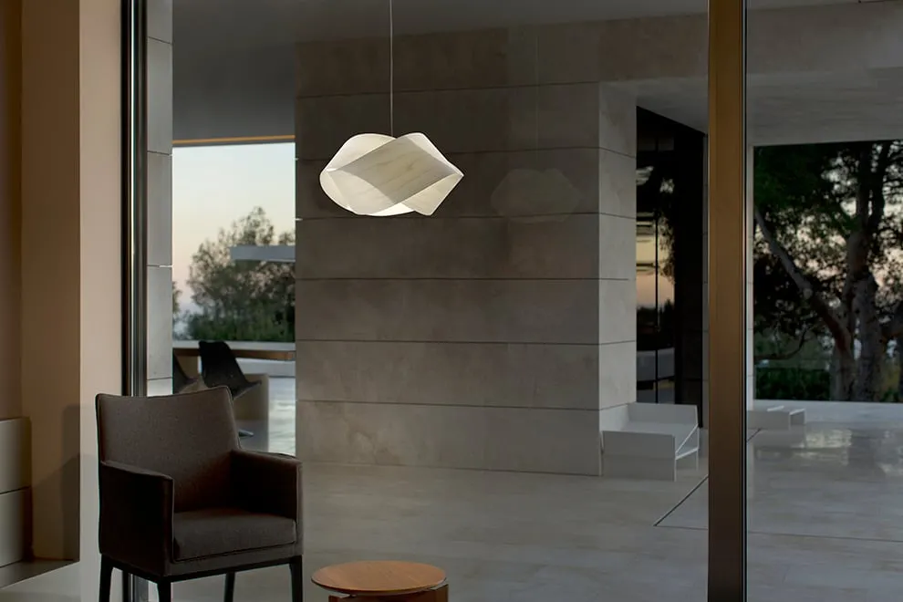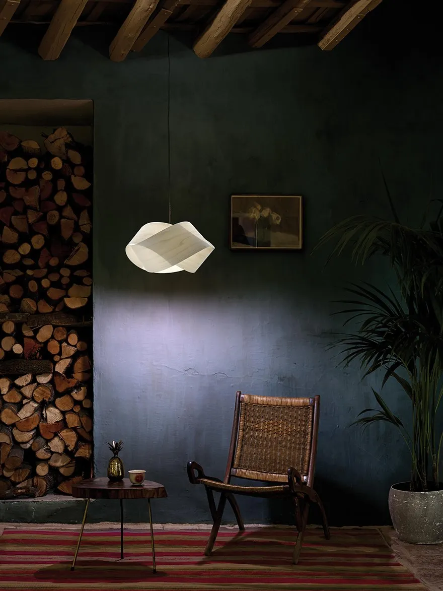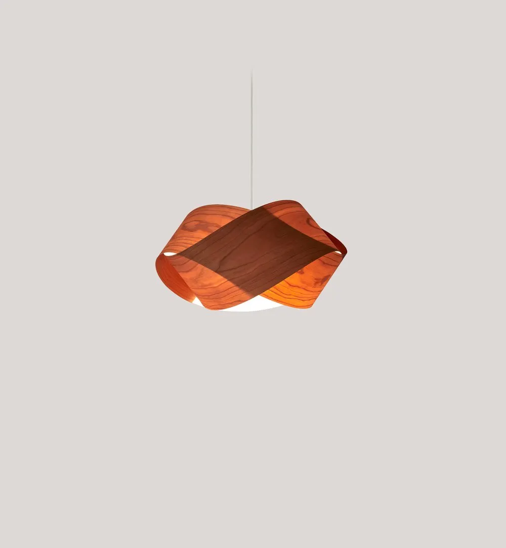 NUT THE KNOT OF LIGHT. Reminiscent of a granny knot, the Nut lamp’s fetching form is made by tying a knot (in a manner of speaking): it is the result of twisting and looping a piece of wood veneer. Two designs for the Nut pendant are practicable and are determined by the direction of torsion—that is how the wood veneer is twisted.