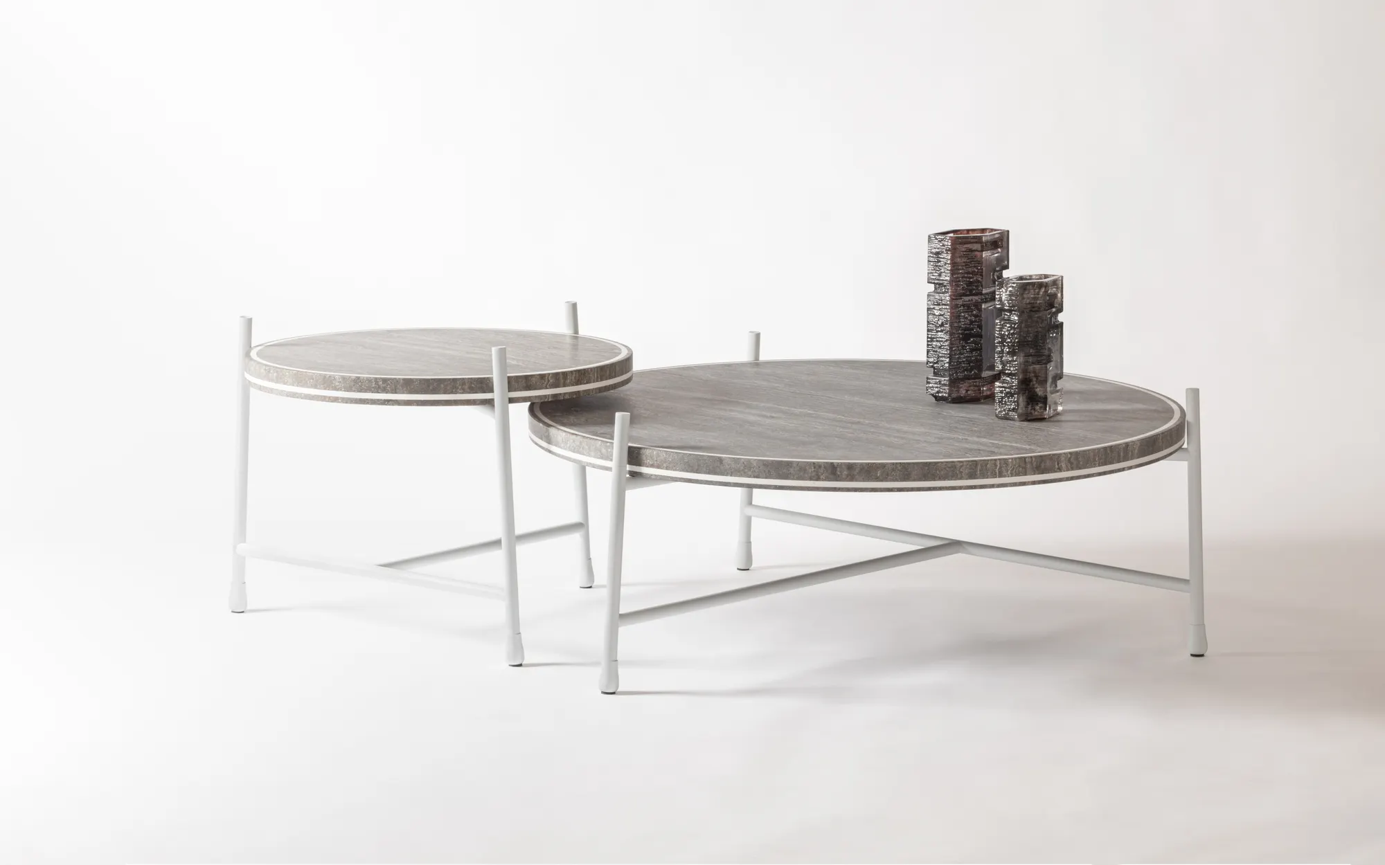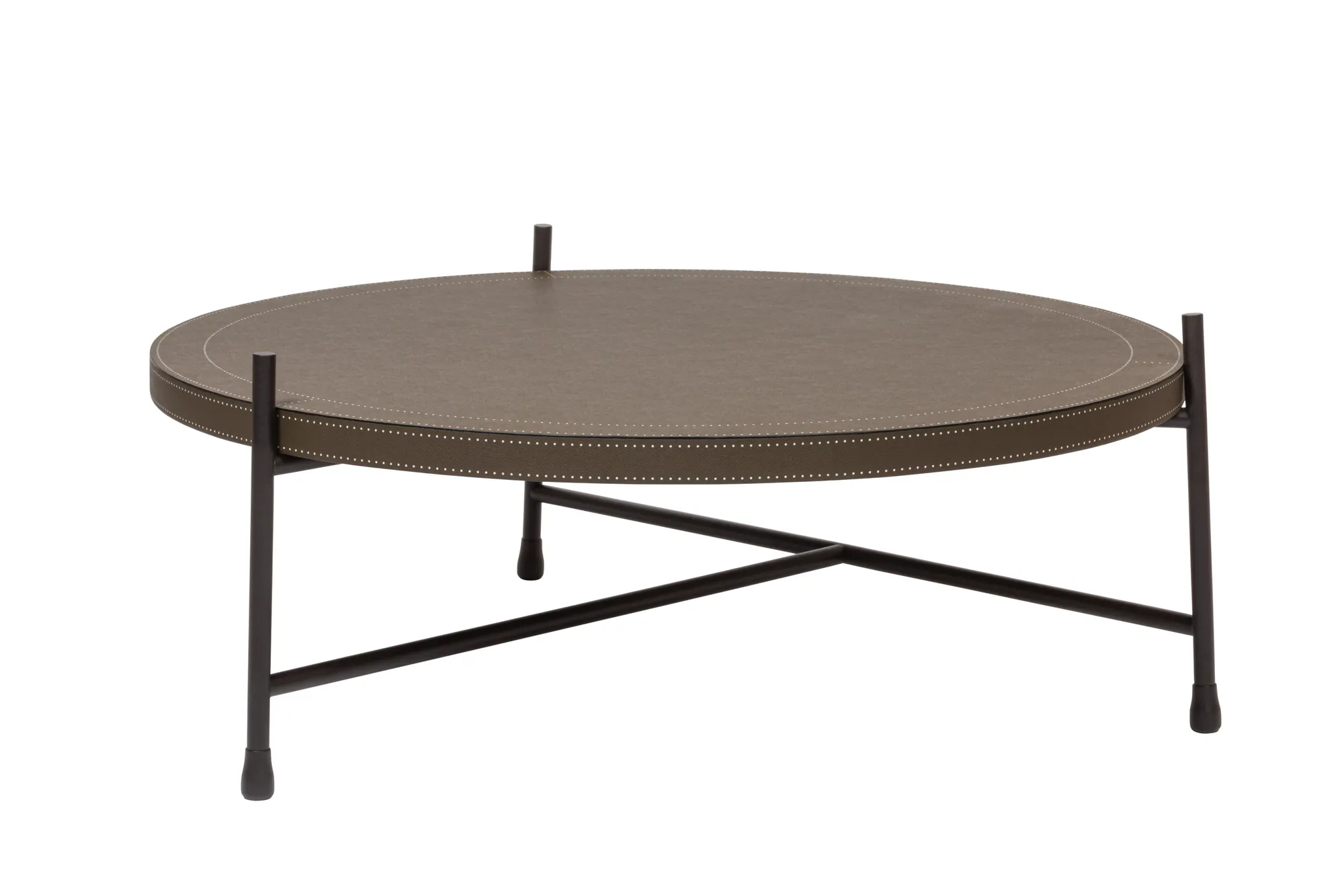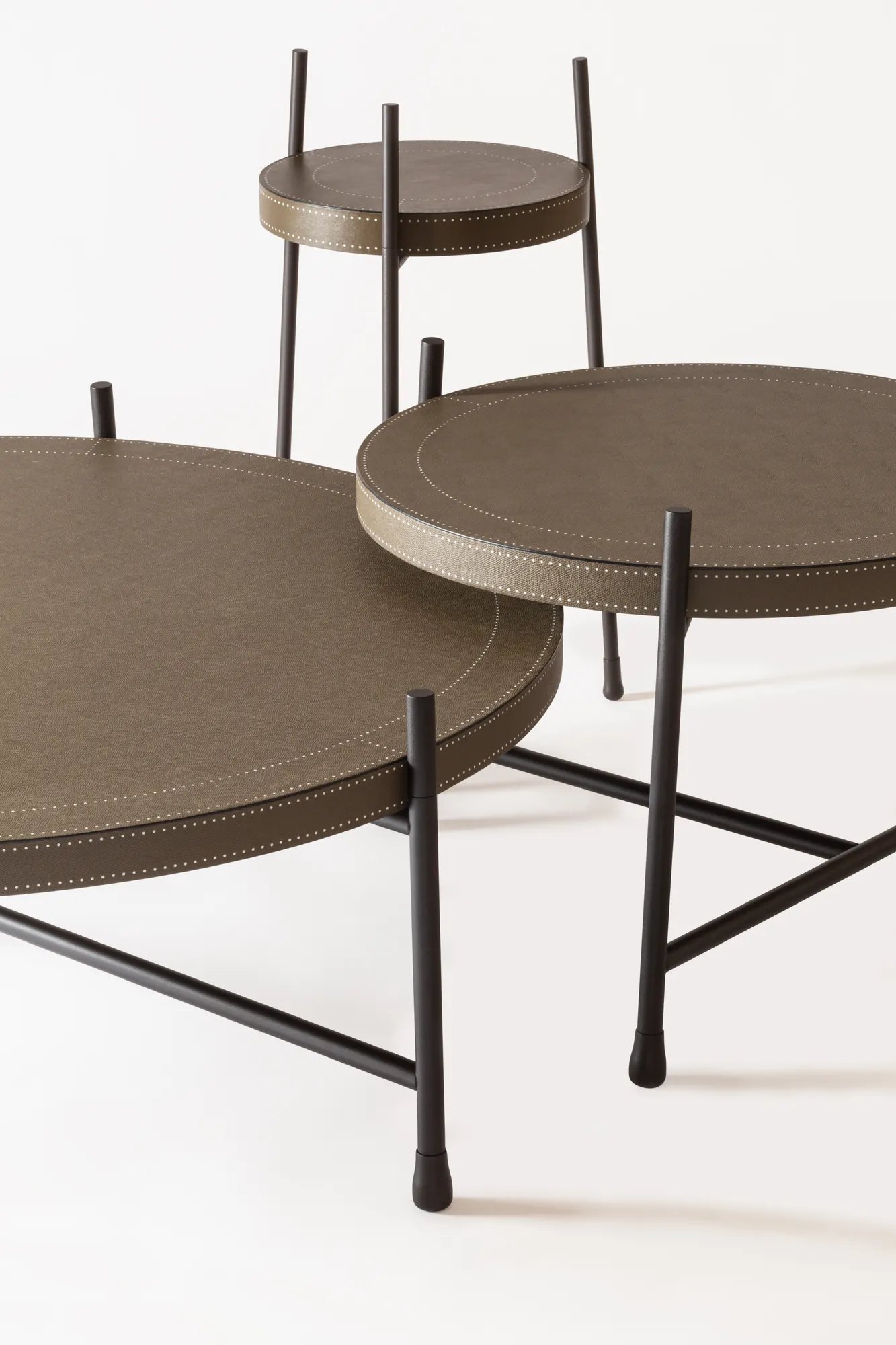These coffee tables redefine spaces with their unique blend of form and function, effortlessly capturing the essence of balance and beauty. Oblivion boasts slim burnished bronze legs that seem to defy gravity, lifting the round top into an enchanting suspension. This collection, now declined with a sleek leather top featuring an exquisite printed decorative motif, adds an air of timeless sophistication to any room, seamlessly blending organic earthiness and contemporary aesthetics. Ideal to be used both as standalone statement pieces or as an exquisite pair. The top's dots can be either off-white or dark brown according to the chosen leather color.