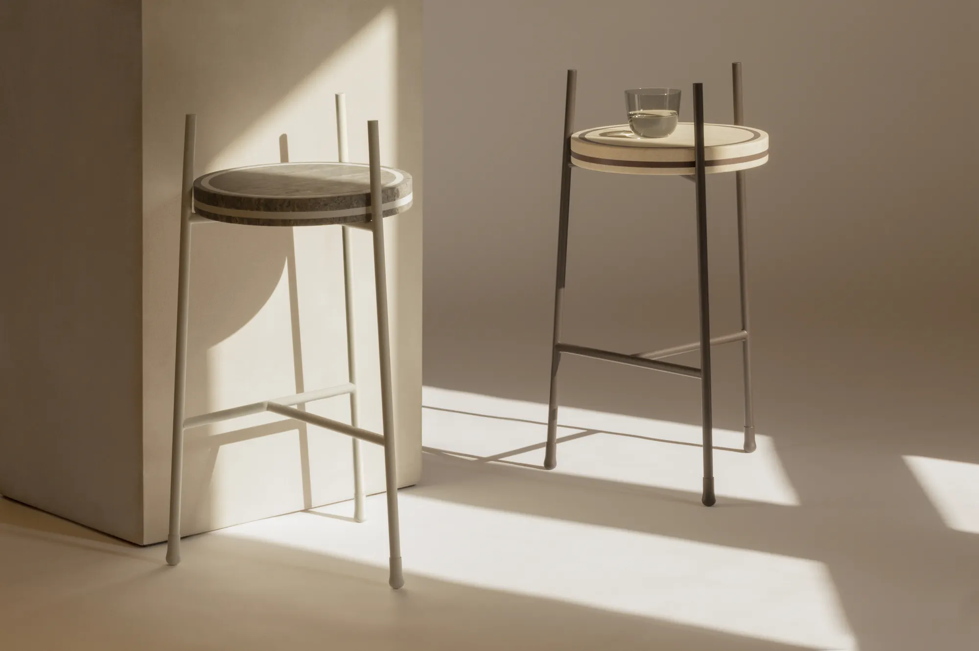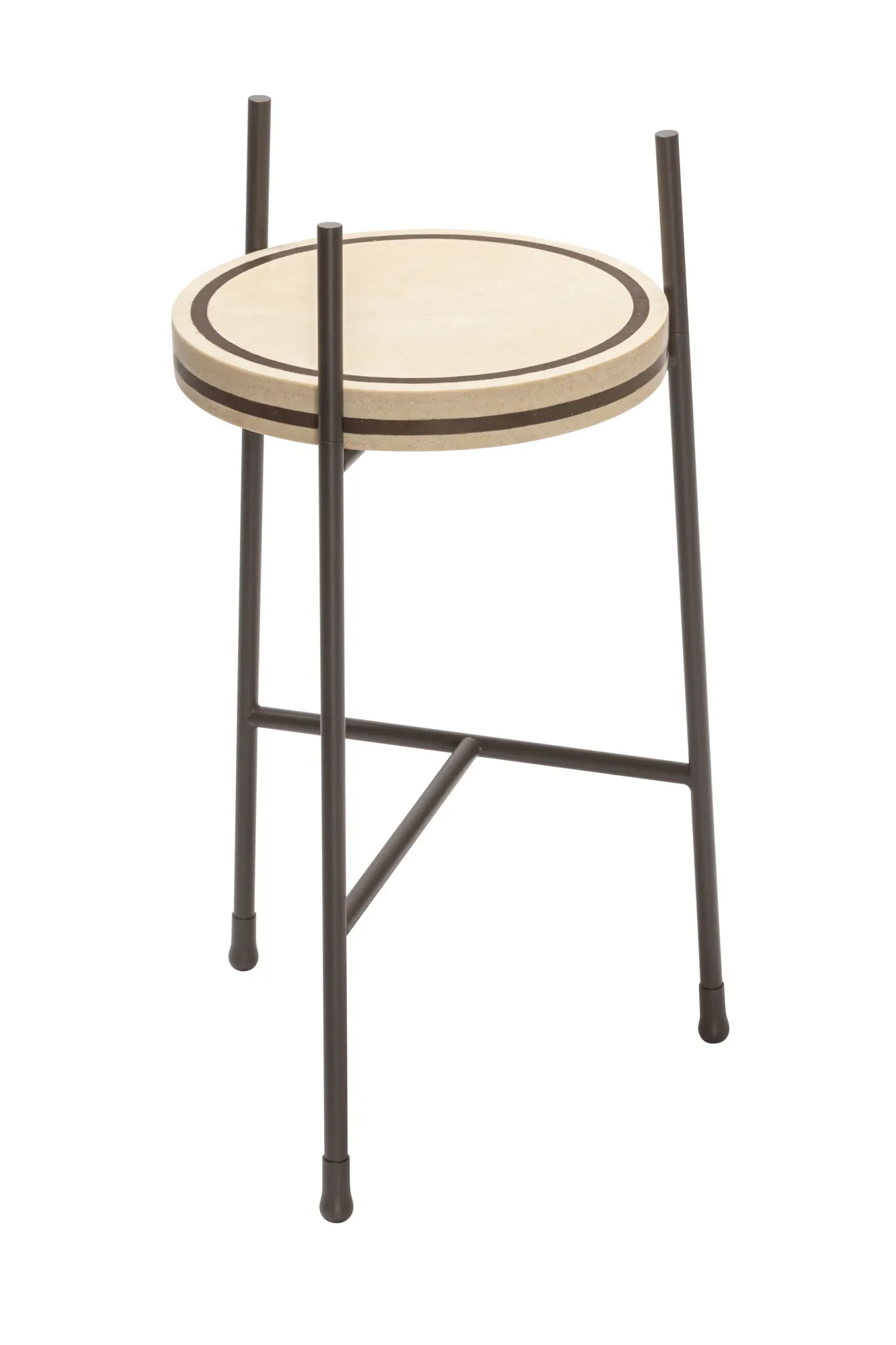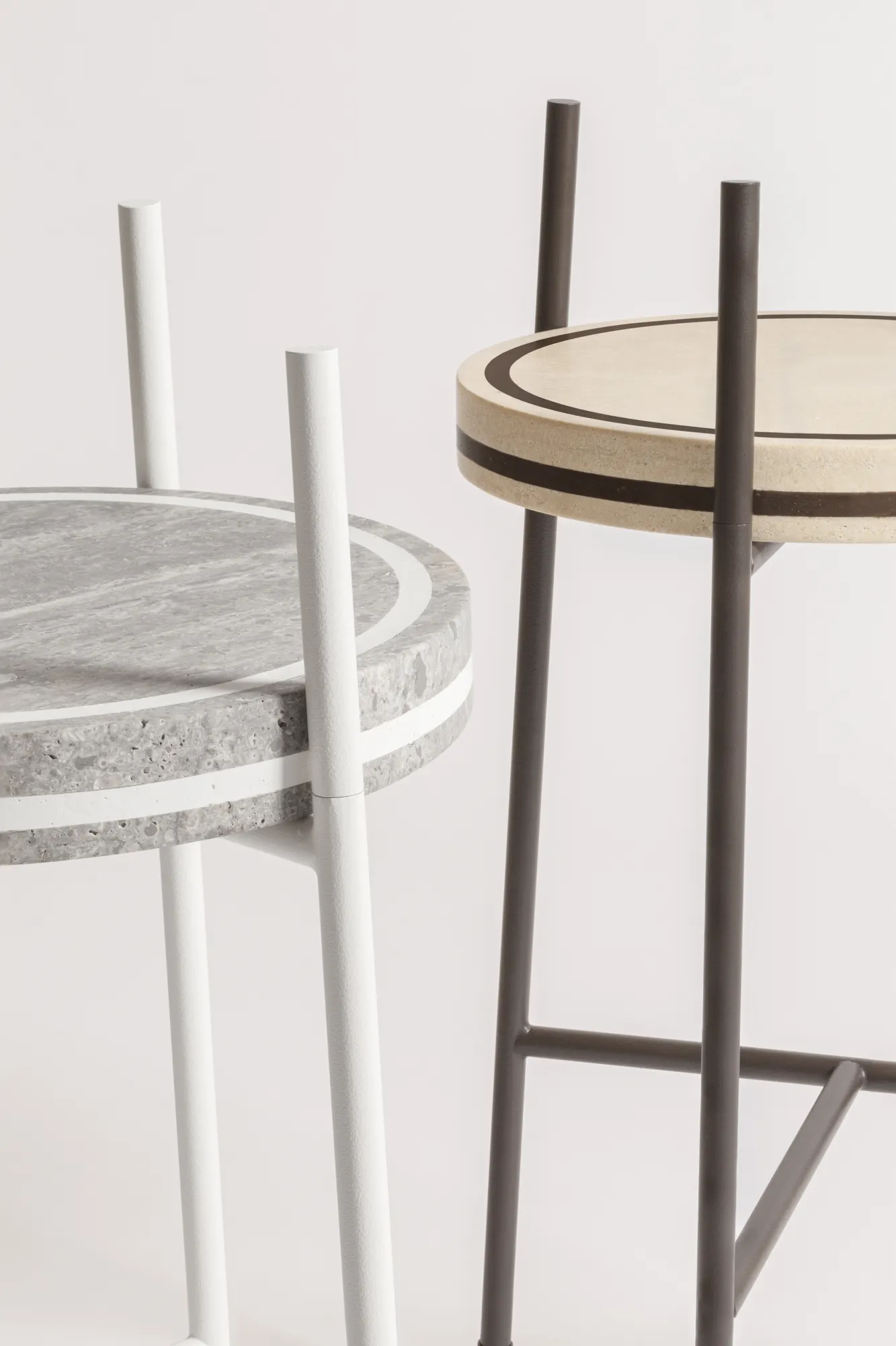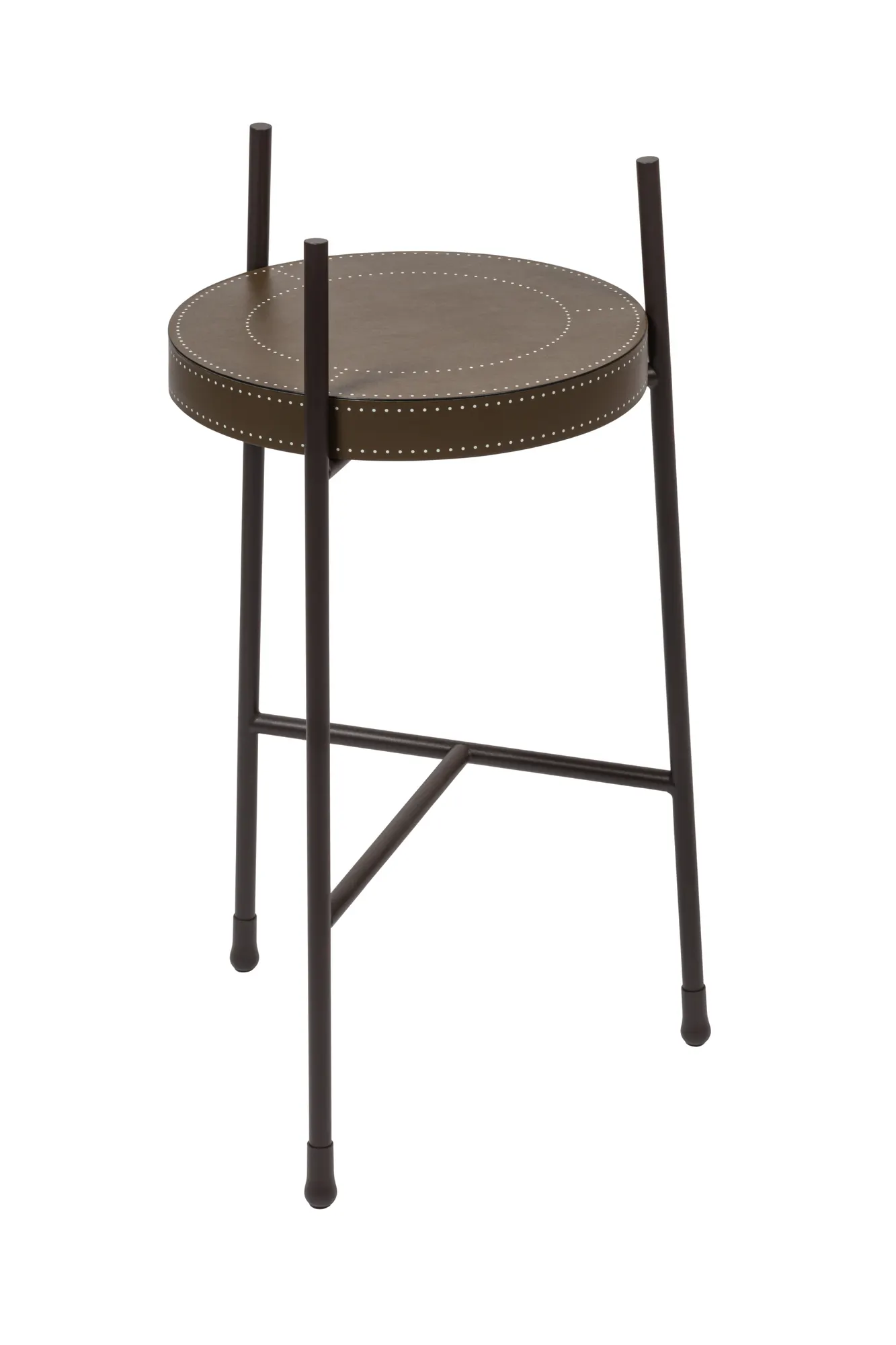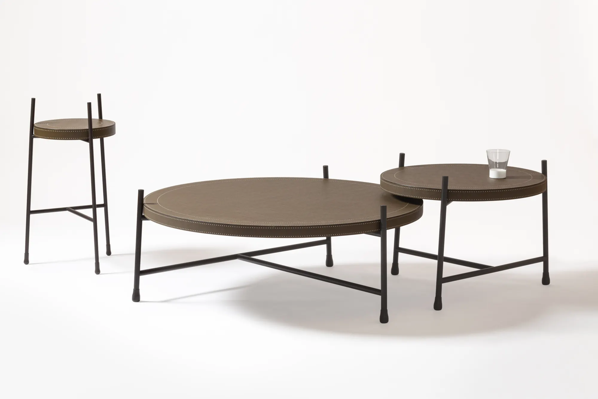 These coffee tables redefine spaces with their unique blend of form and function, effortlessly capturing the essence of balance and beauty. Oblivion boasts slim burnished bronze legs that seem to defy gravity, lifting the round top into an enchanting suspension. This collection, now declined with a sleek leather top featuring an exquisite printed decorative motif, adds an air of timeless sophistication to any room, seamlessly blending organic earthiness and contemporary aesthetics. Ideal to be used both as standalone statement pieces or as an exquisite pair. The top's dots can be either off-white or dark brown according to the chosen leather color.