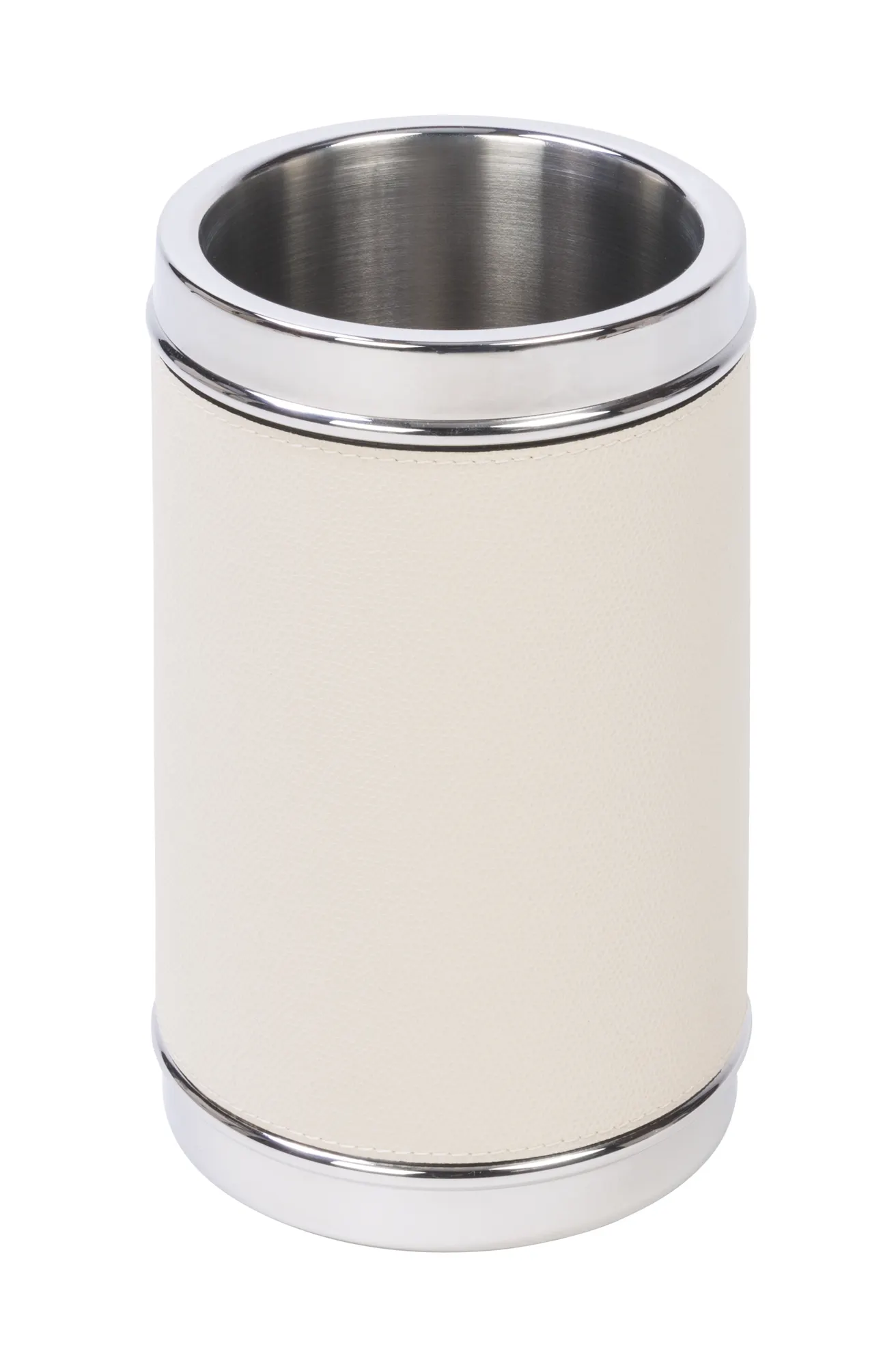 Partially leather-covered insulated double-chamber steel ice bucket with chrome-plated finish. Provided with lid.