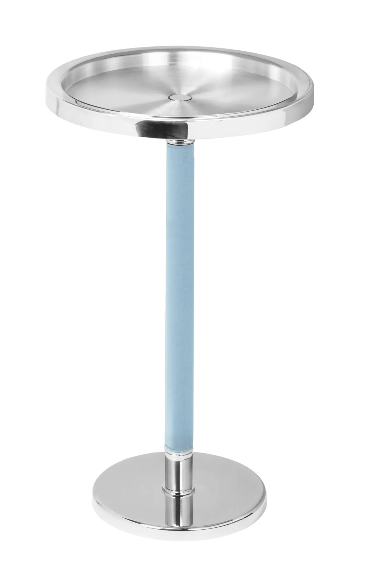 Stainless steel structure with a heavy solid base and leather-covered central column.