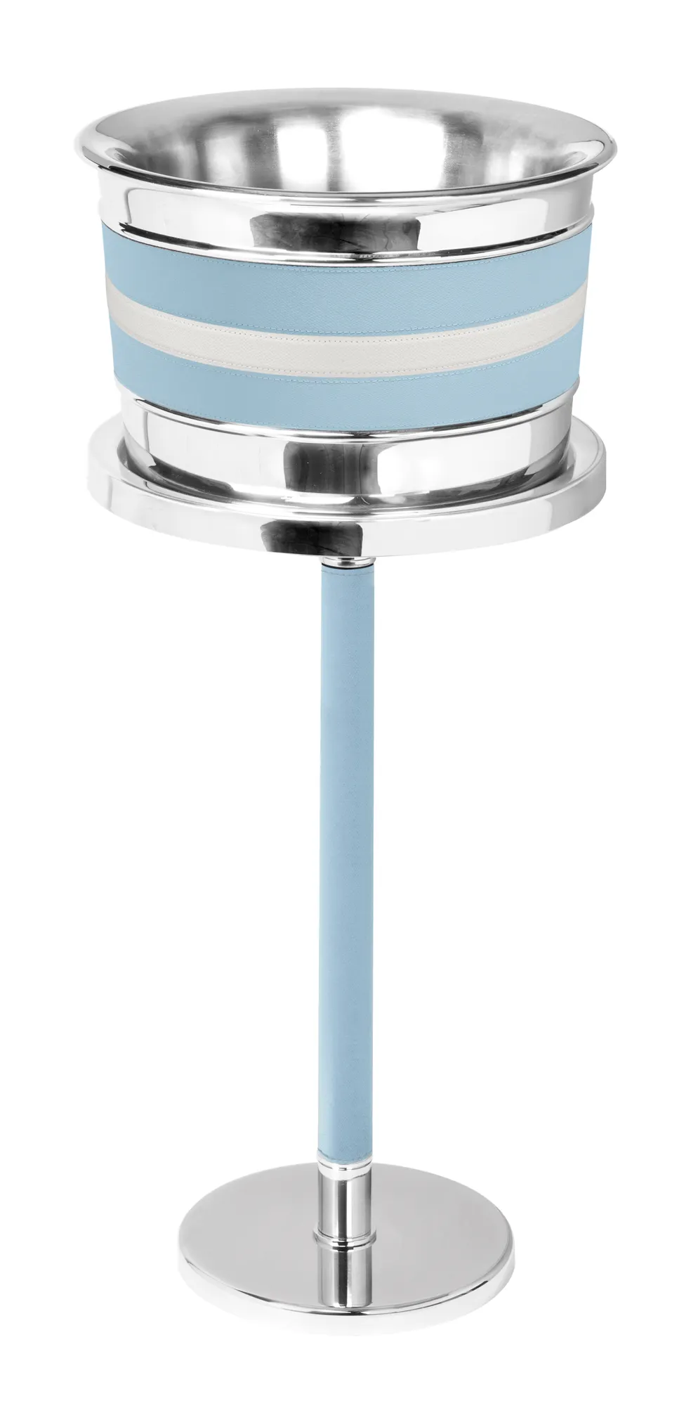 Stainless steel structure with a heavy solid base and leather-covered central column. Perfect in combination with our Ocean champagne bucket (TT070), but also able to host any other model with a maximum lower diameter of 20 cm.