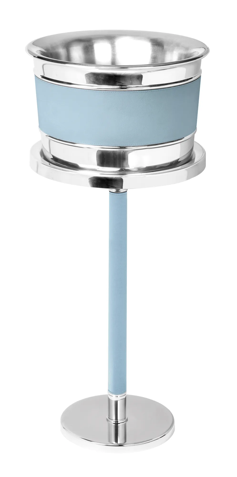 Stainless steel structure with a heavy solid base and leather-covered central column. Perfect in combination with our Ocean champagne bucket (TT070), but also able to host any other model with a maximum lower diameter of 20 cm.
