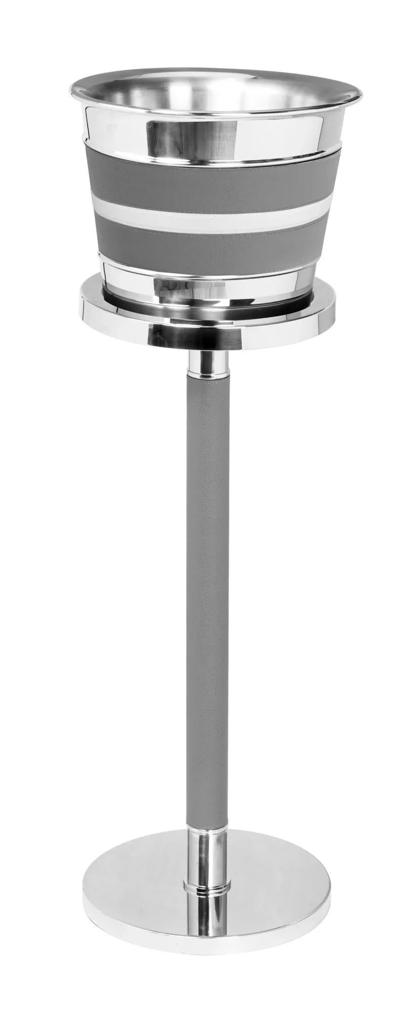Stainless steel structure with a heavy solid base and leather-covered central column. Perfect in combination with our Ocean champagne bucket (TT070), but also able to host any other model with a maximum lower diameter of 20 cm.