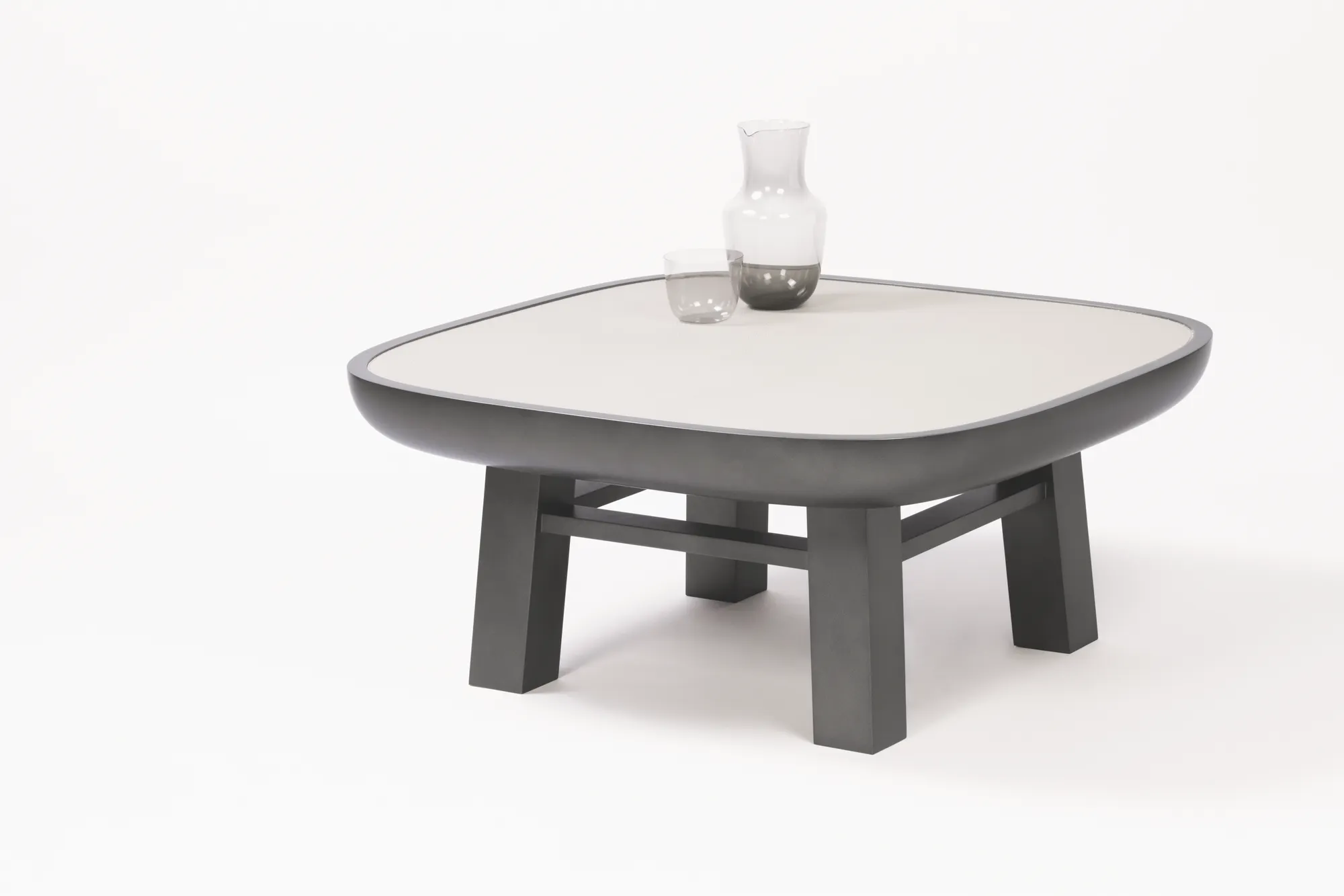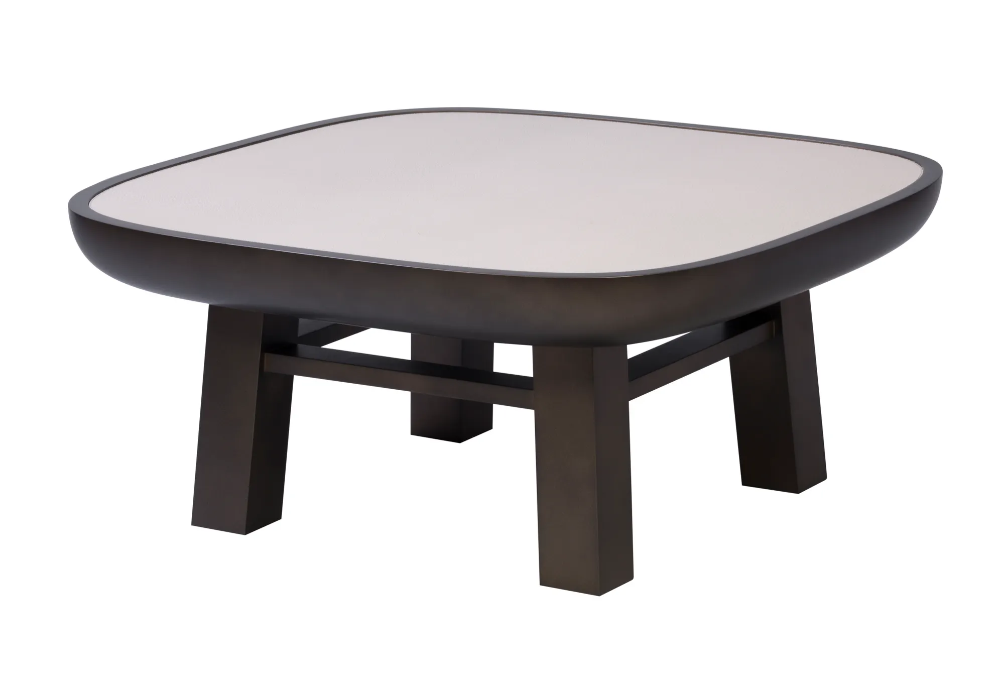 An extended collection of side tables and seats that mix hard and smooth materials such as travertine, suede, leather and bronze lacquered wood. The shapes evoke both the futuristic architectural ensemble of Oscar Niemeyers parliament of Brazil and the mild curves of oriental architecture.