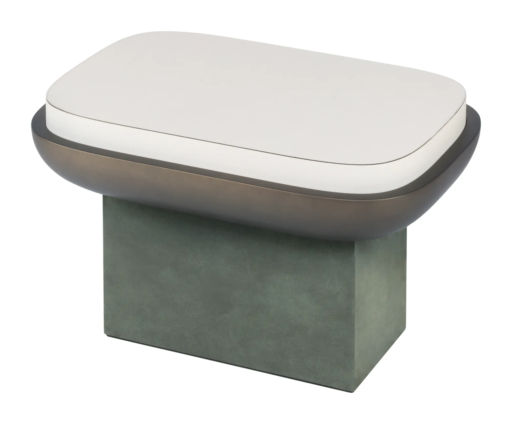An extended collection of side tables and seats that mix hard and smooth materials such as travertine, suede, leather and bronze lacquered wood. The shapes evoke both the futuristic architectural ensemble of Oscar Niemeyer’s parliament of Brazil and the mild curves of oriental architecture.