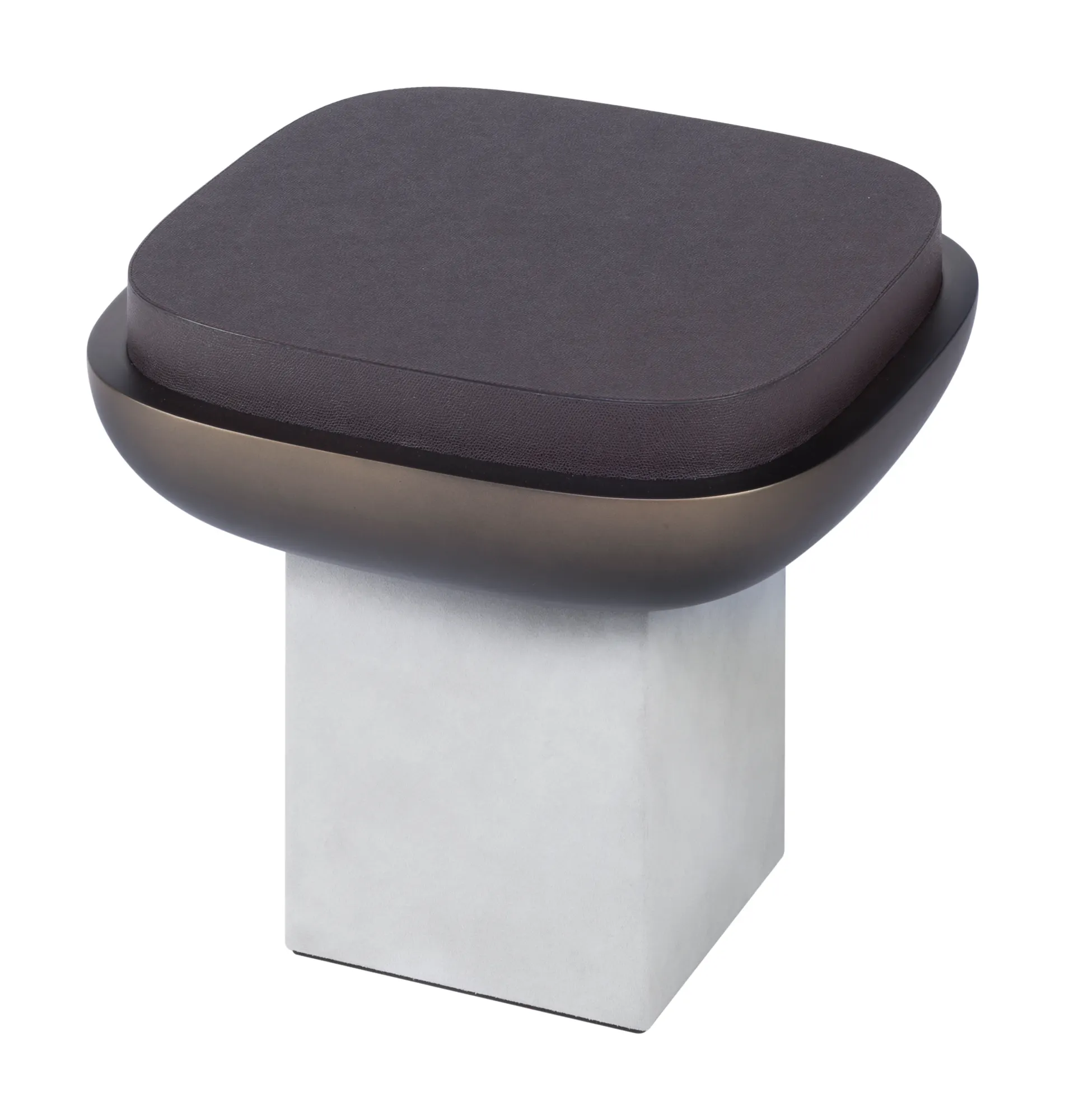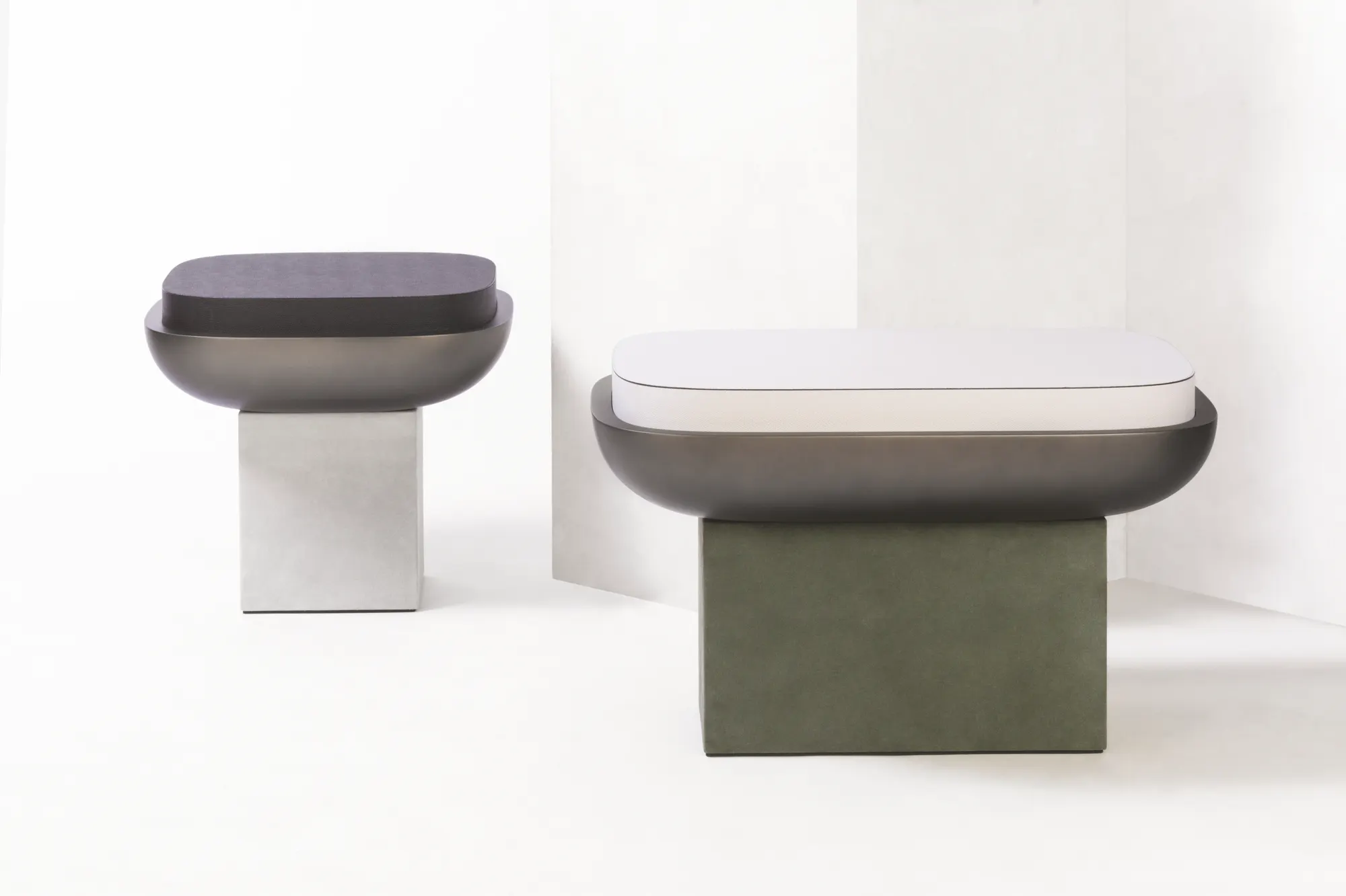 An extended collection of side tables and seats that mix hard and smooth materials such as travertine, suede, leather and bronze lacquered wood. The shapes evoke both the futuristic architectural ensemble of Oscar Niemeyer’s parliament of Brazil and the mild curves of oriental architecture.