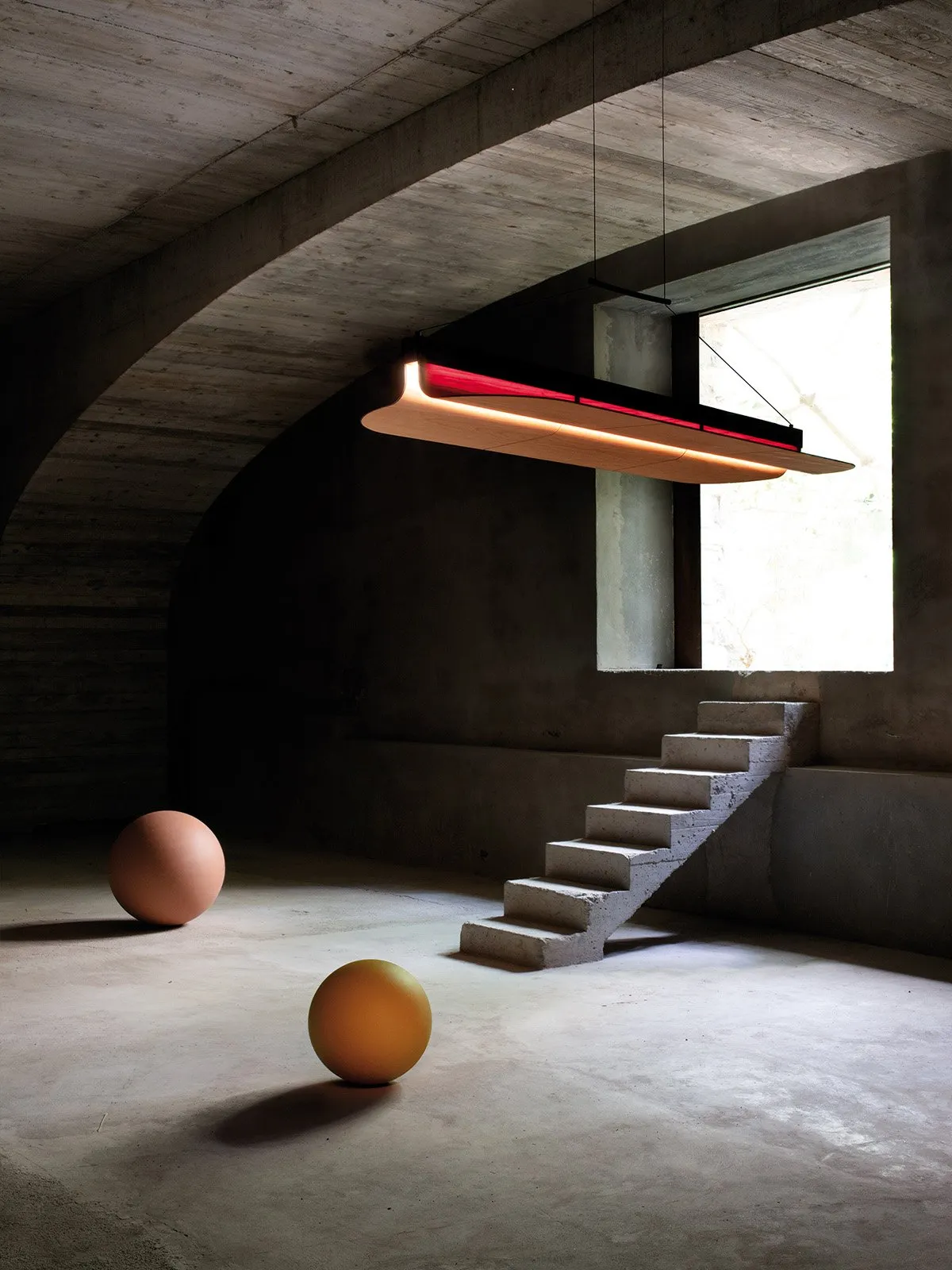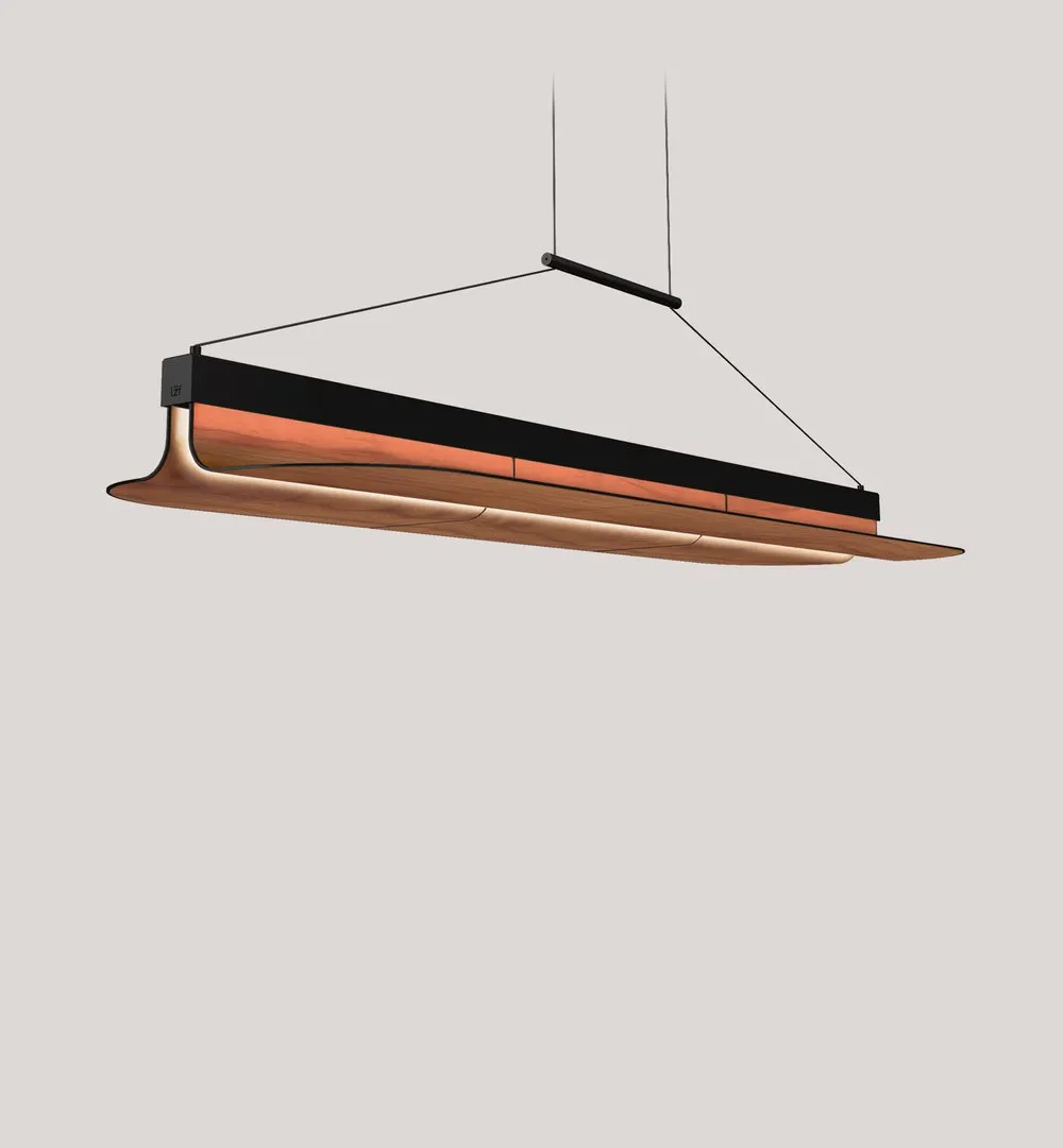 OMMA LONG LEAF LEAVES OF LIGHT. Omma is truly an inventive piece of lighting, combining wood veneer with a metal structure to create three-dimensional leaves of light. The Omma Long Leaf is very much a statement light. In Eli Gutierrez’s striking design, the lamp’s three-dimensional long leaf is eye-catching in its form and composition. The Omma Long Leaf lamp is available in one wood veneer: Natural Cherry. Is metal finishes are Matt Black and Gold.