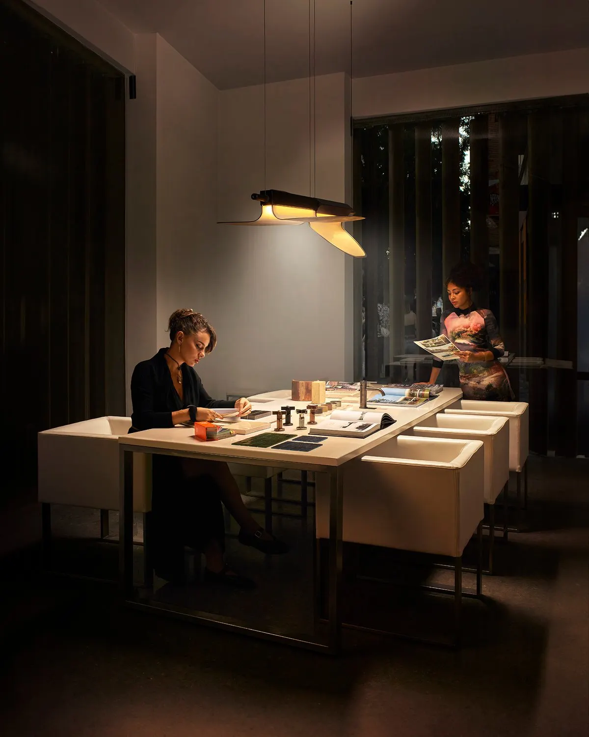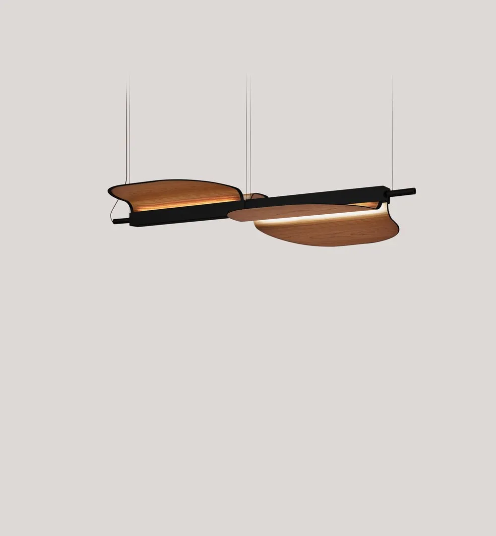 OMMA LEAVES OF LIGHT. Omma is truly an inventive piece of lighting, combining wood veneer with a metal structure to create three-dimensional leaves of light. The Omma suspension lamp is available with two leaves and double-two leaves. In Eli Gutierrez’s striking design, each individual leaf rotates up to 180º, allowing the user to create a range of lighting moods. The Omma suspension lamp is available in three wood veneers: Natural Cherry, Natural Beech, and Natural White. Is metal finishes are Matt Black and Gold.