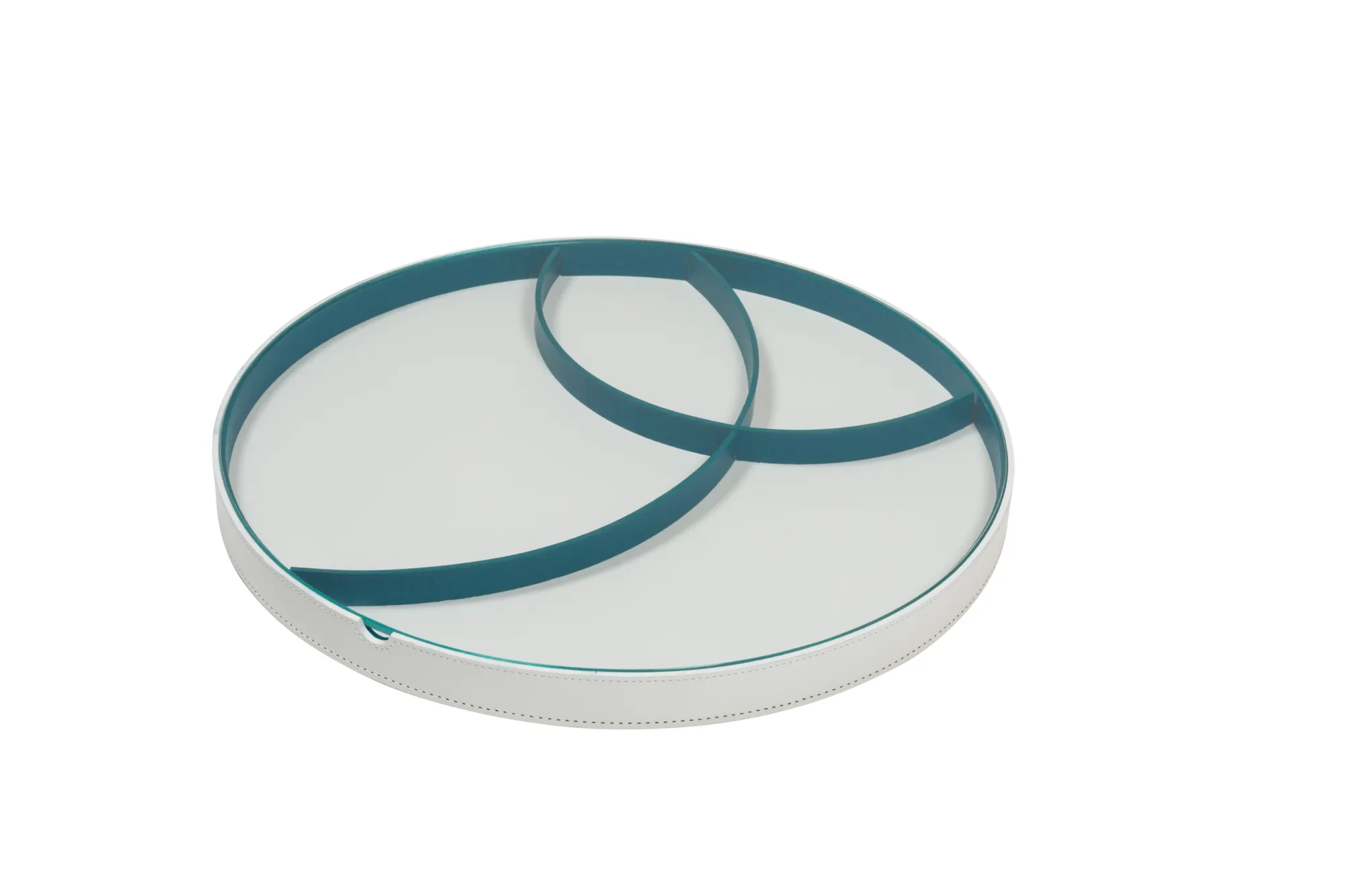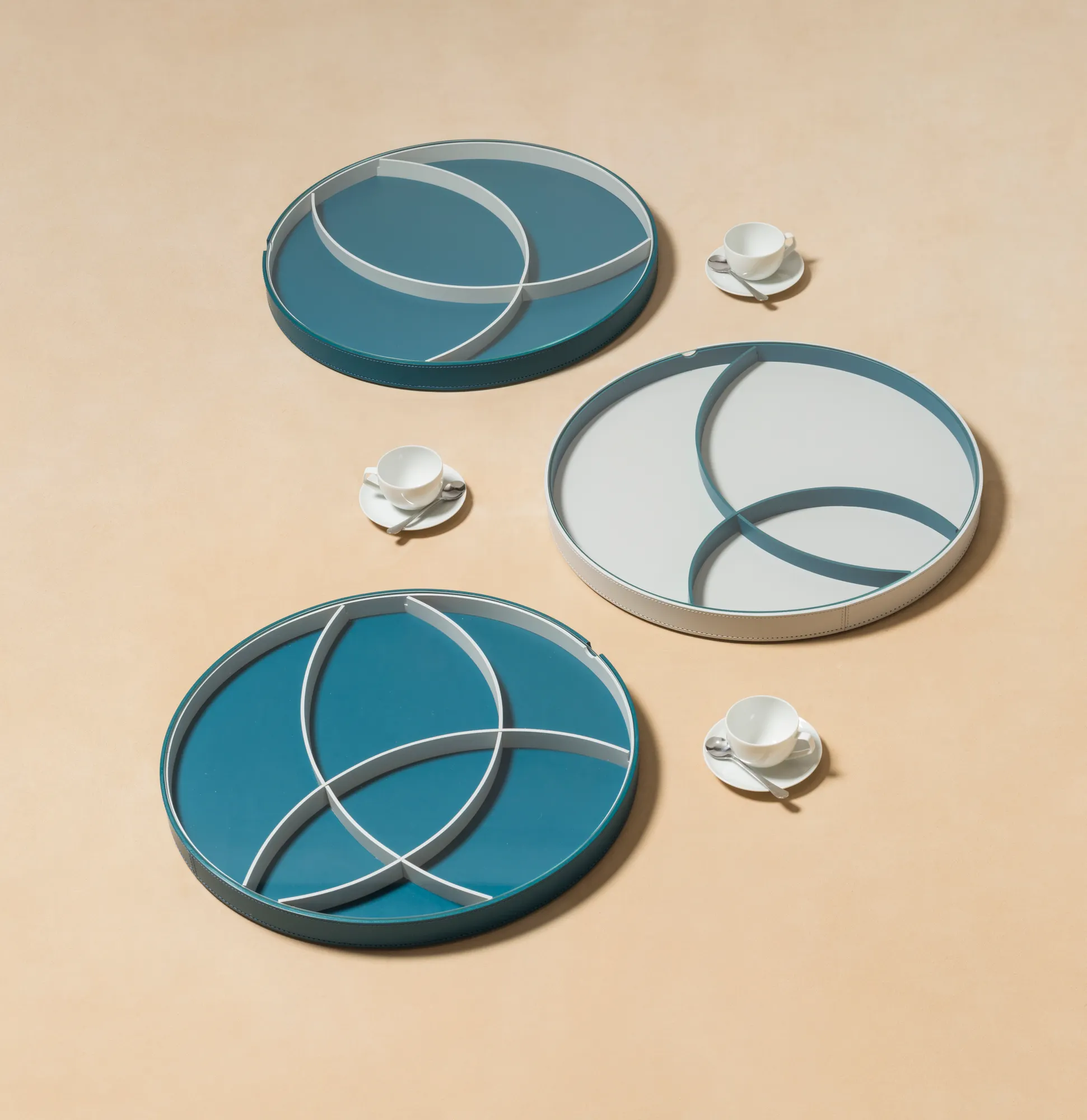 Finest regenerated reinforced leather trays with water-resistant and UV-resistant finish. The surface on top, made of extra clear glass, lets the underlying supporting elements be seen, making them not only functional, but uniquely decorative as well.