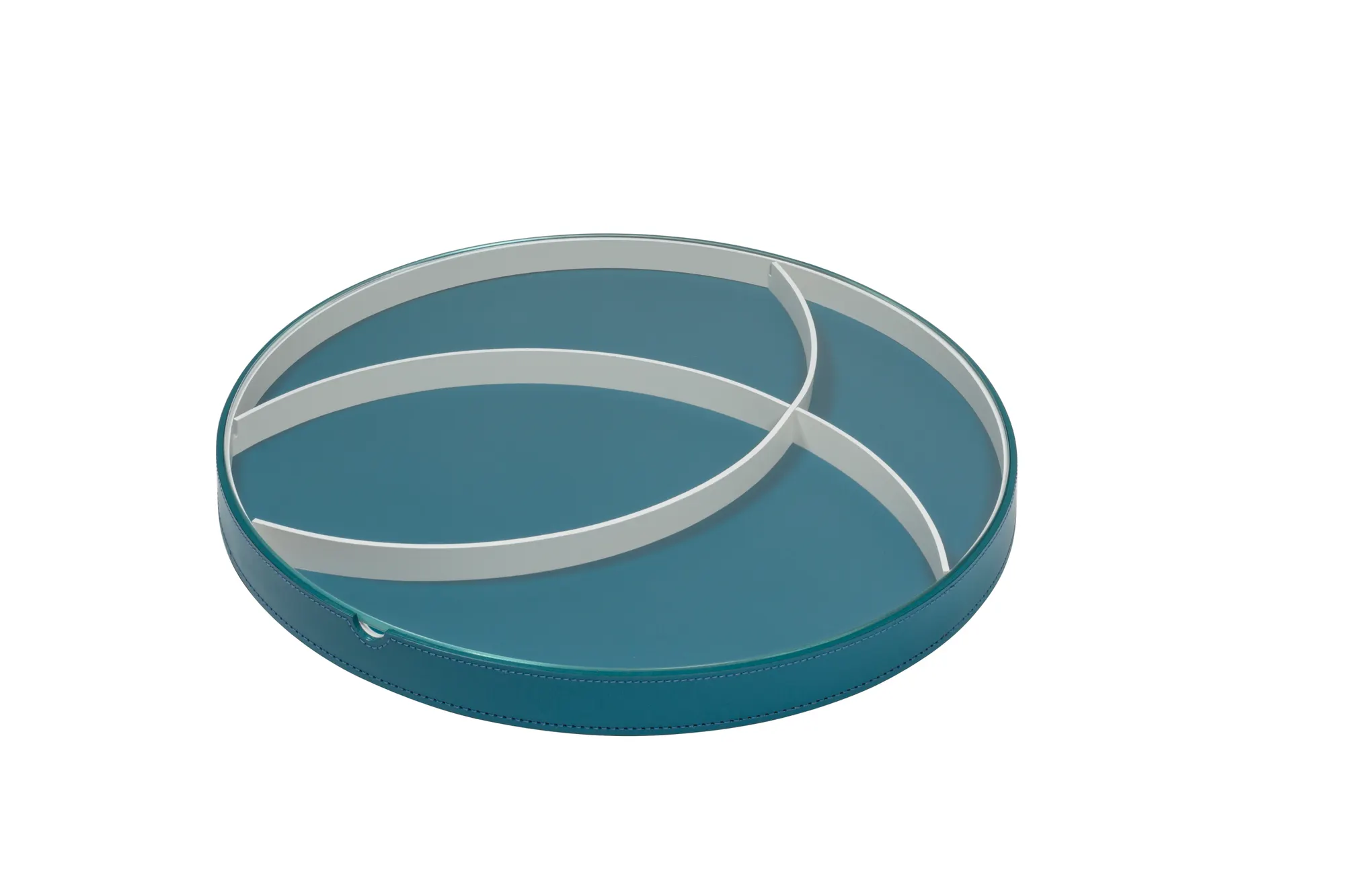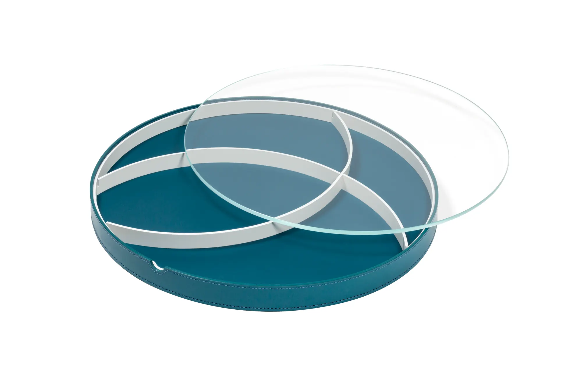 Finest regenerated reinforced leather trays with water-resistant and UV-resistant finish. The surface on top, made of extra clear glass, lets the underlying supporting elements be seen, making them not only functional, but uniquely decorative as well.