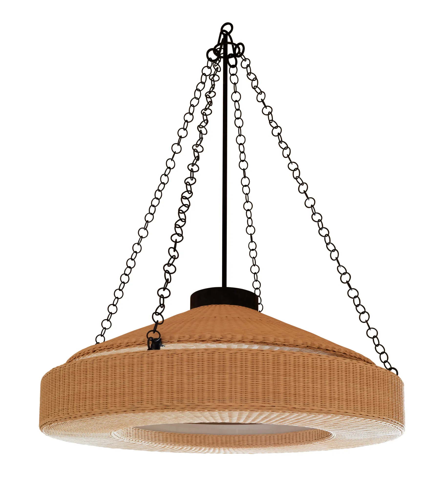 Featuring an essential conic shape, the massive volume of the Orion chandelier is rendered weightless by the use of the finest, meticulously handwoven rattan. Hanging from sturdy chains made with burnished brushed bronze, this piece boasts captivating contrasts of materials, weights, shades and textures. Custom sizes available on request.