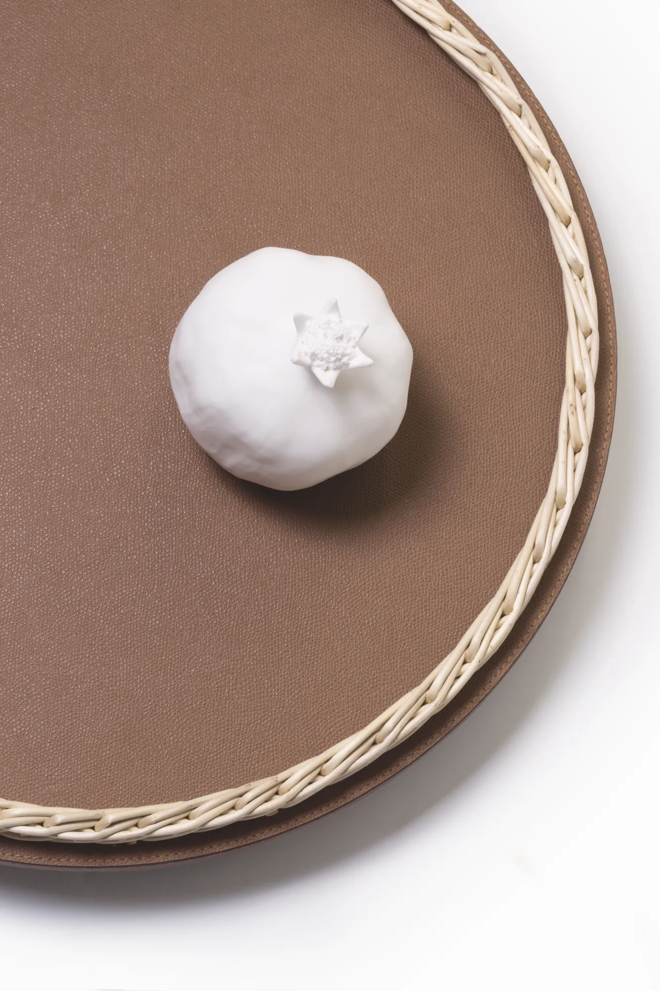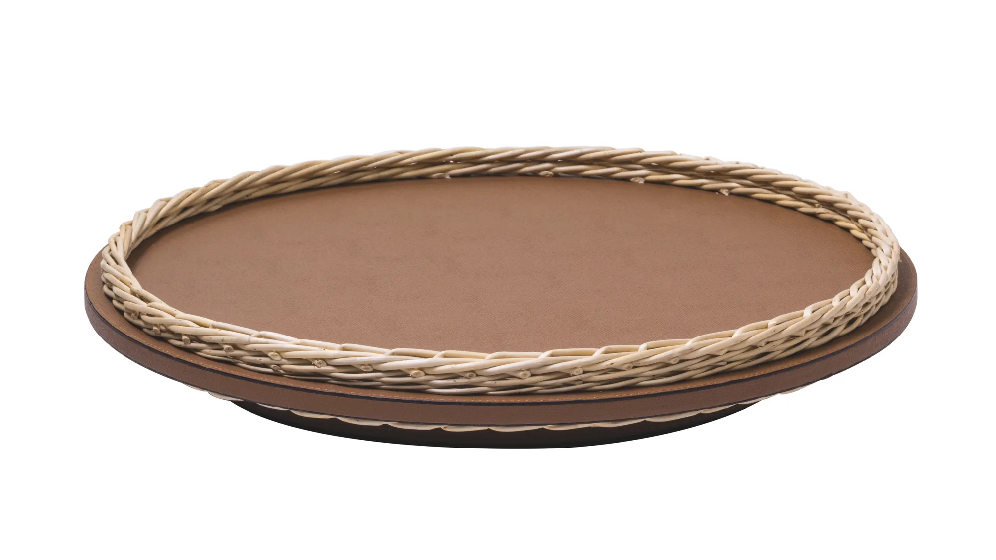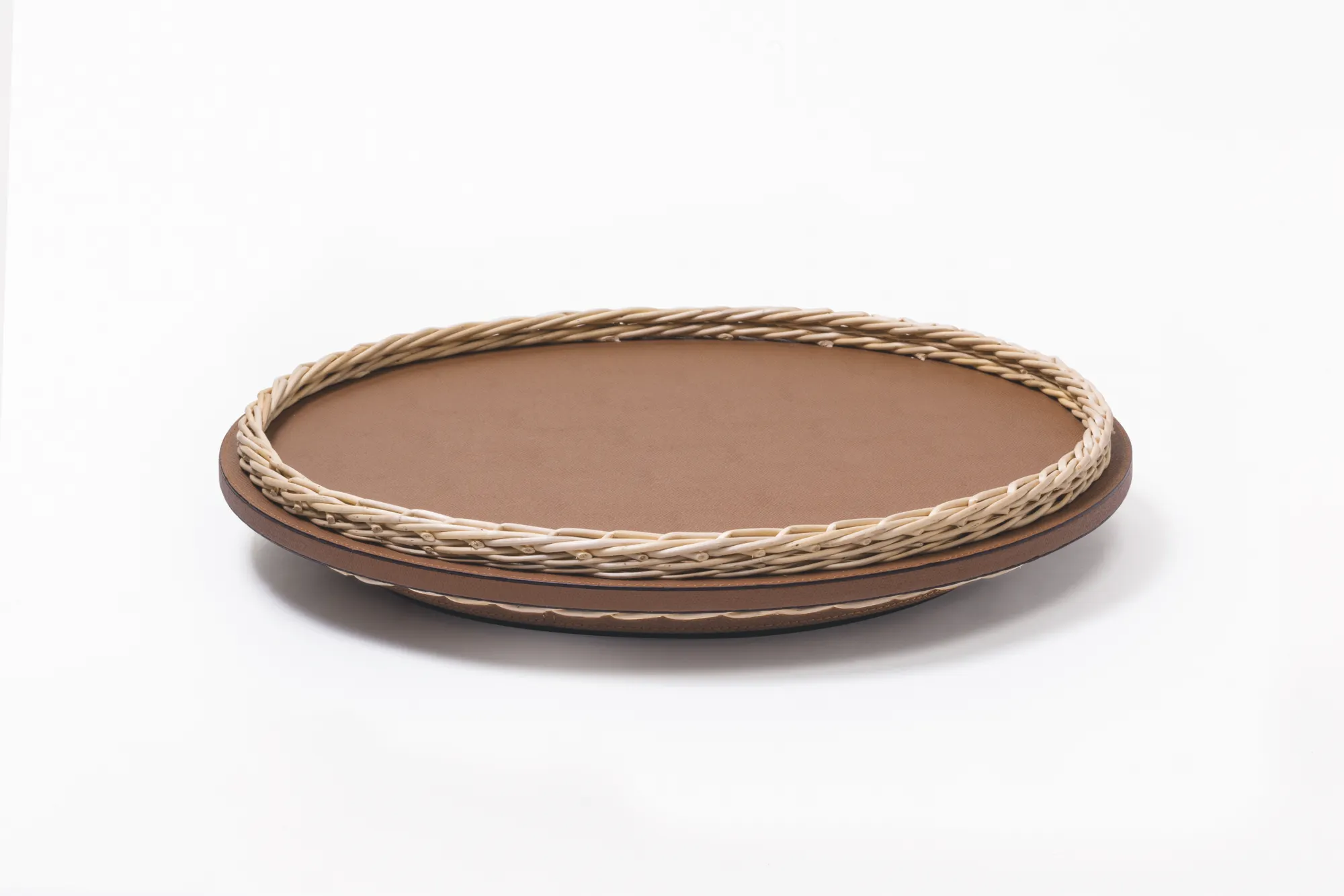 Rotating round tray with leather covered wood structure and woven willow frame.