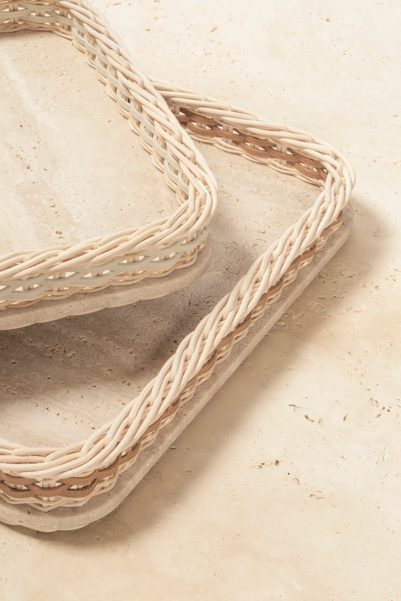 Travertine structure featuring a woven leather and rattan frame.