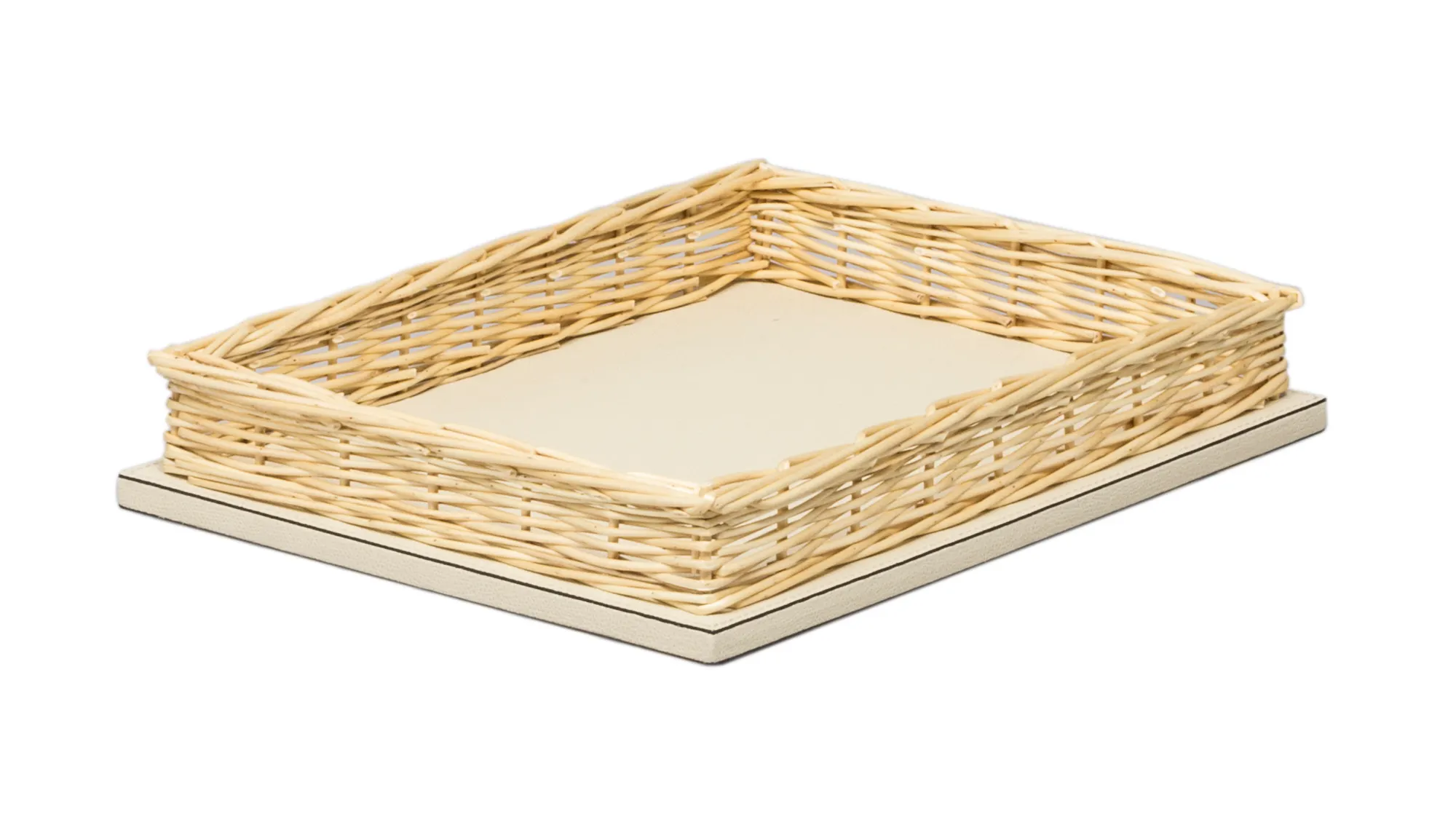 Leather covered wooden structure enriched by a woven willow frame.