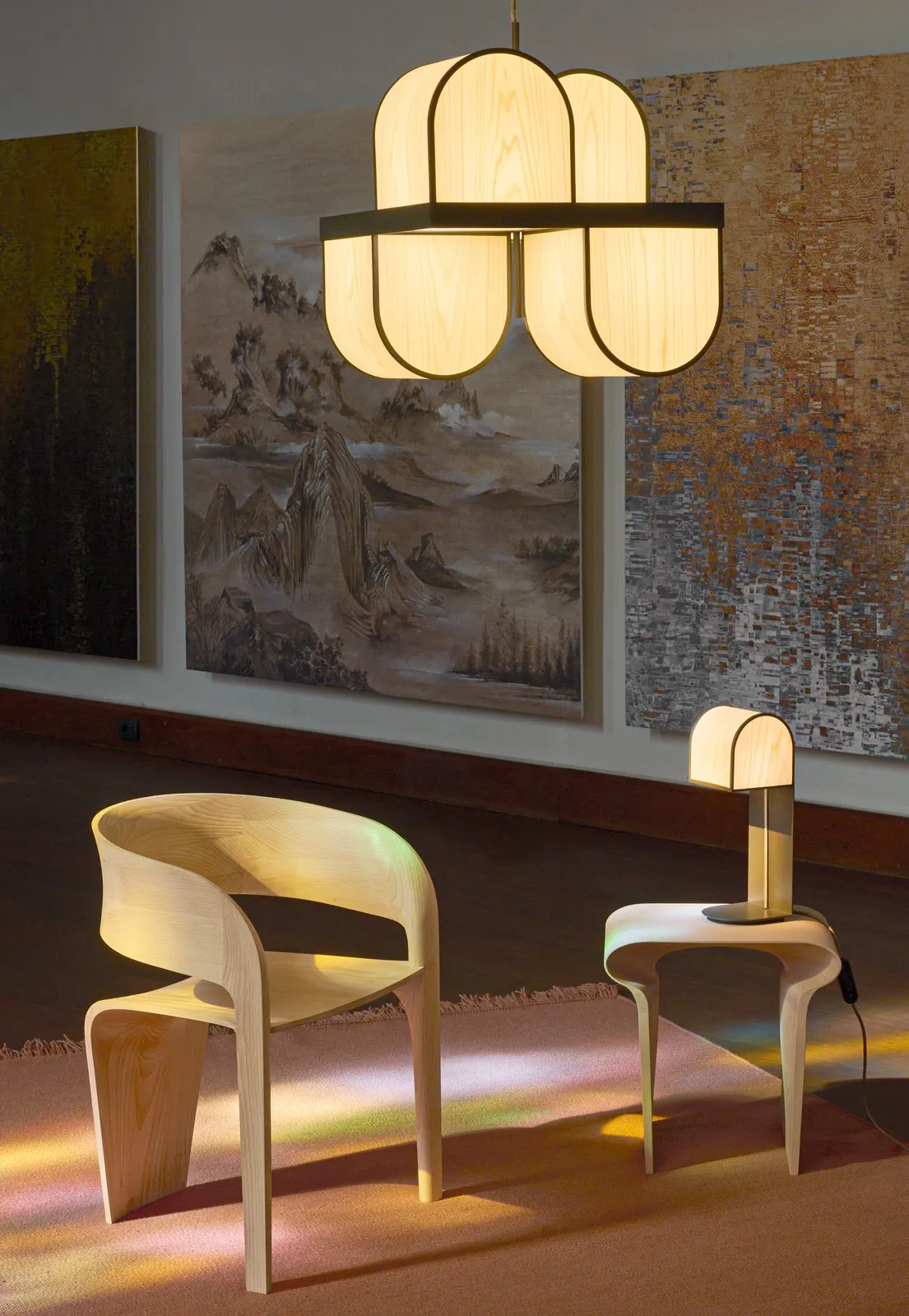 OSCA SMALL THE CUBIST LIGHT. Osca is an architecturally inspired lamp with a cubist aesthetic. In the Osca suspension lamp, simple, interlocking three-dimensional wood veneer arches face both upwards and downwards, giving the lamp a uniquely sculptural form. Designed by Bodo Sperlein, Osca is a minimal collage of shapes. The Osca family consists of two suspension versions and one table lamp. The small suspension lamp is formed by four cubes and a square geometry.