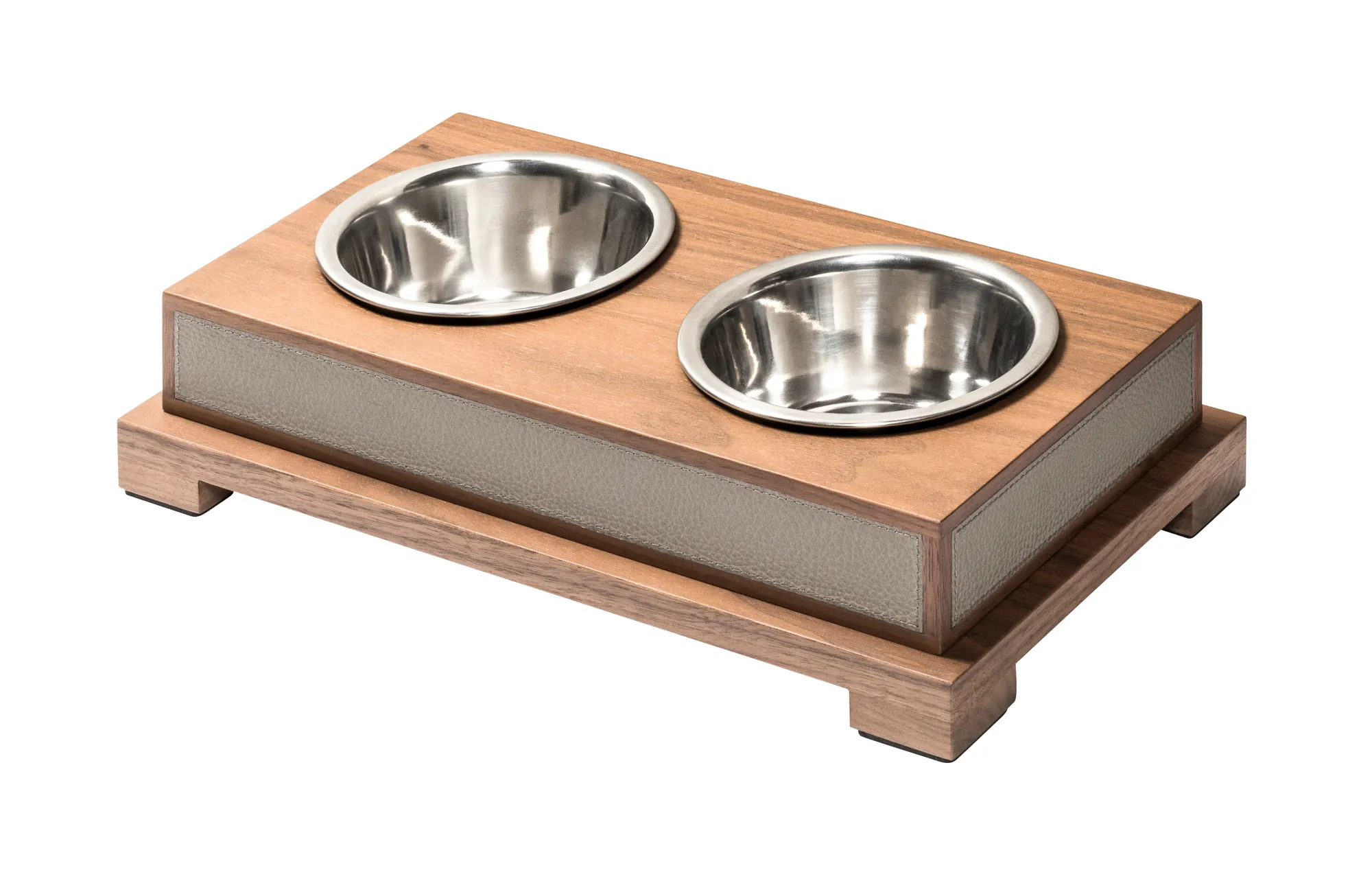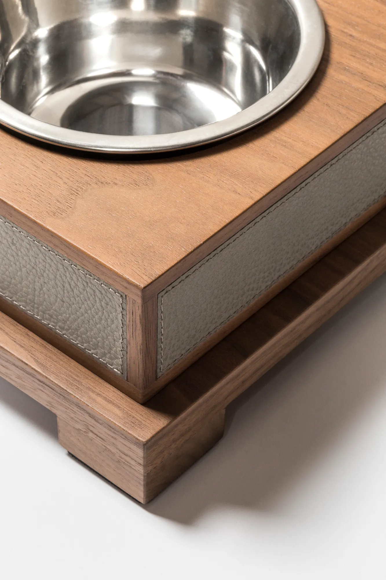 Wood structure available in different finishes featuring leather inserts. Removable stainless steel bowls for an easy cleaning.