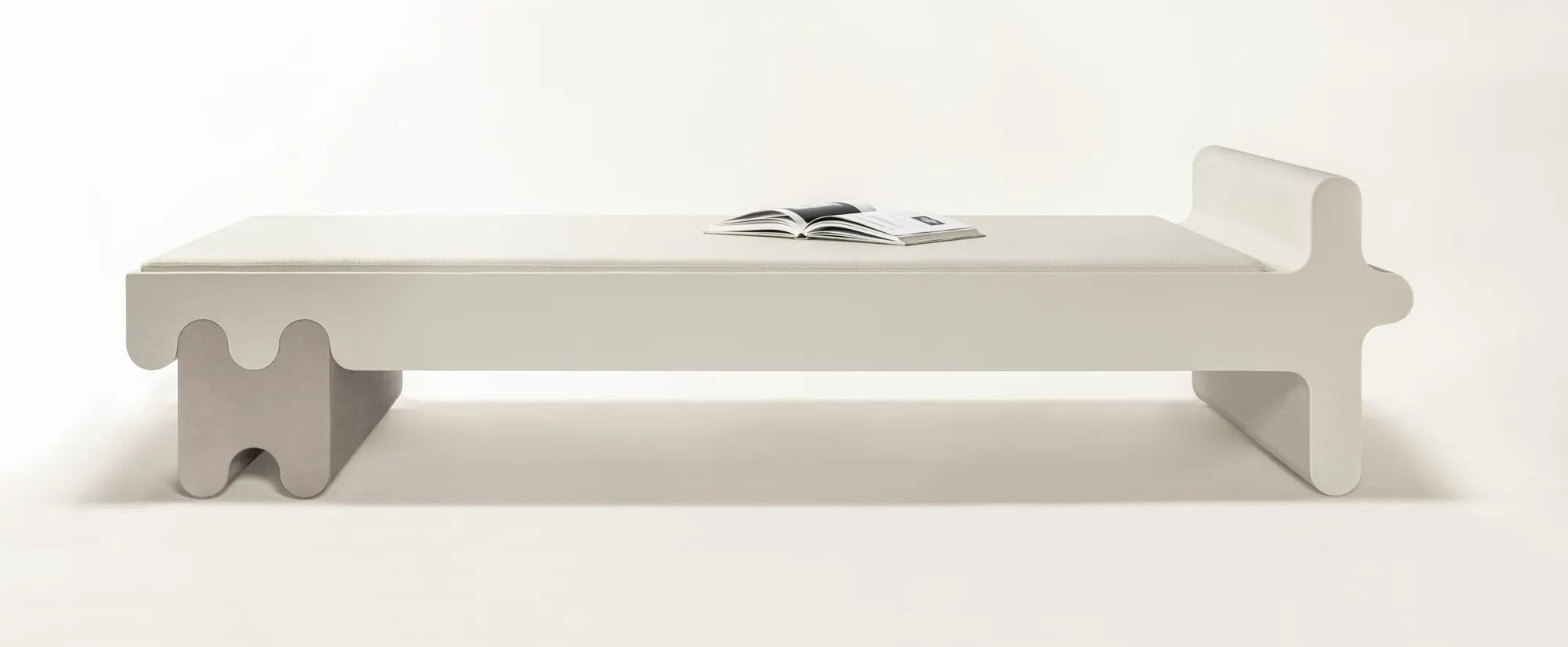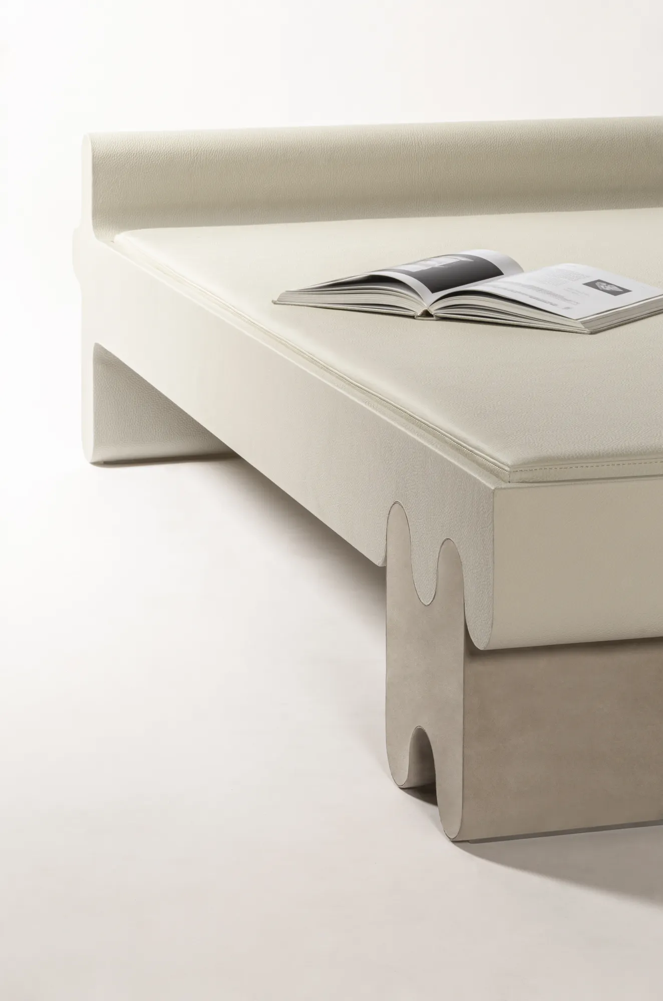 Ossicle is a collection that comprises monolithic seats, benches and tables crafted with a carefully selected range of leather and marble colors and finishes. Their monumental volumes originate from both primal monolithic and contemporary minimal features entwined, while the lines are a reference to the 'Jeu des Osselets', which has roots dating back to ancient Greece and Rome, reinterpreting it according to a modern visual and a sharp humour, creating the perfect balance between organic and pure geometric shapes. Leather-covered wood structure.