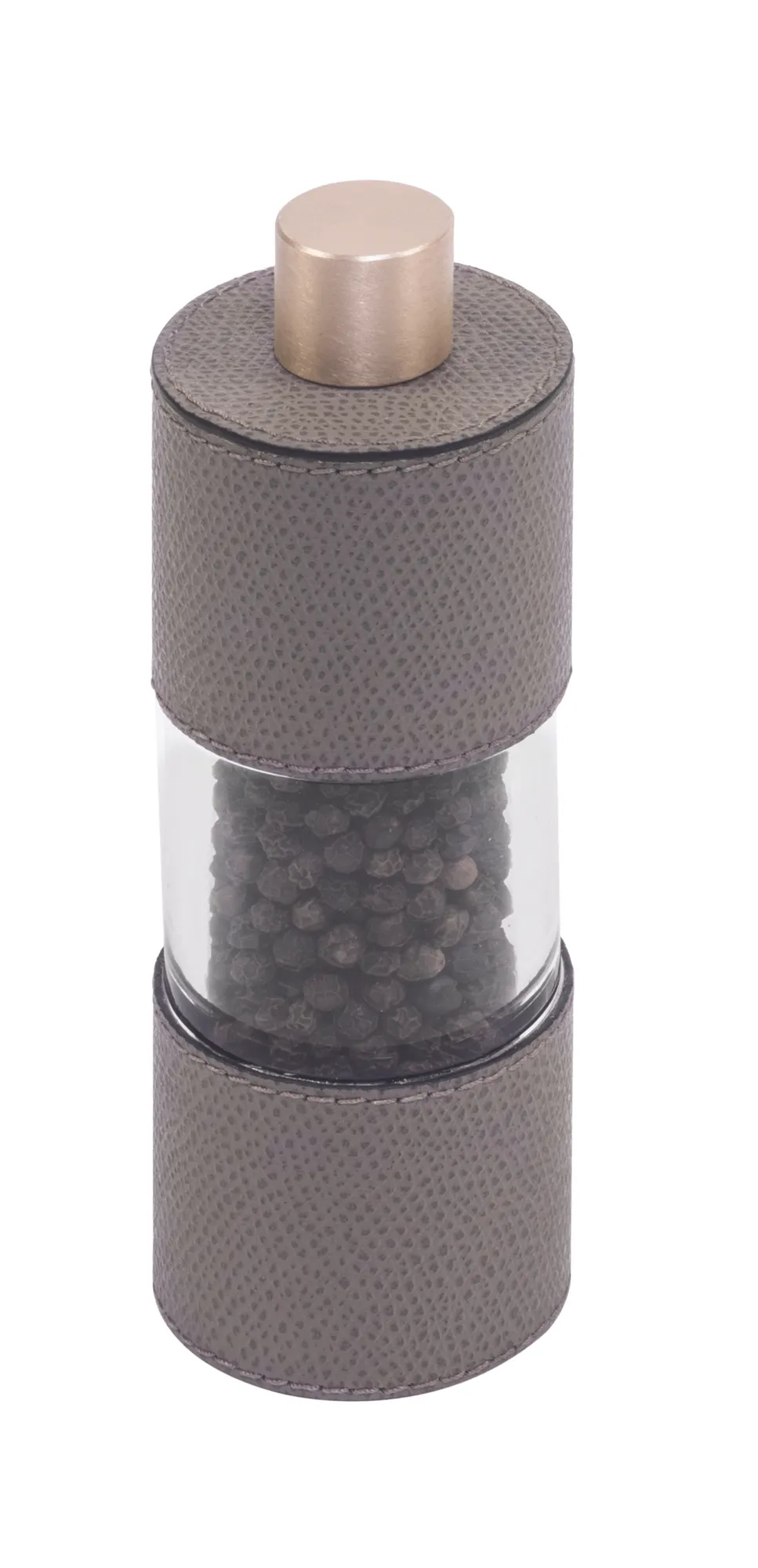 Leather-covered stainless steel structure with metal knob. Thanks to the special ceramic grinder, it can be easily used for salt or pepper. Continuous grinding adjustment from fine to coarse.