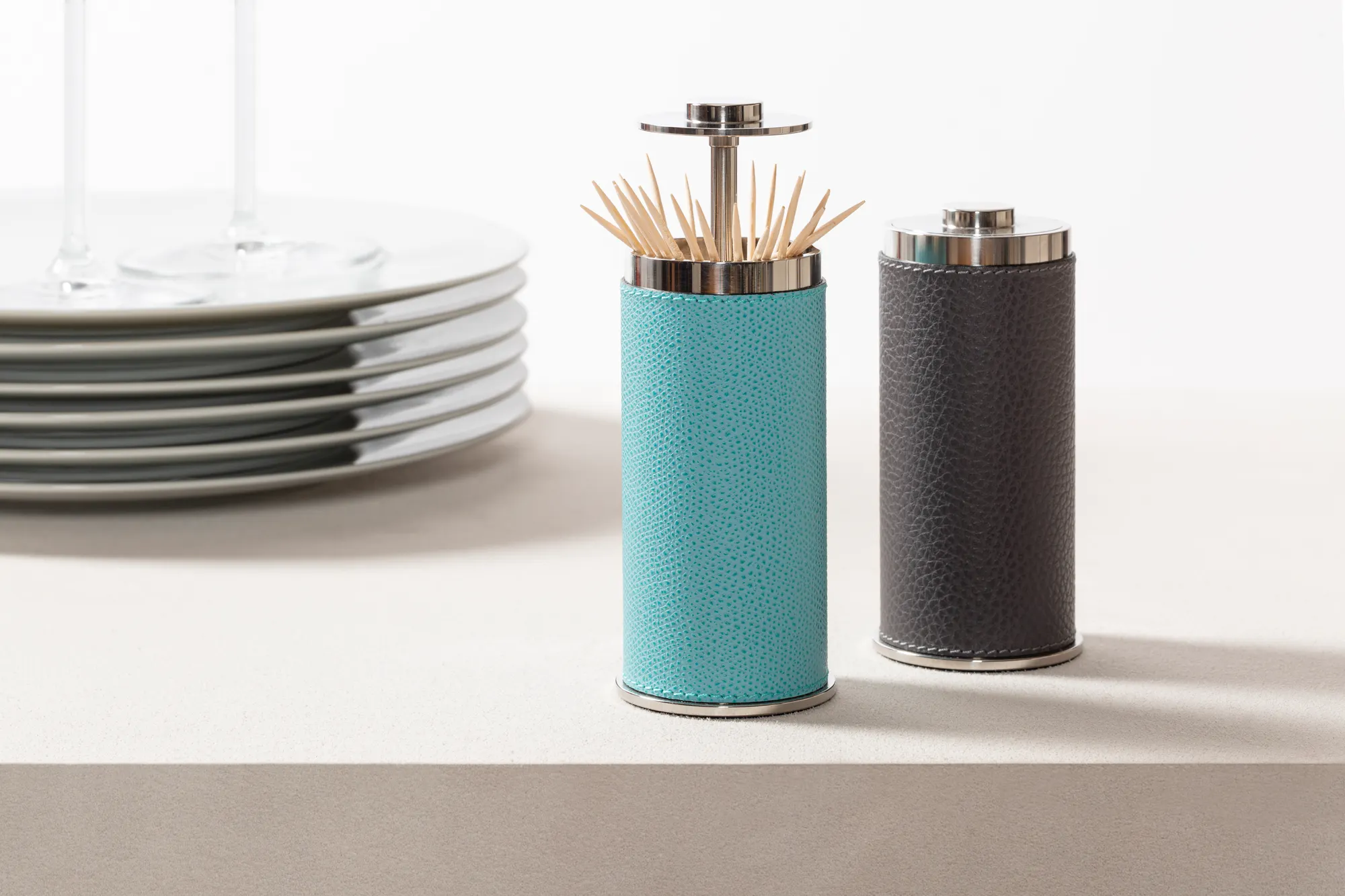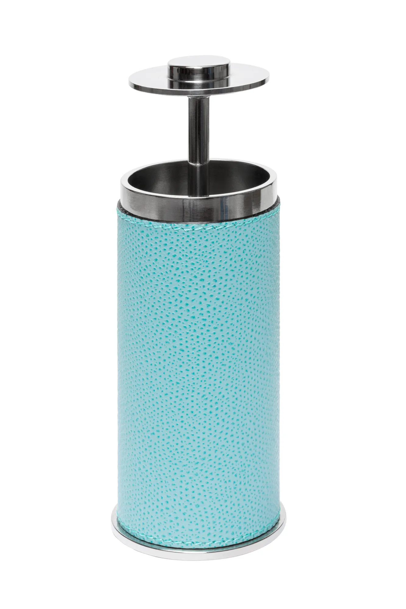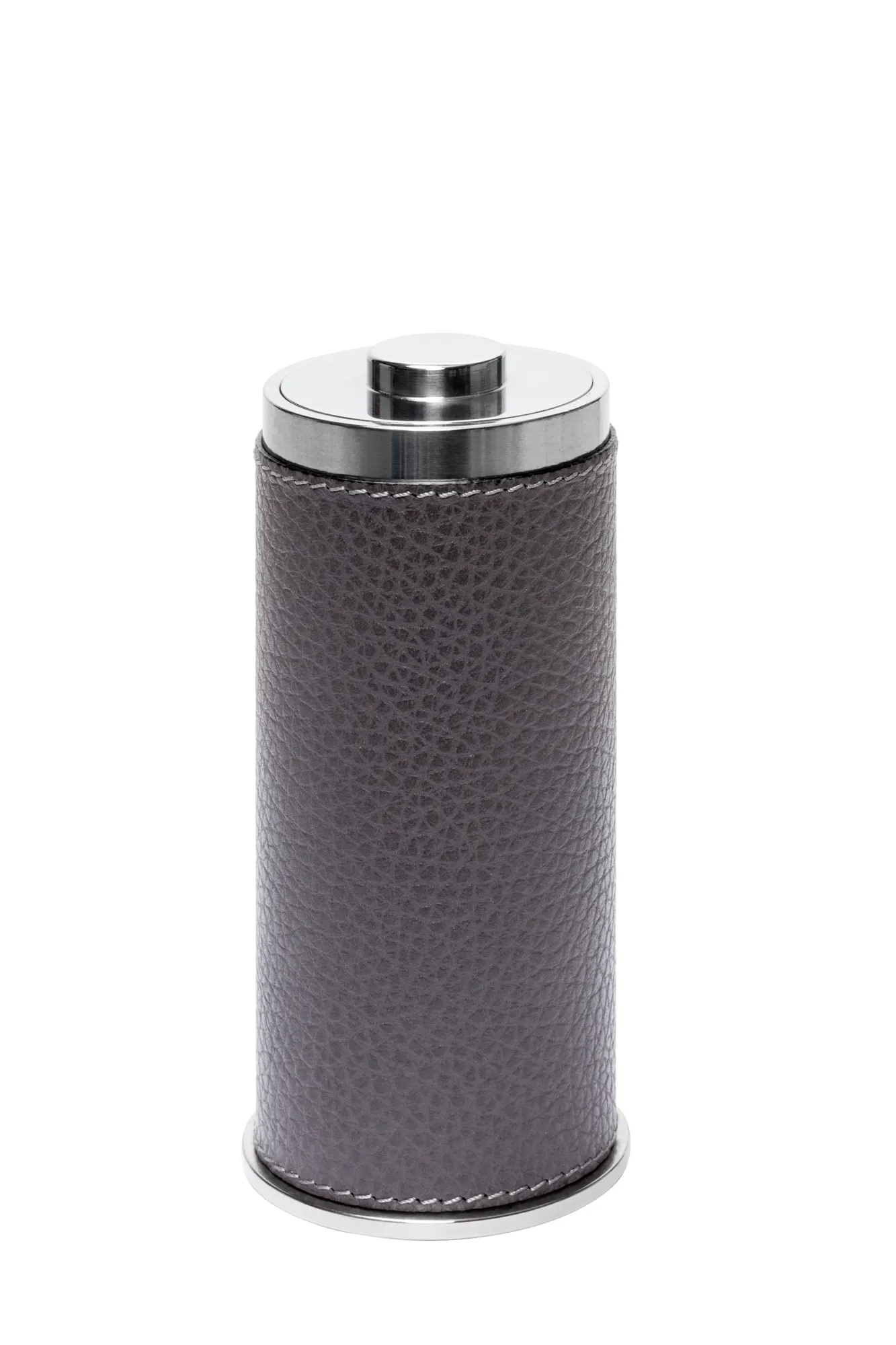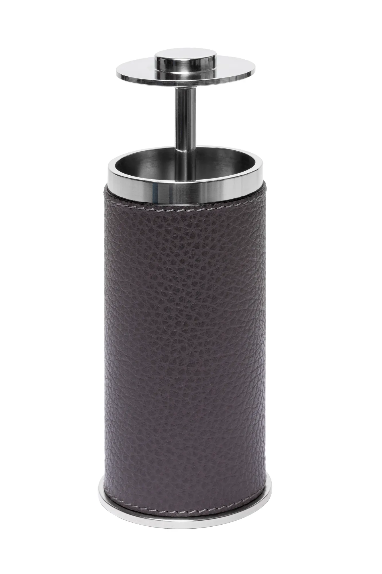 Partially leather-covered stainless steel structure. Its discreet design features a push-button top to allow easy access to the dispenser.