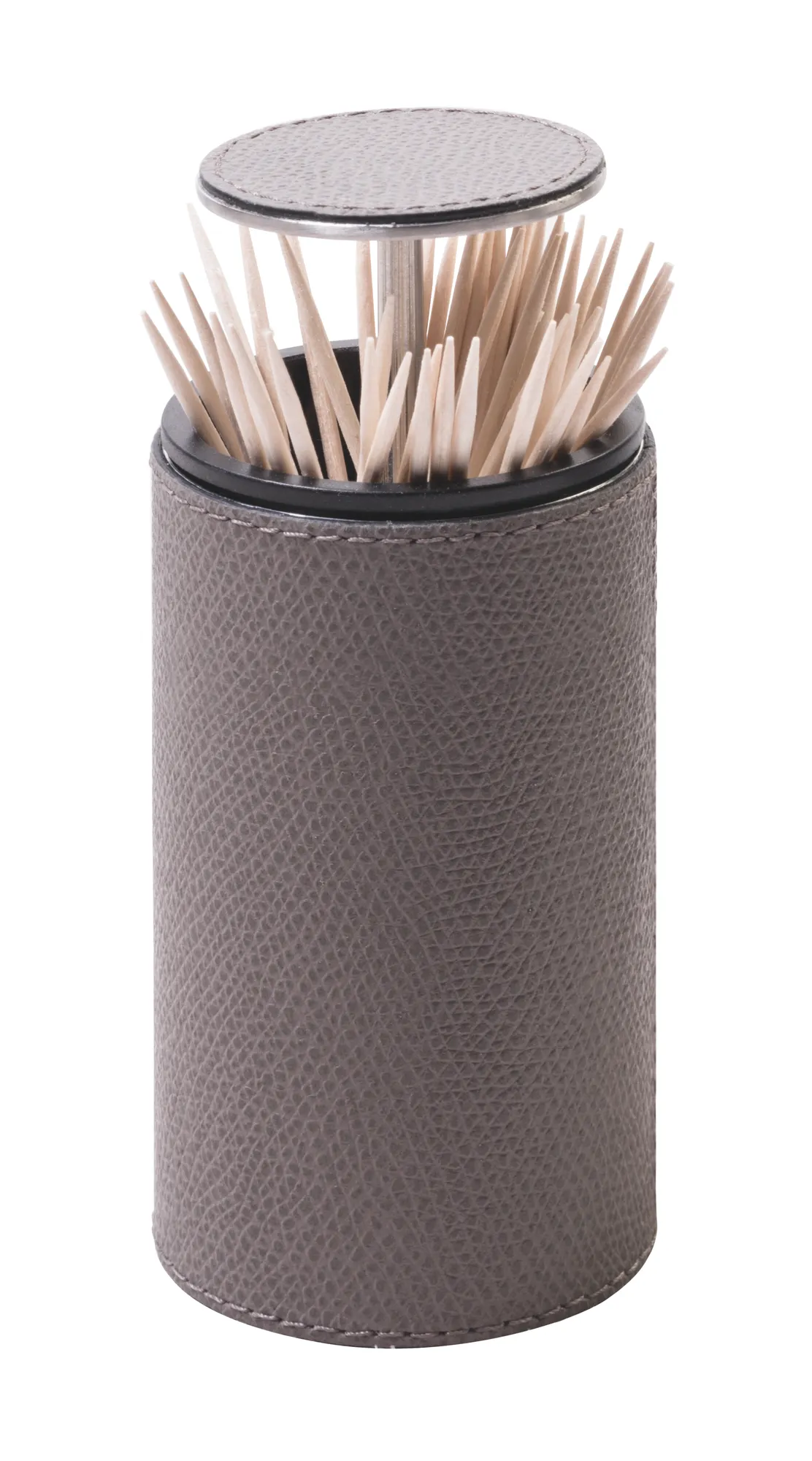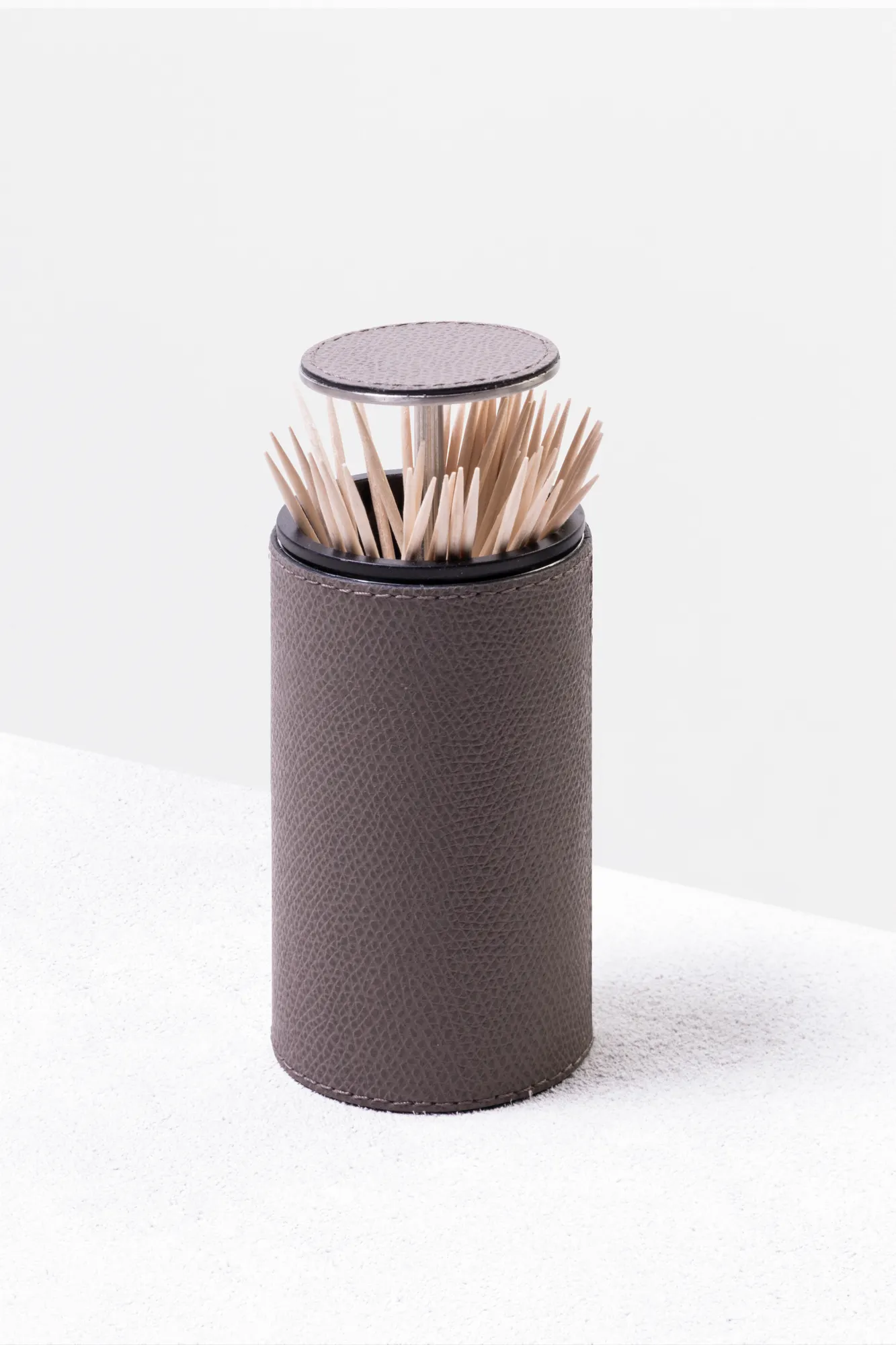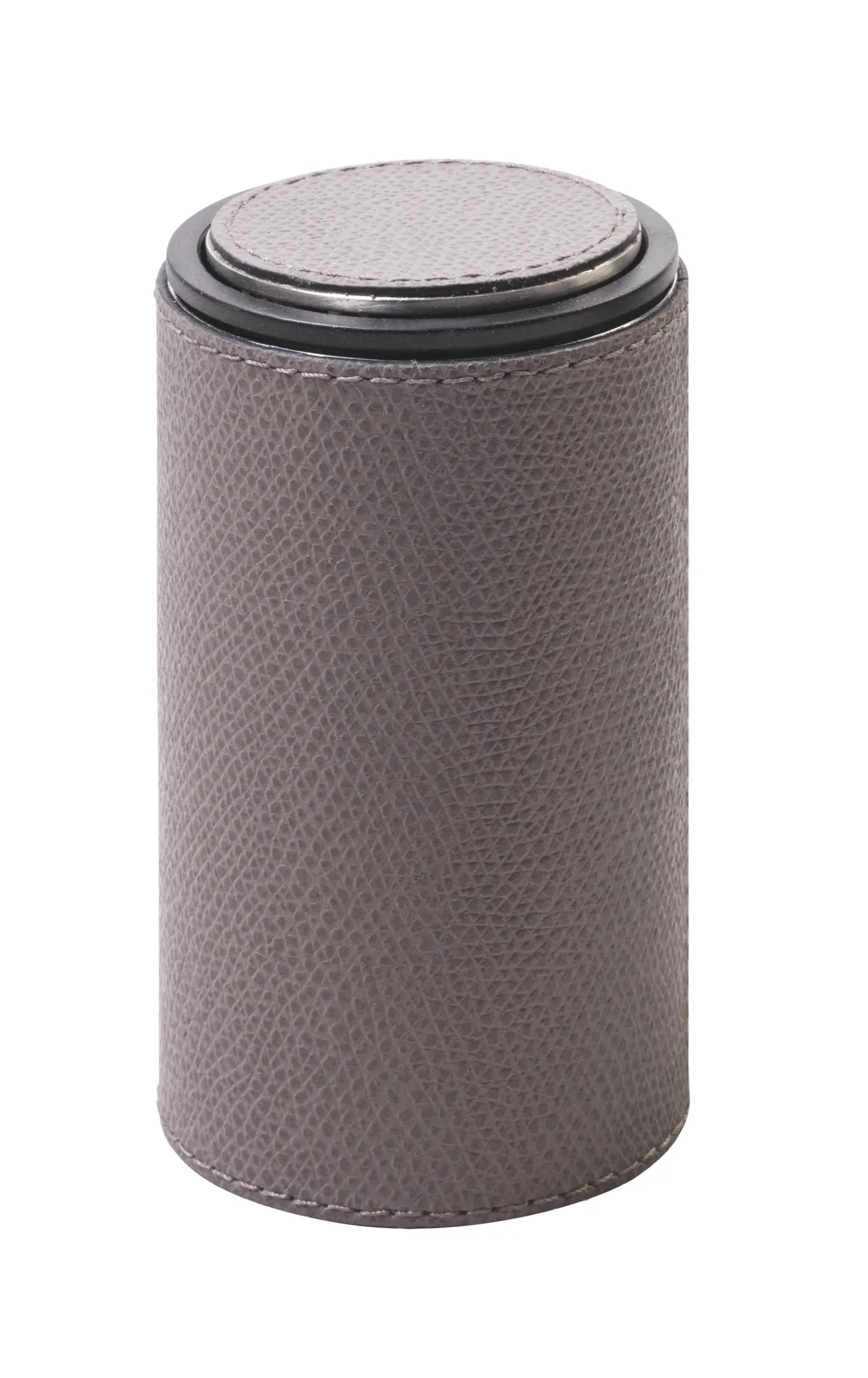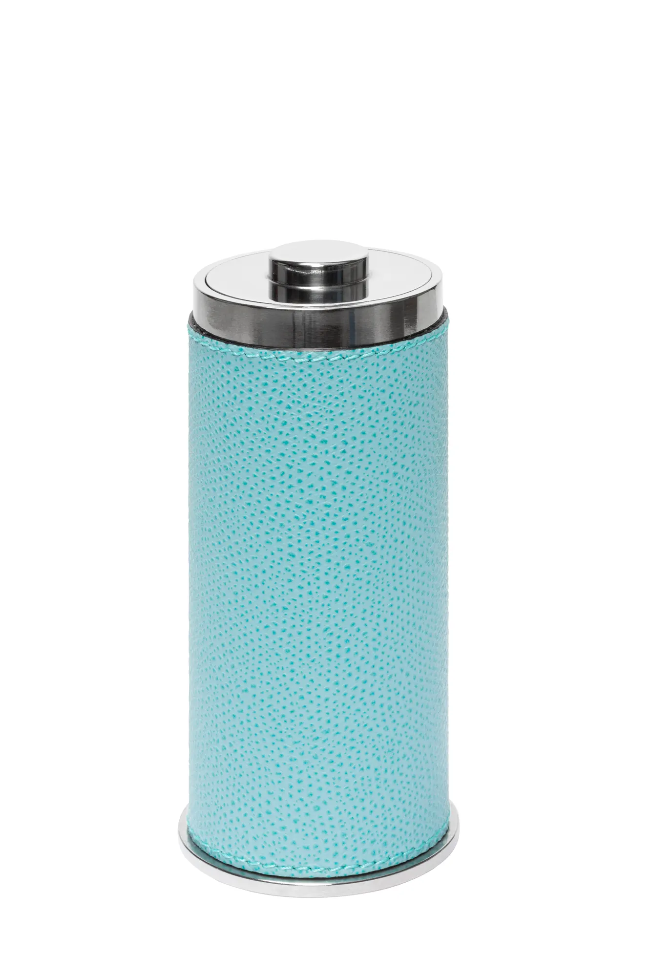 Partially leather-covered stainless steel structure. Its discreet design features a push-button top to allow easy access to the dispenser.