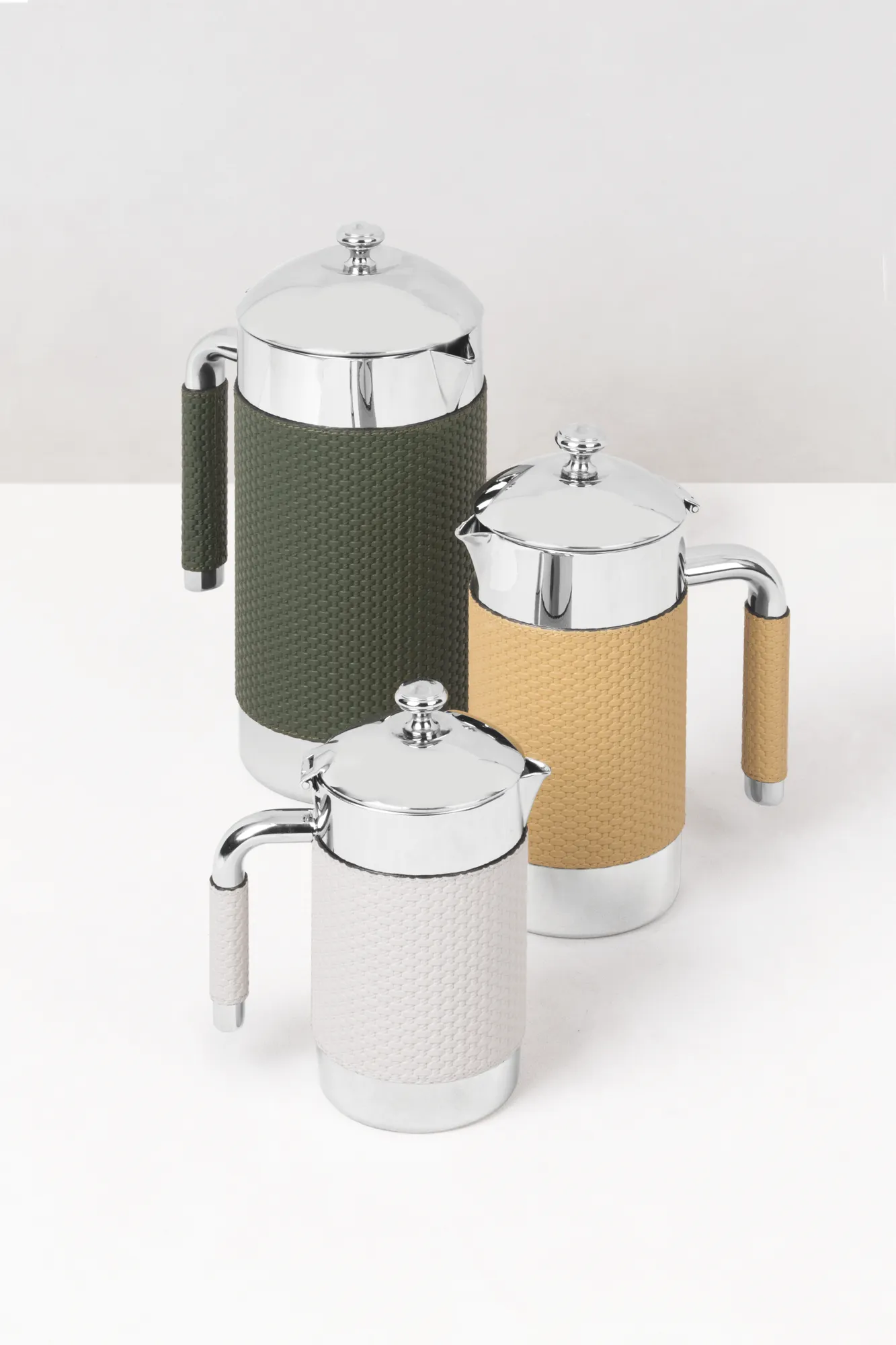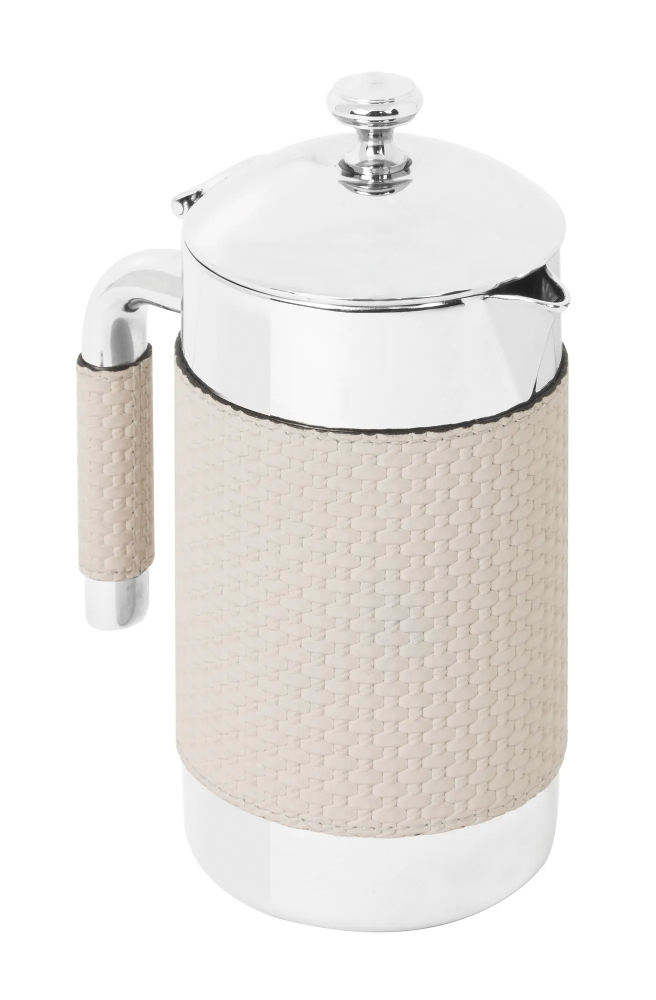 Partially leather covered insulated polished stainless steel carafe. Provided with hinged lid. Maintains liquids’ temperature warm and cold.