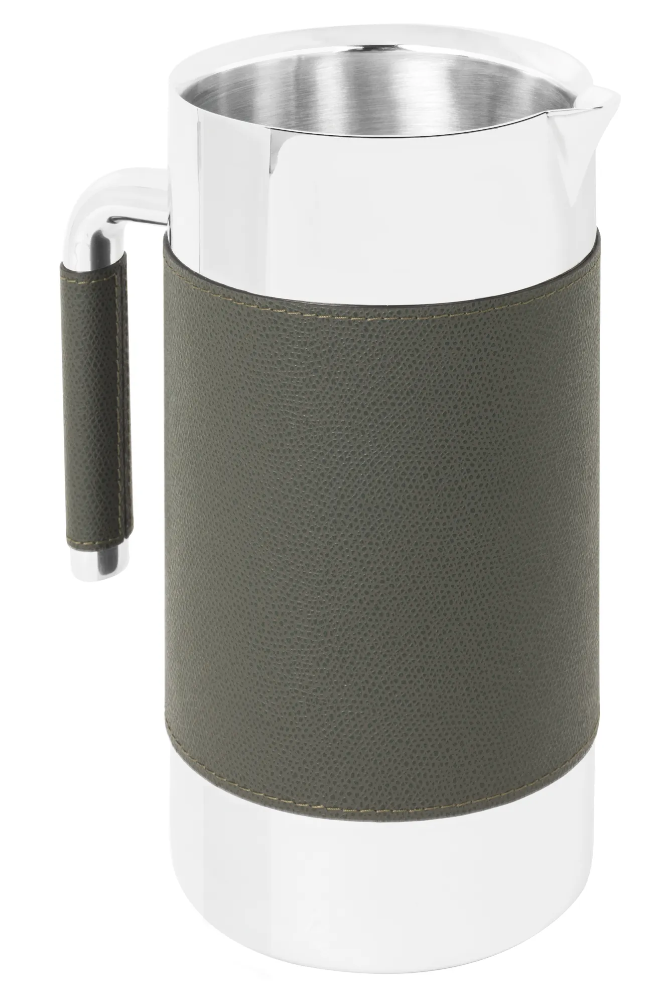 Partially leather covered insulated polished stainless steel pitcher. Maintains liquids temperature warm and cold.