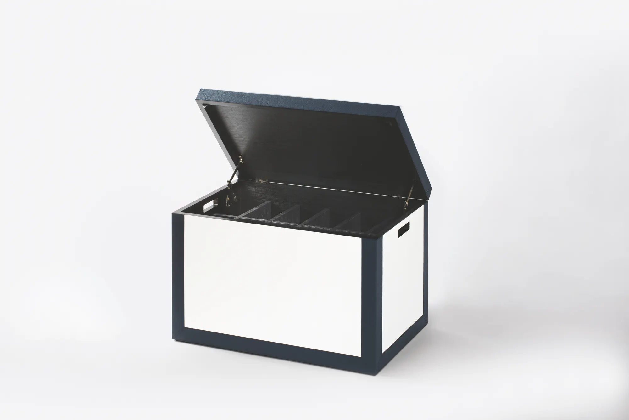 Leather covered marine plywood structure with side handles. Wenge finished wood inside. Adjustable divisions suitable for a minimum of 8 pairs of shoes. Soft-closing plunger system.