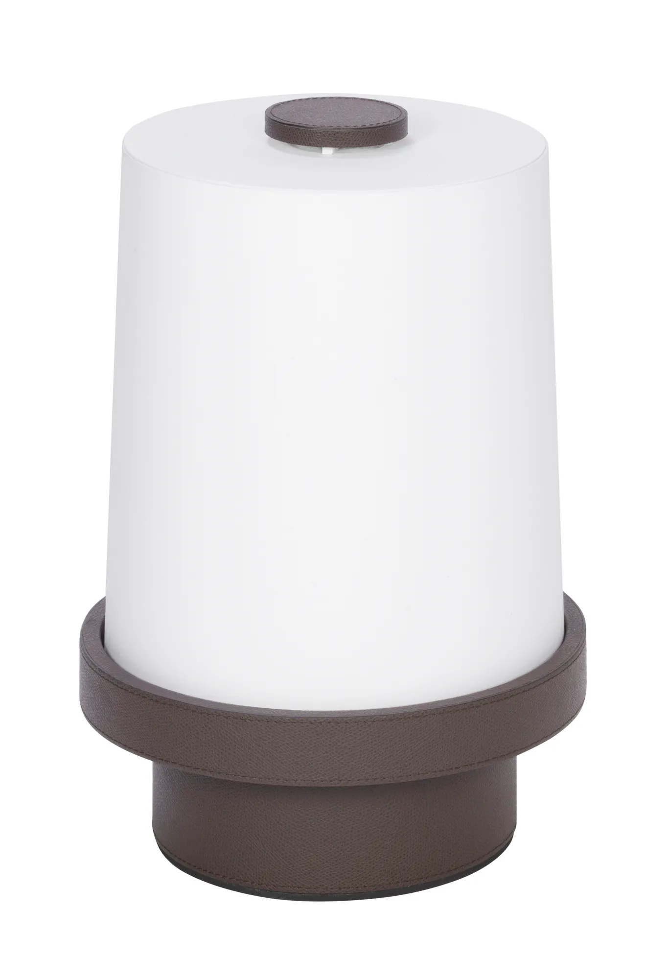 The architectural silhouette of Ligurian lighthouses is translated by Stéphane Parmentier into sculptural table lamps composed of a leather base and a lampshade in cotton fabric.