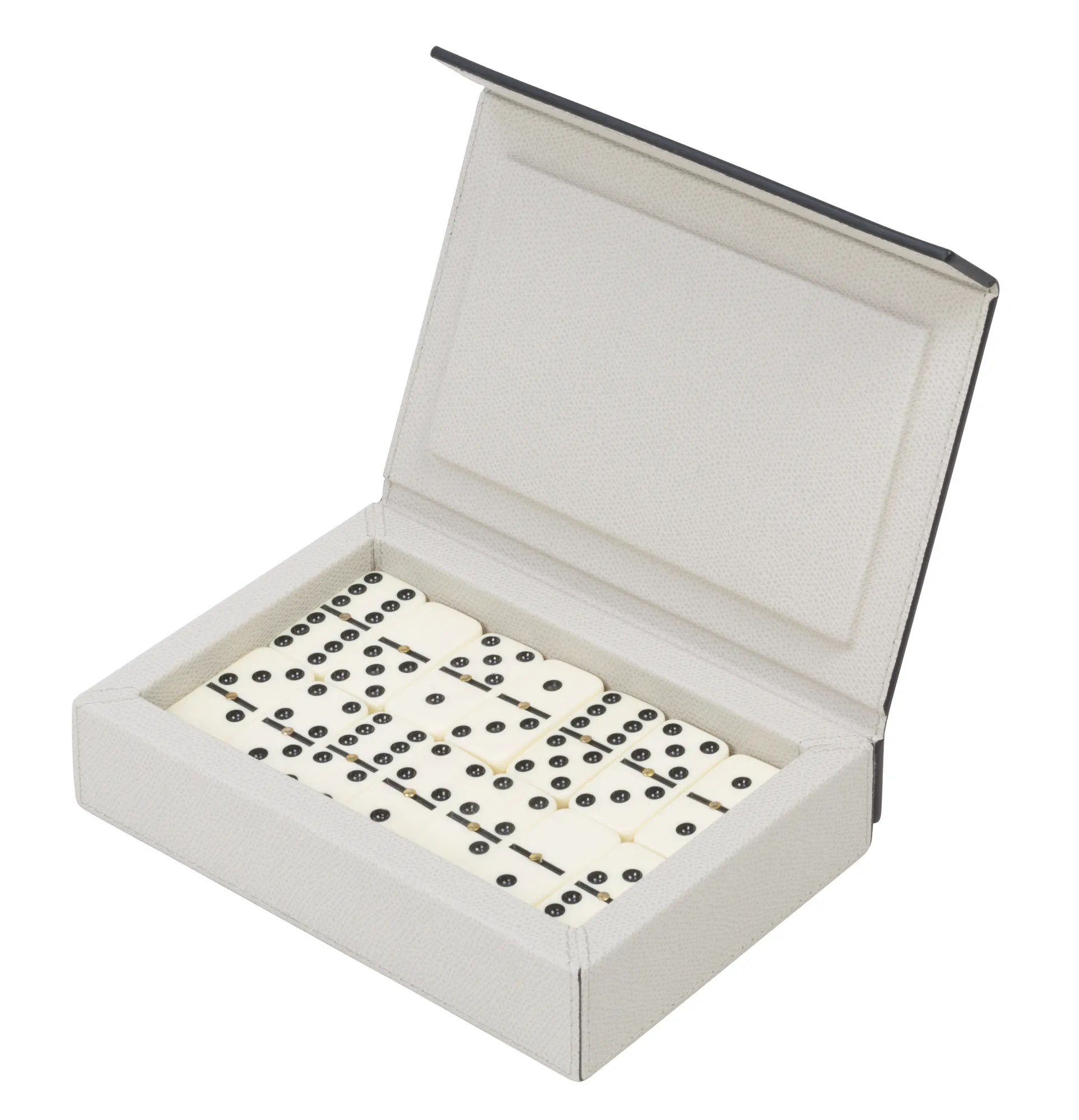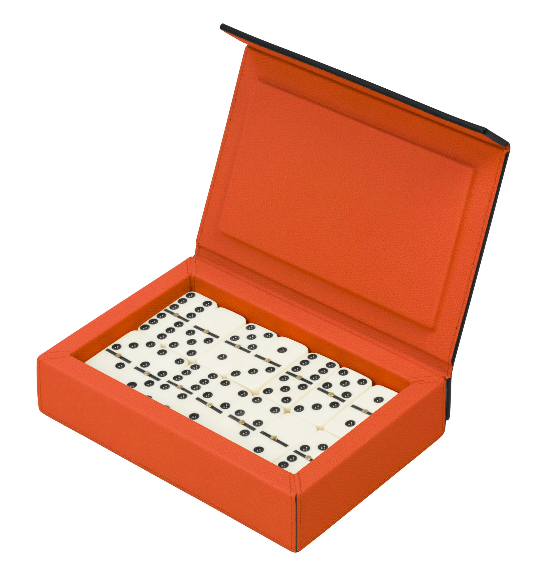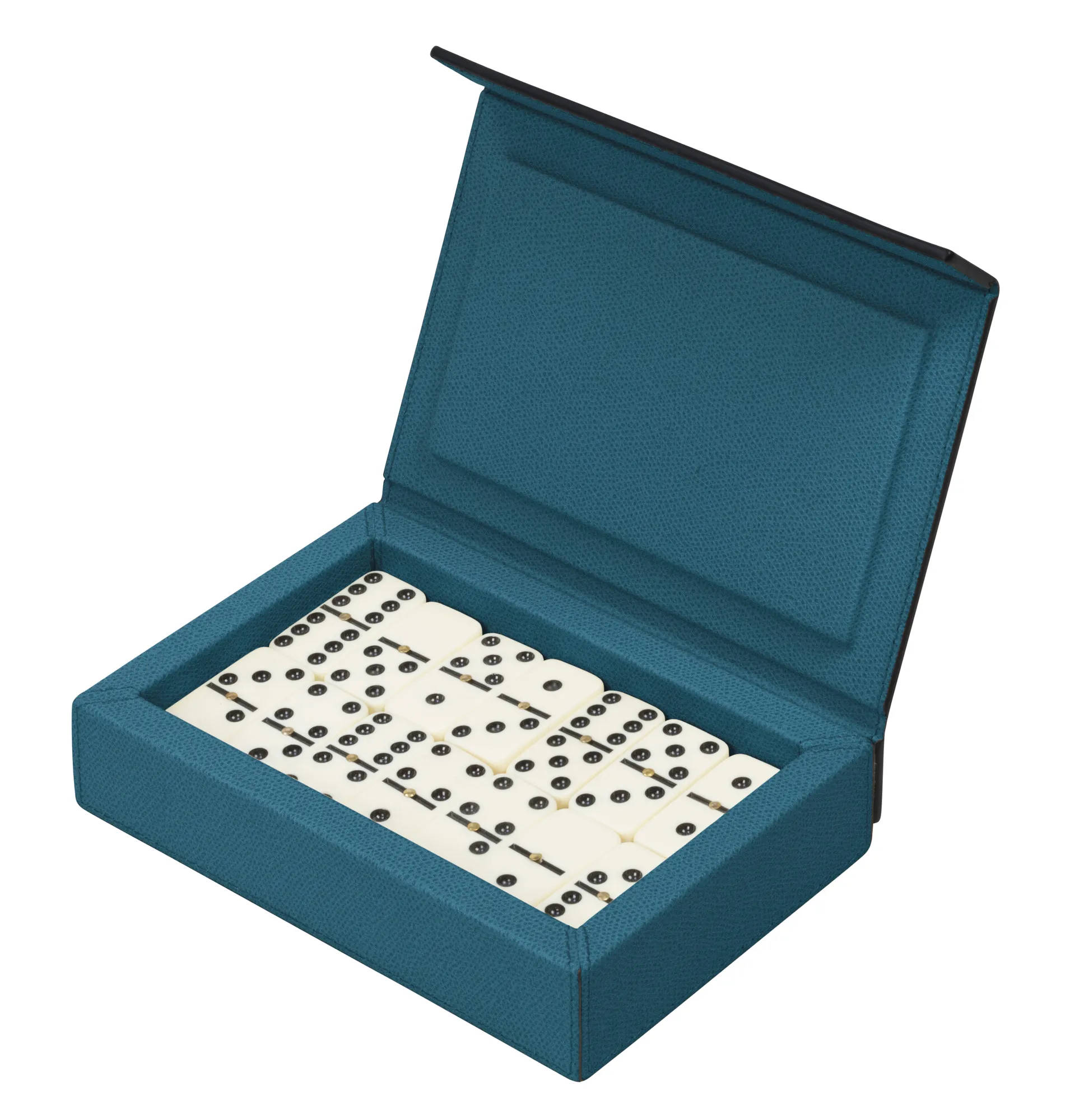 Leather covered wood case with magnetic closing. Includes one set of high quality bakelite dominos. Special decoration made with horsehair and woven. Customizable walnut and leather domino leather.
