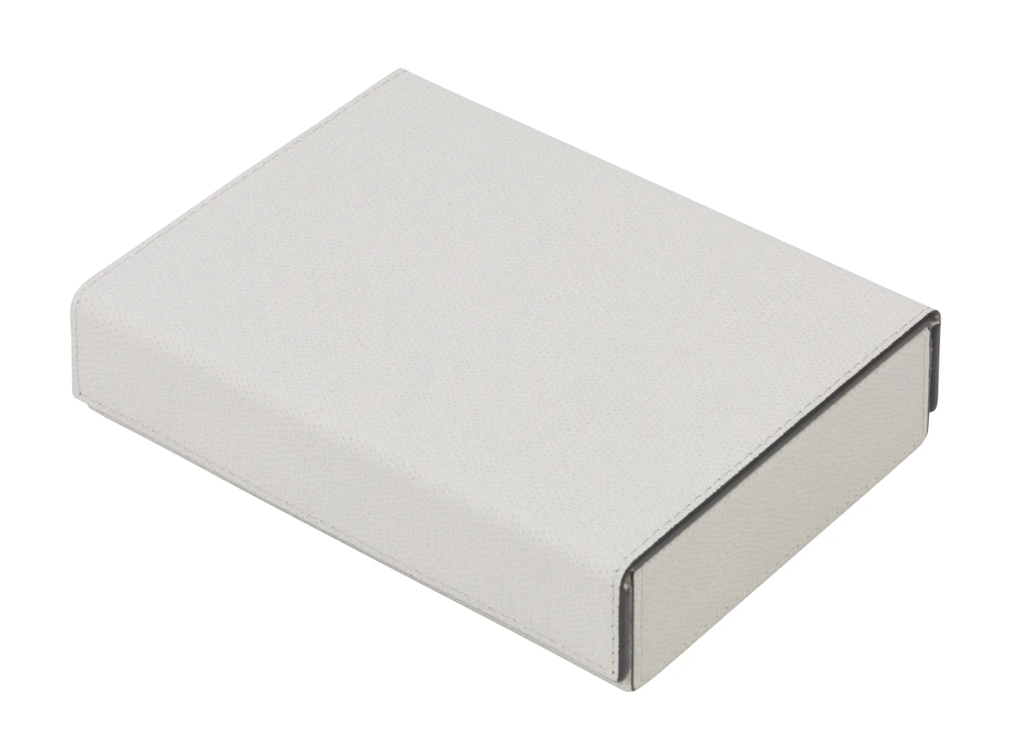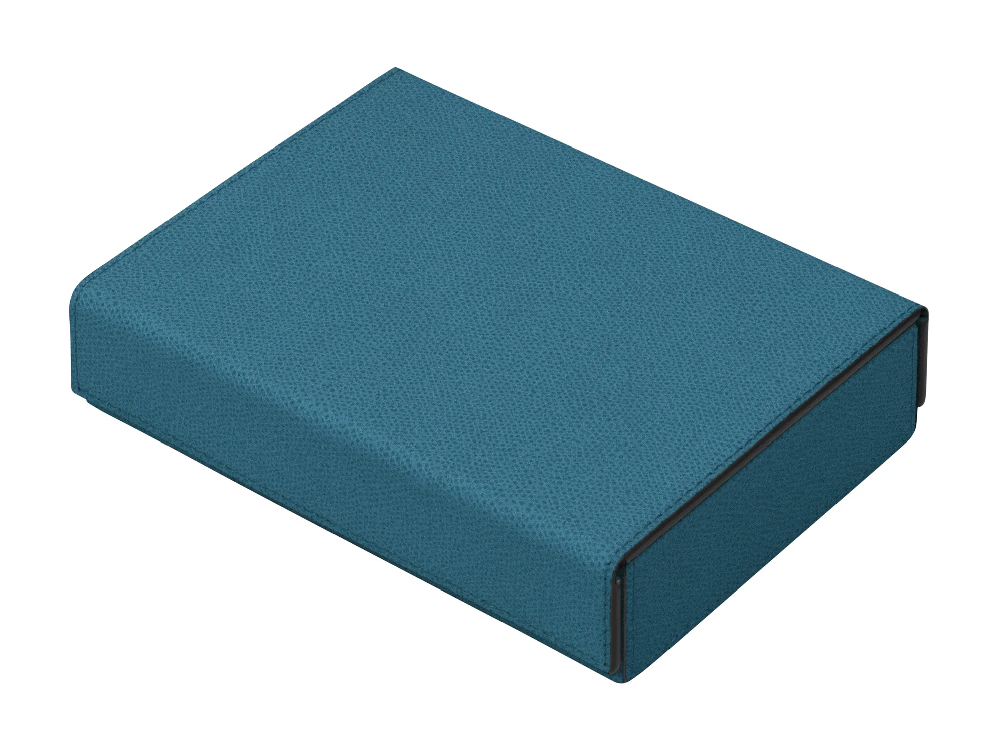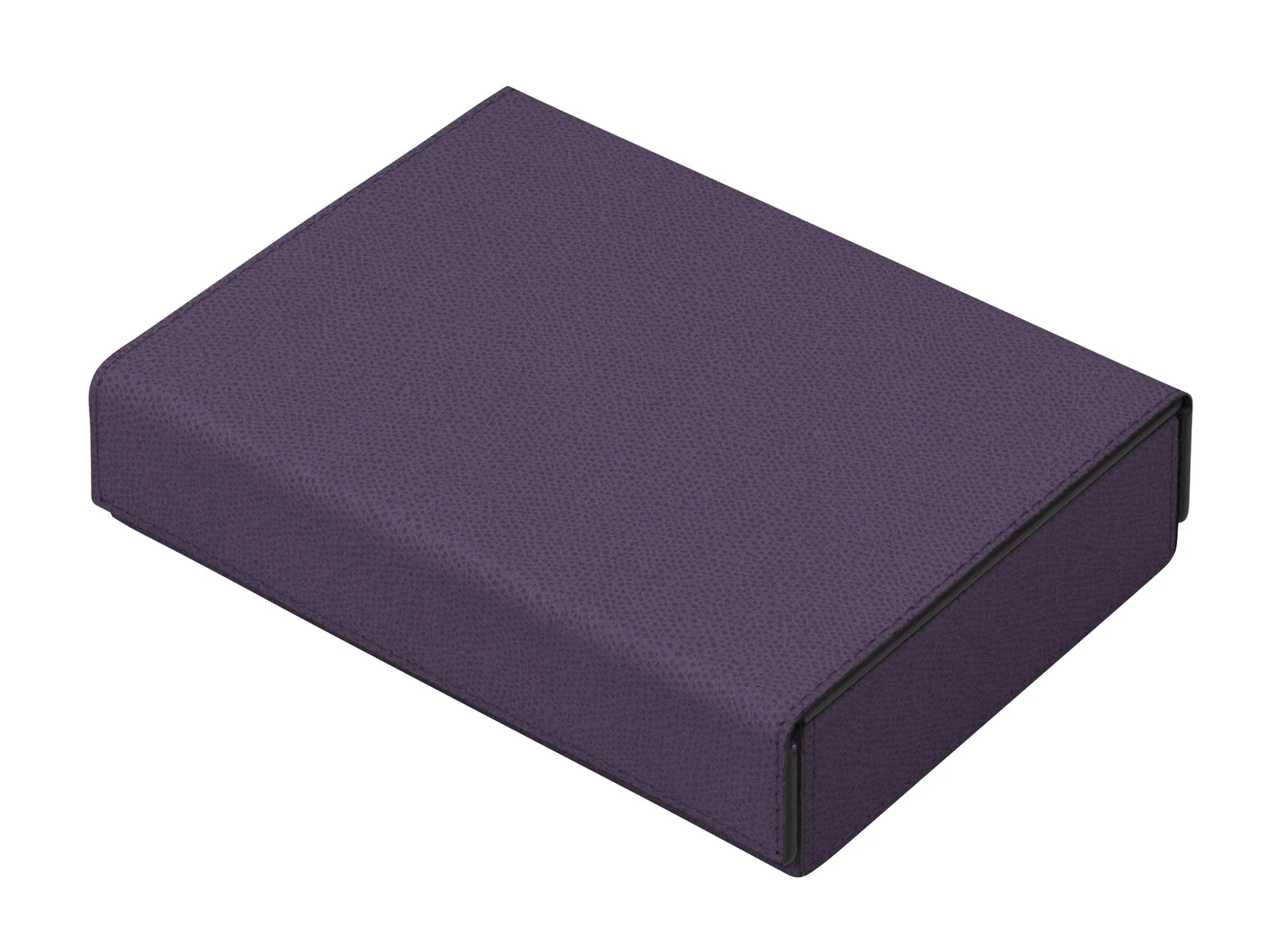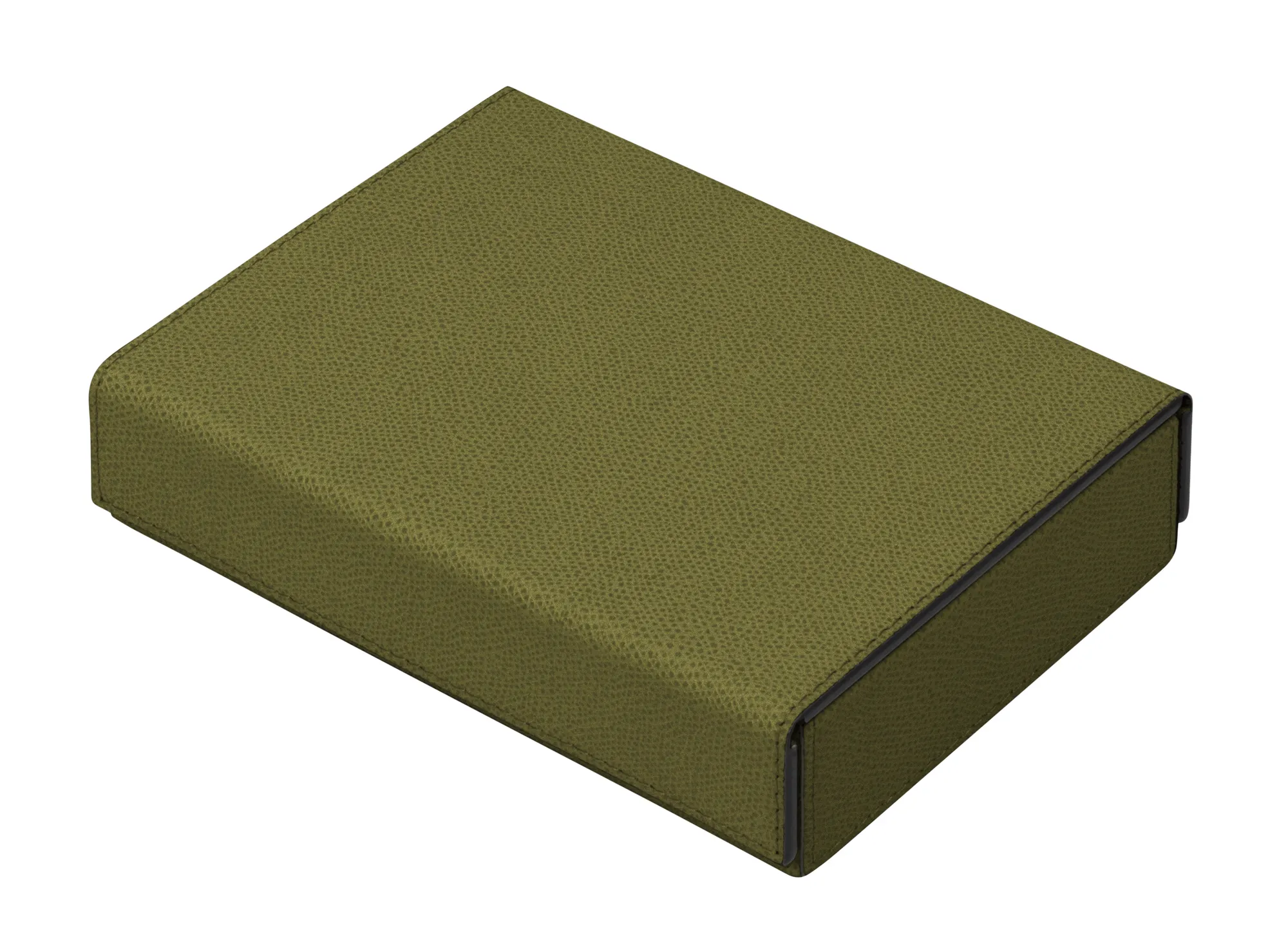 Leather covered wood case with magnetic closing. Includes one set of high quality bakelite dominos. Special decoration made with horsehair and woven. Customizable walnut and leather domino leather.