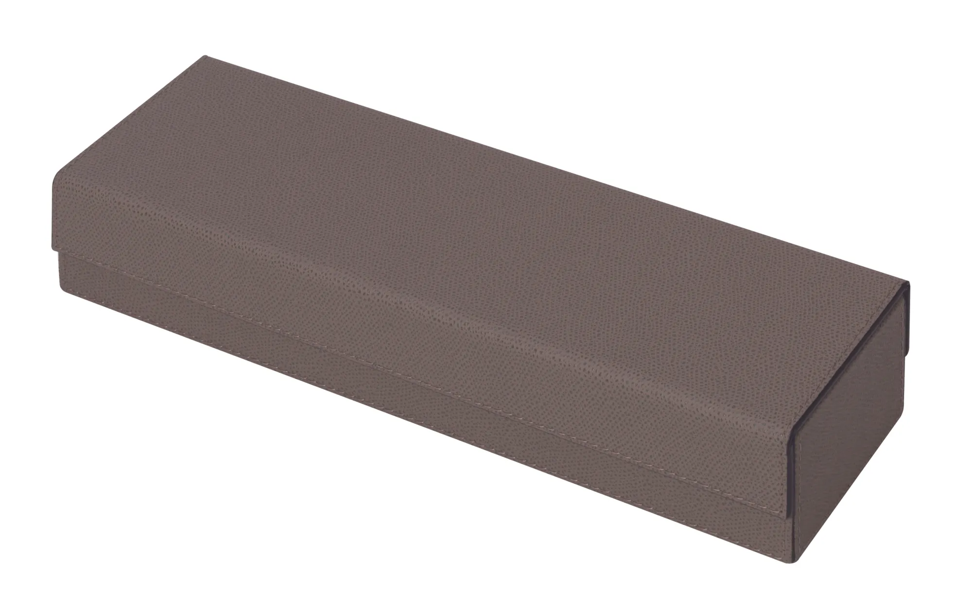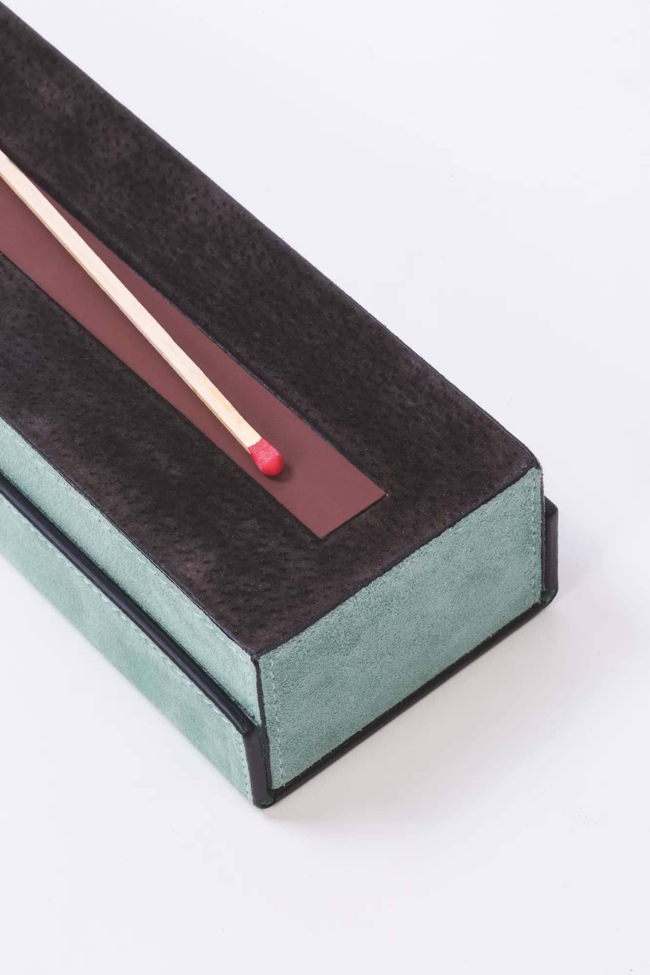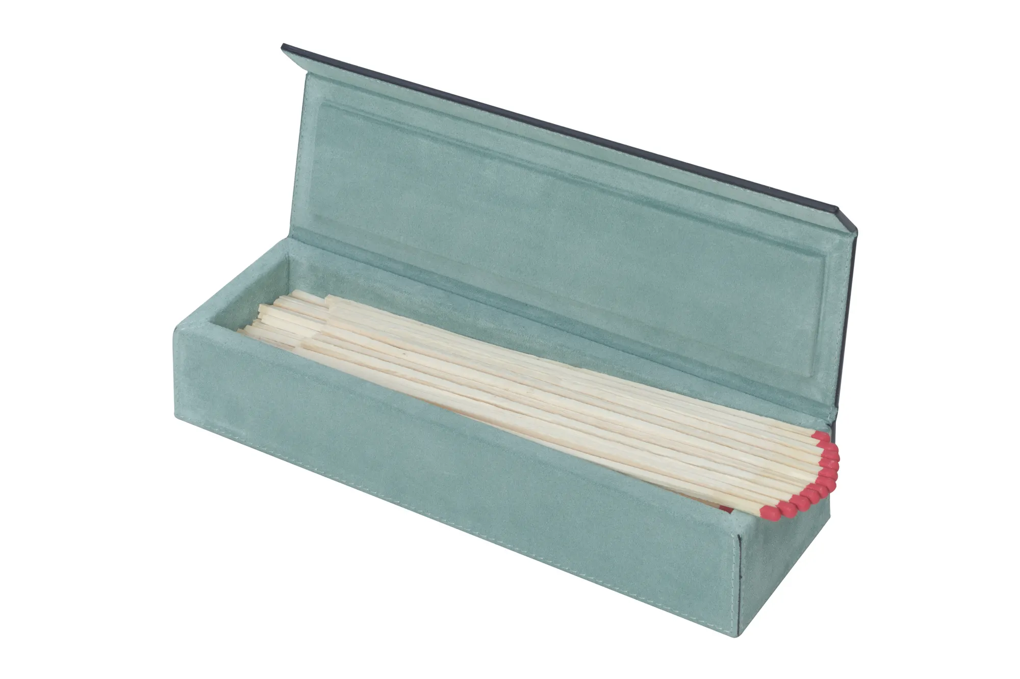 Leather covered wood structure with strike pad at the bottom and magnetic closure. Comes together with suede packaging. 60 matches included.