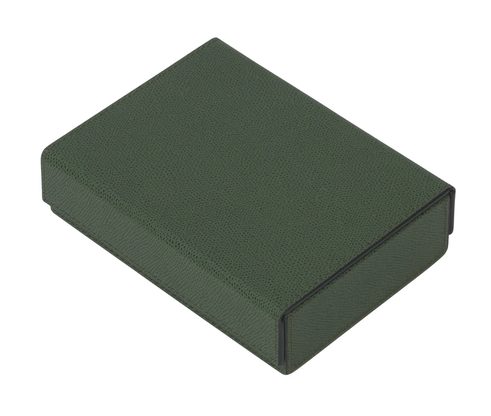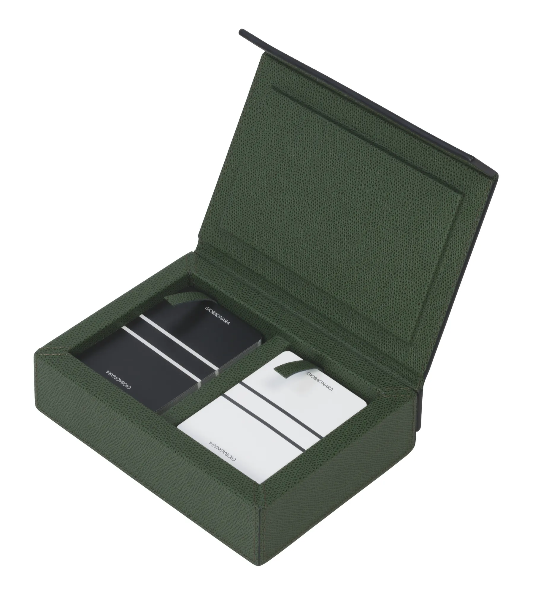 Leather covered wood case with magnetic closing. Includes 2 decks of high quality playing cards.