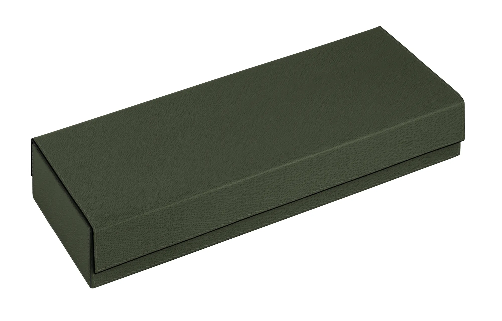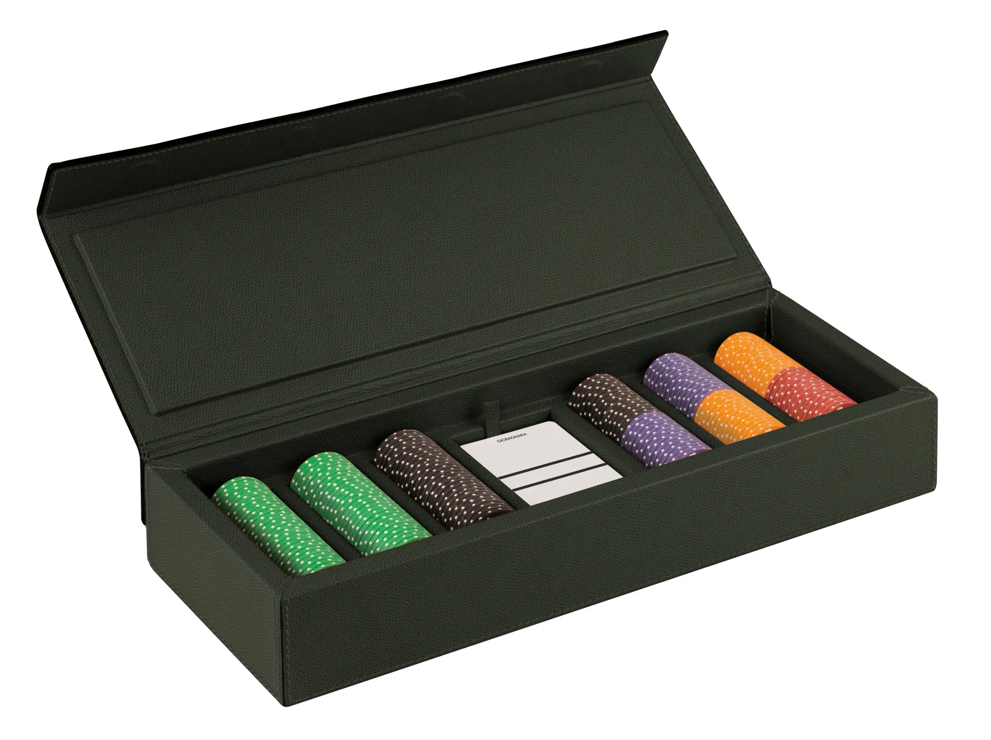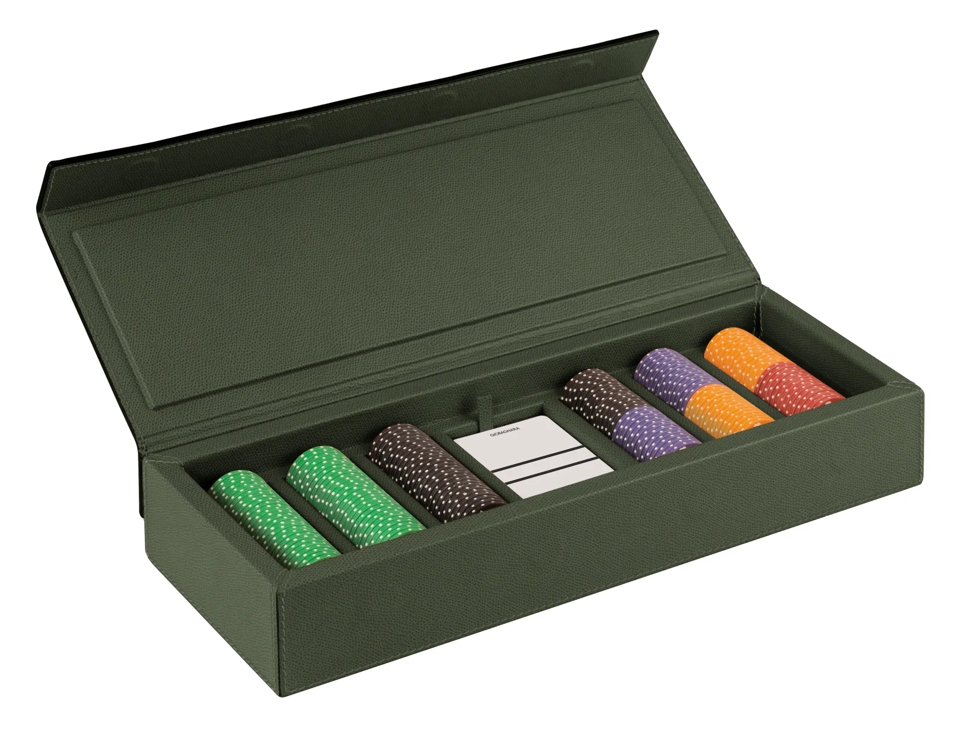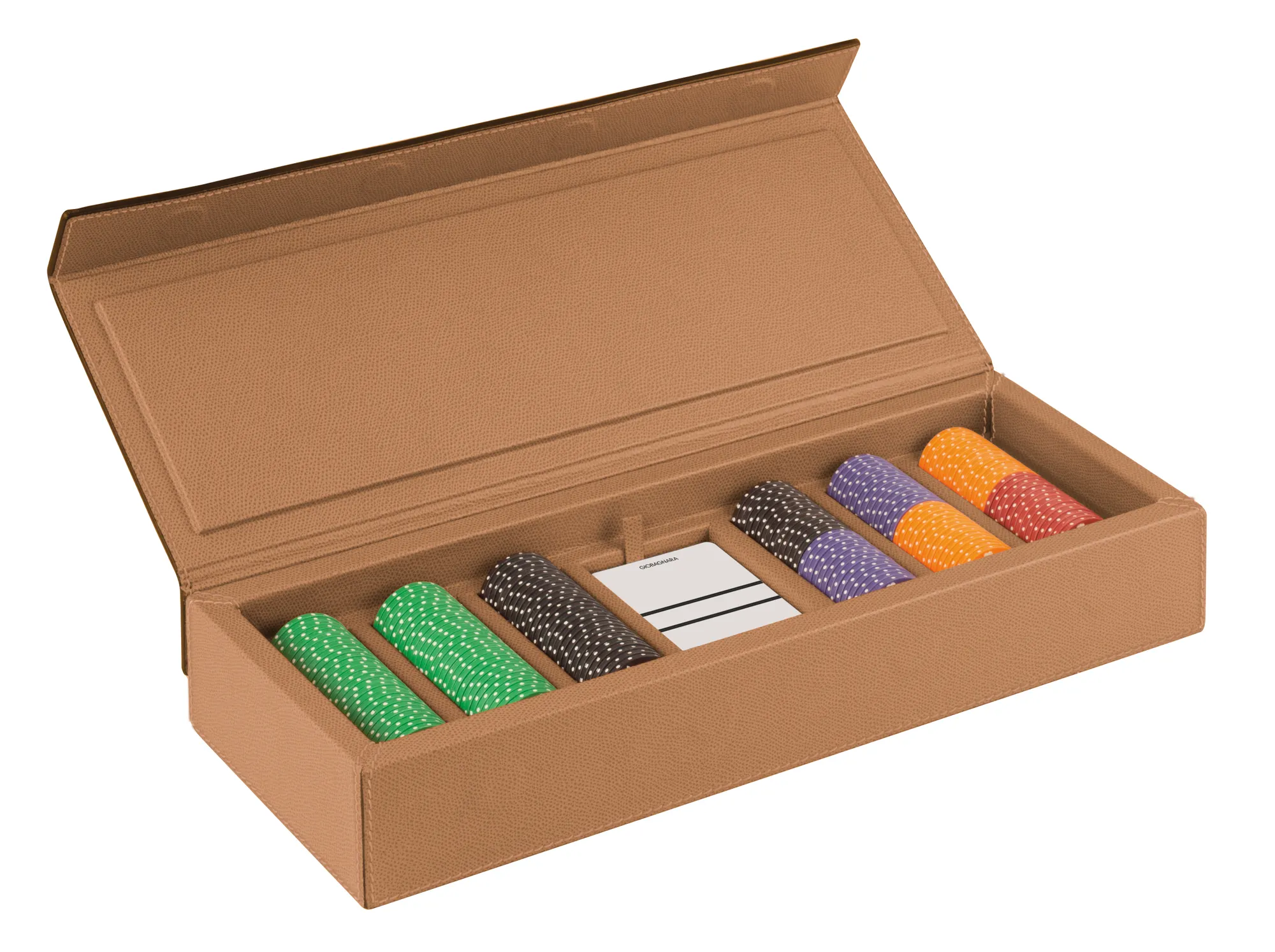 Leather covered wood case with magnetic closing. Includes a deck of high quality playing cards and poker chips with 5 denominations.