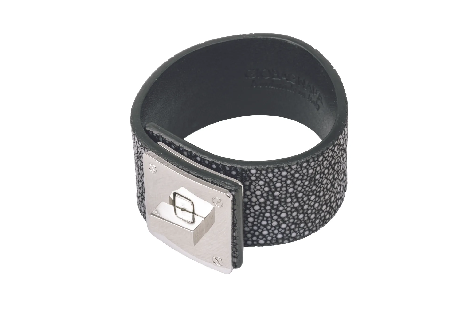 Palladium-plated or gold-plated leather belt bracelet with metal closing. Hypoallergenic. Inner circumference adjustable between 15.5 and 17 cm.